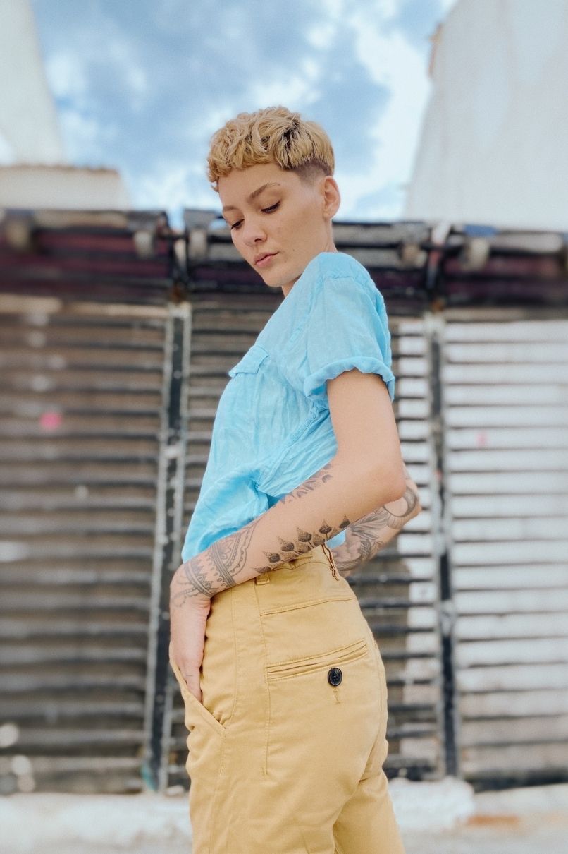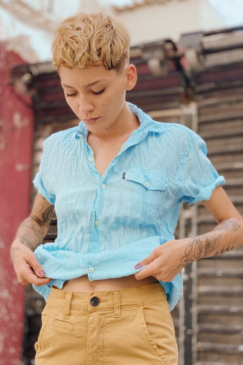 97% algodão, 3% elastano. Costurada com linha 100% algodão e fio de poliéster.
