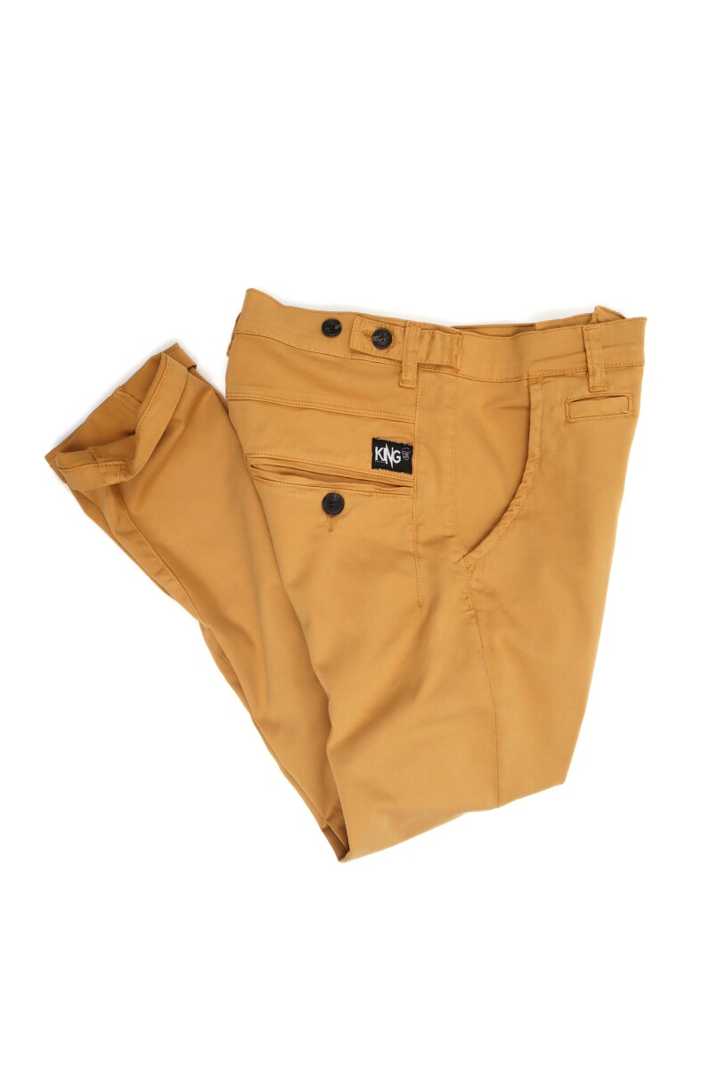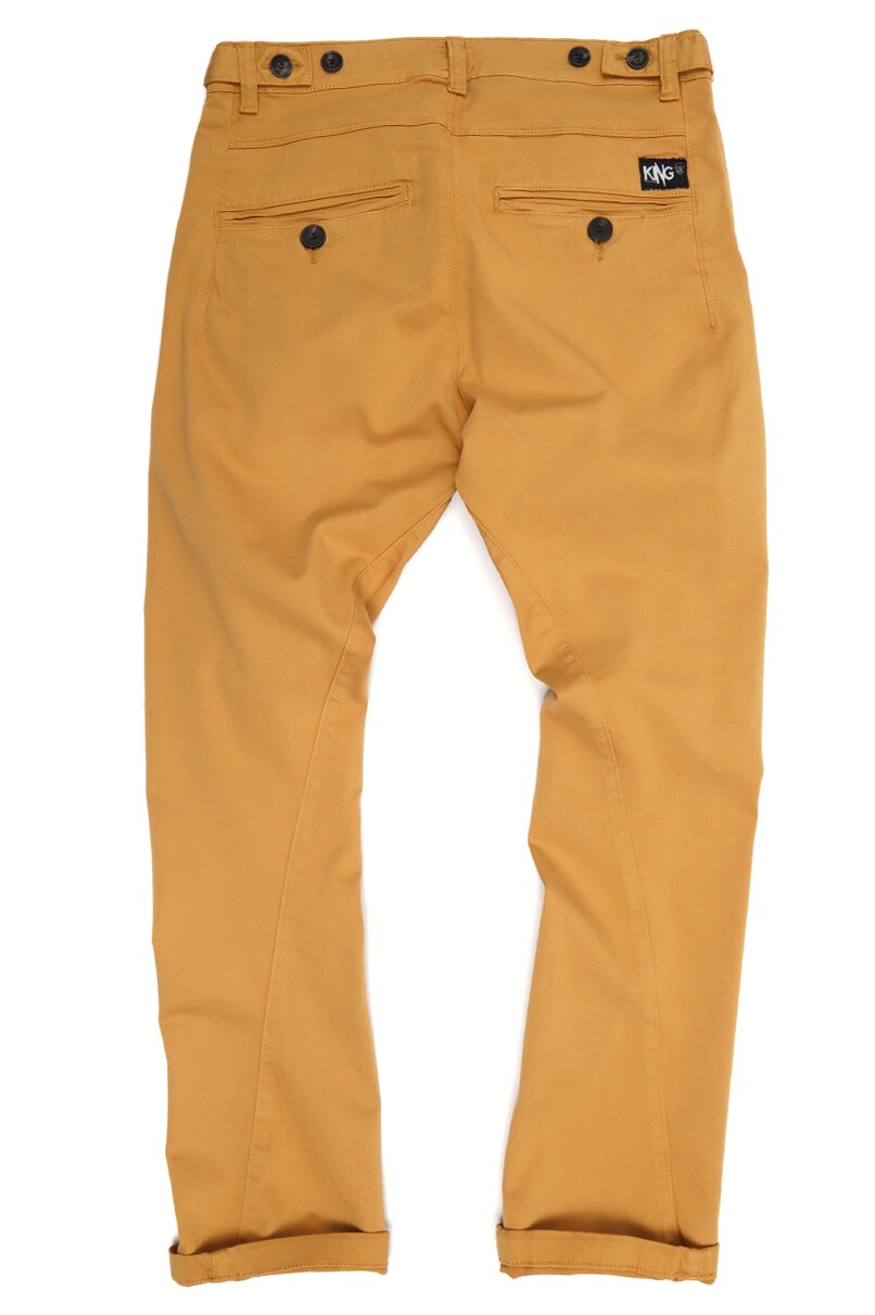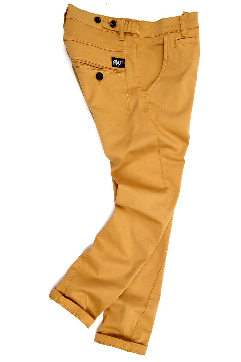 Calça de sarja na cor mostarda, modelo chino colors com fechamento em botões, quinto bolso embutido, reguladores de cós, recortes anatômicos nas pernas e botões personalizados.