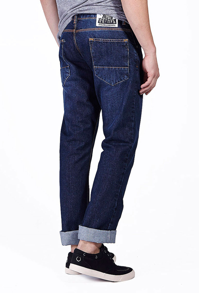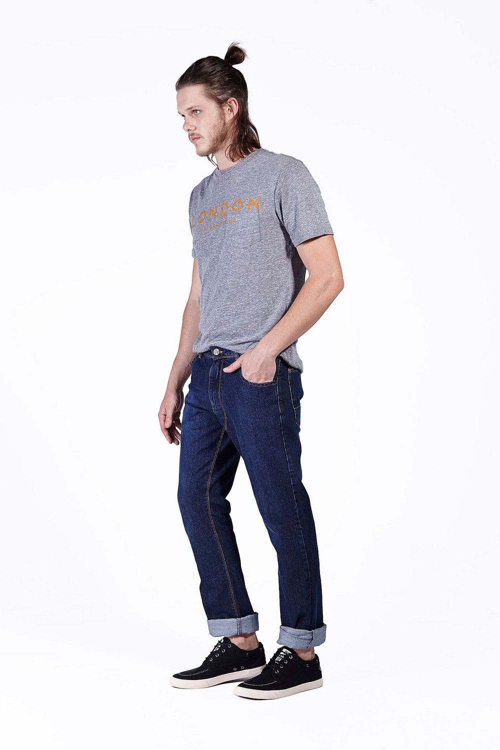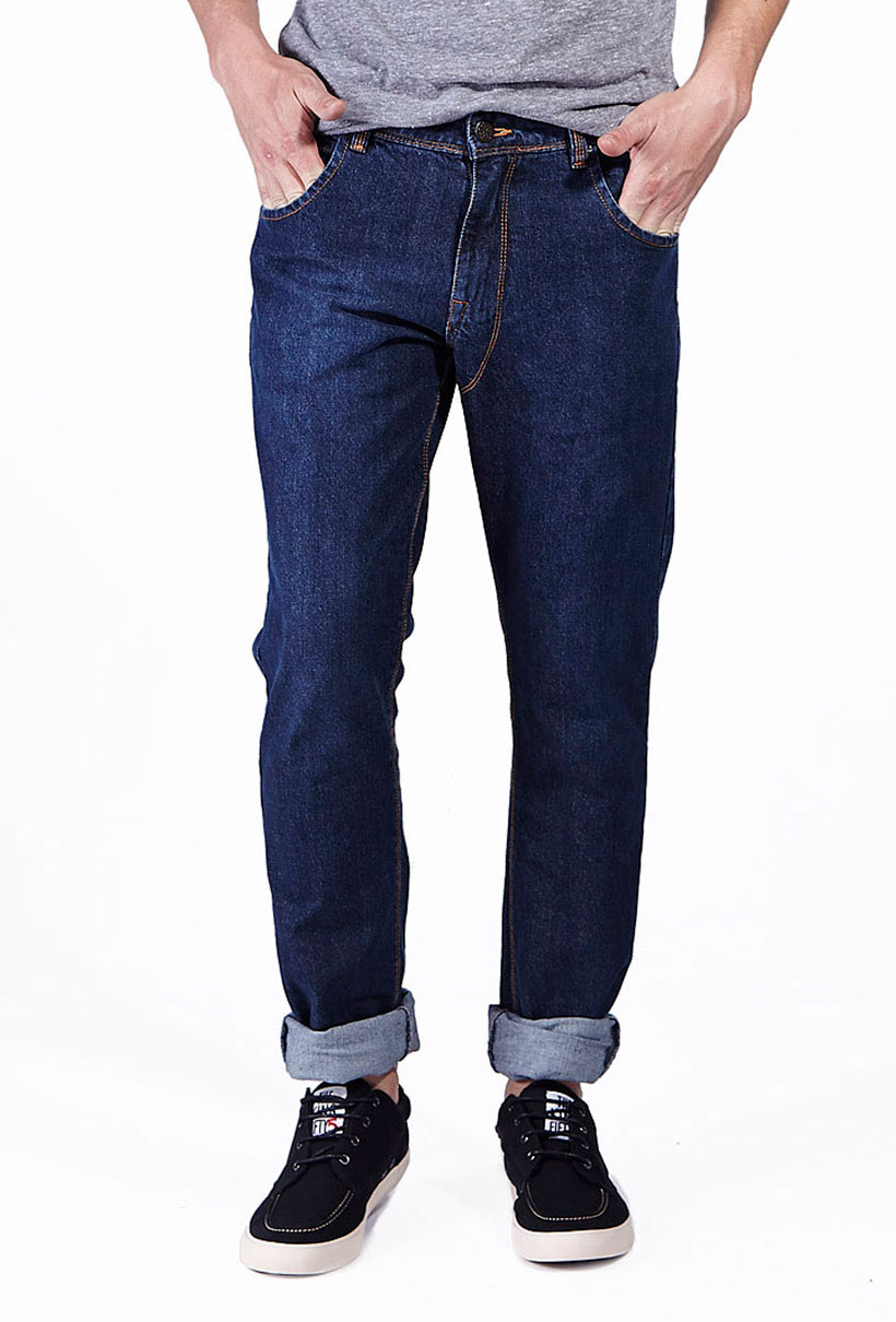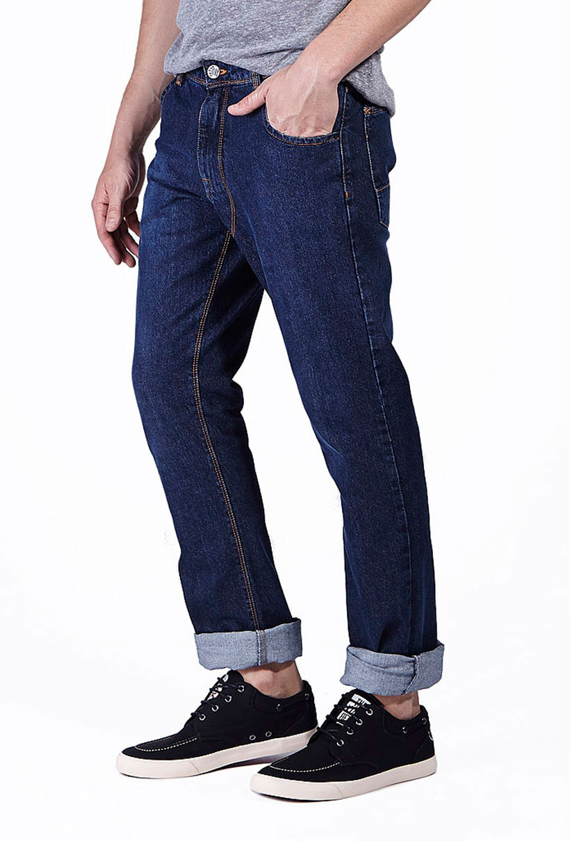 Calça jeans Azul, Modelagem reta, fechamento em Botão e bolsos convencionais.