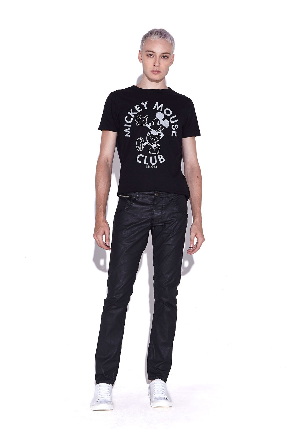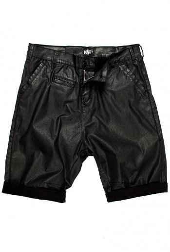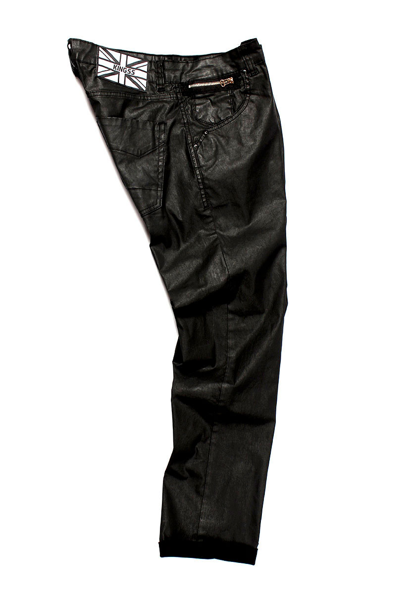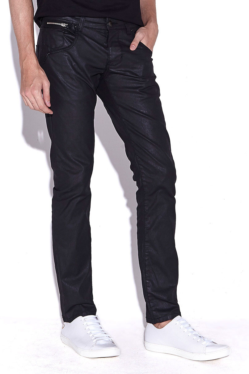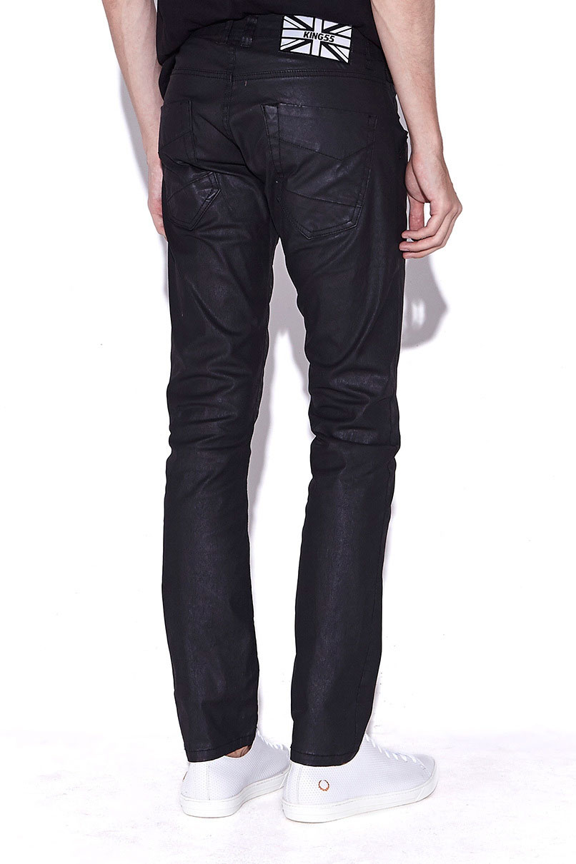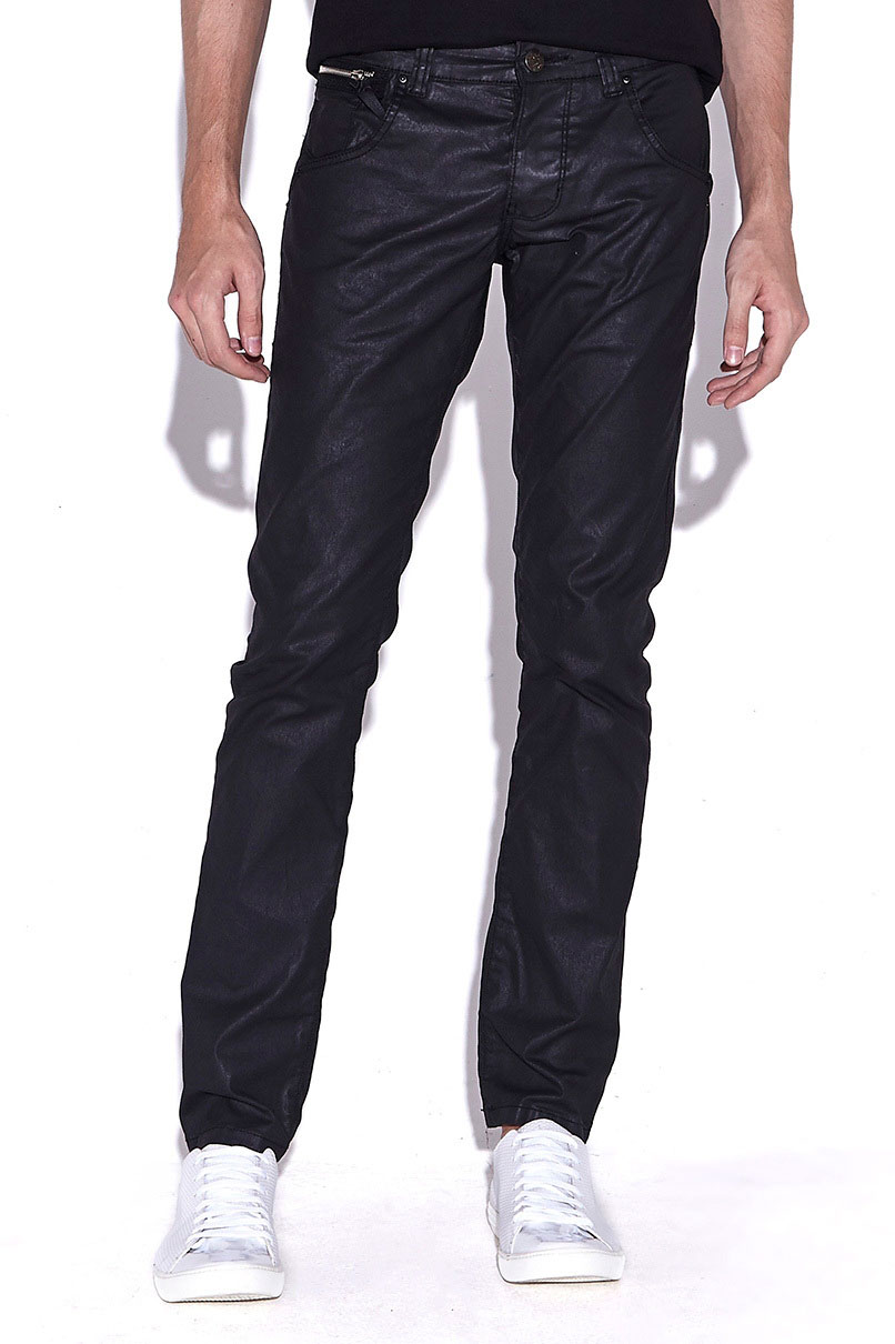 Calça de sarja resinada preta, da um aspecto de resina, Modelagem reta, fechamento em Botão, bolsos convencionais.