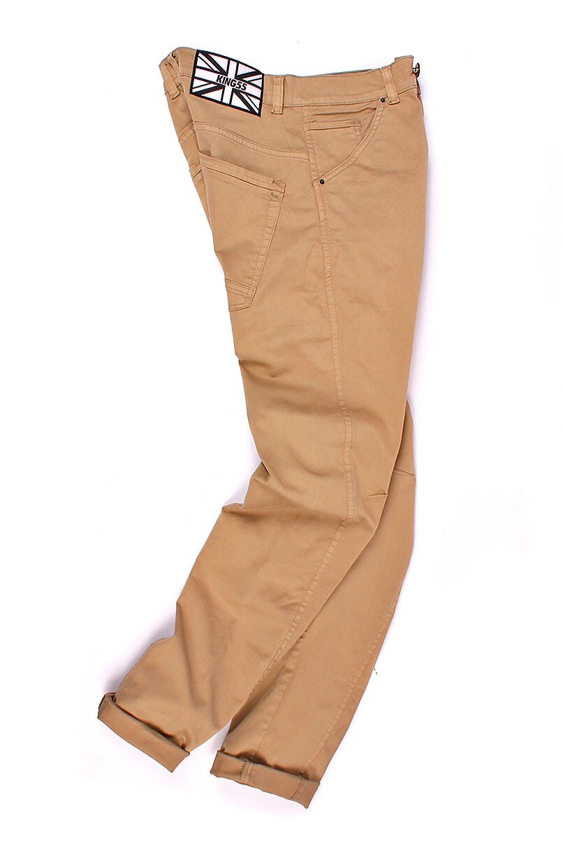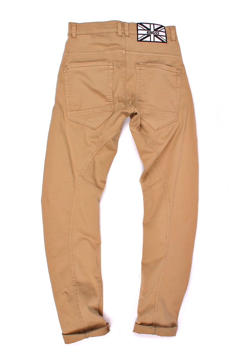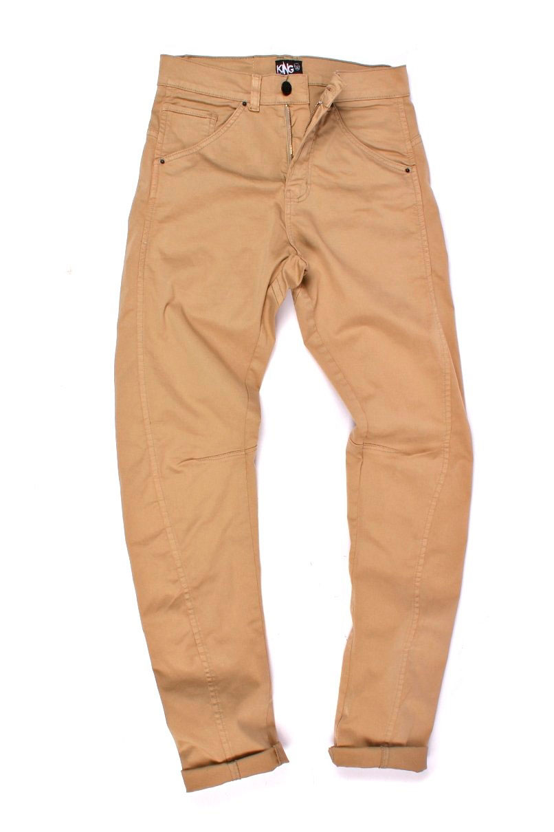 Calça de sarja Bege, modelo Five-pockets, gancho baixo, fechamento em Zíper e Botão.