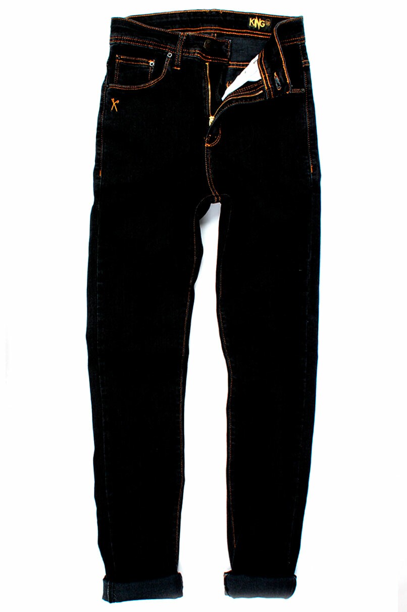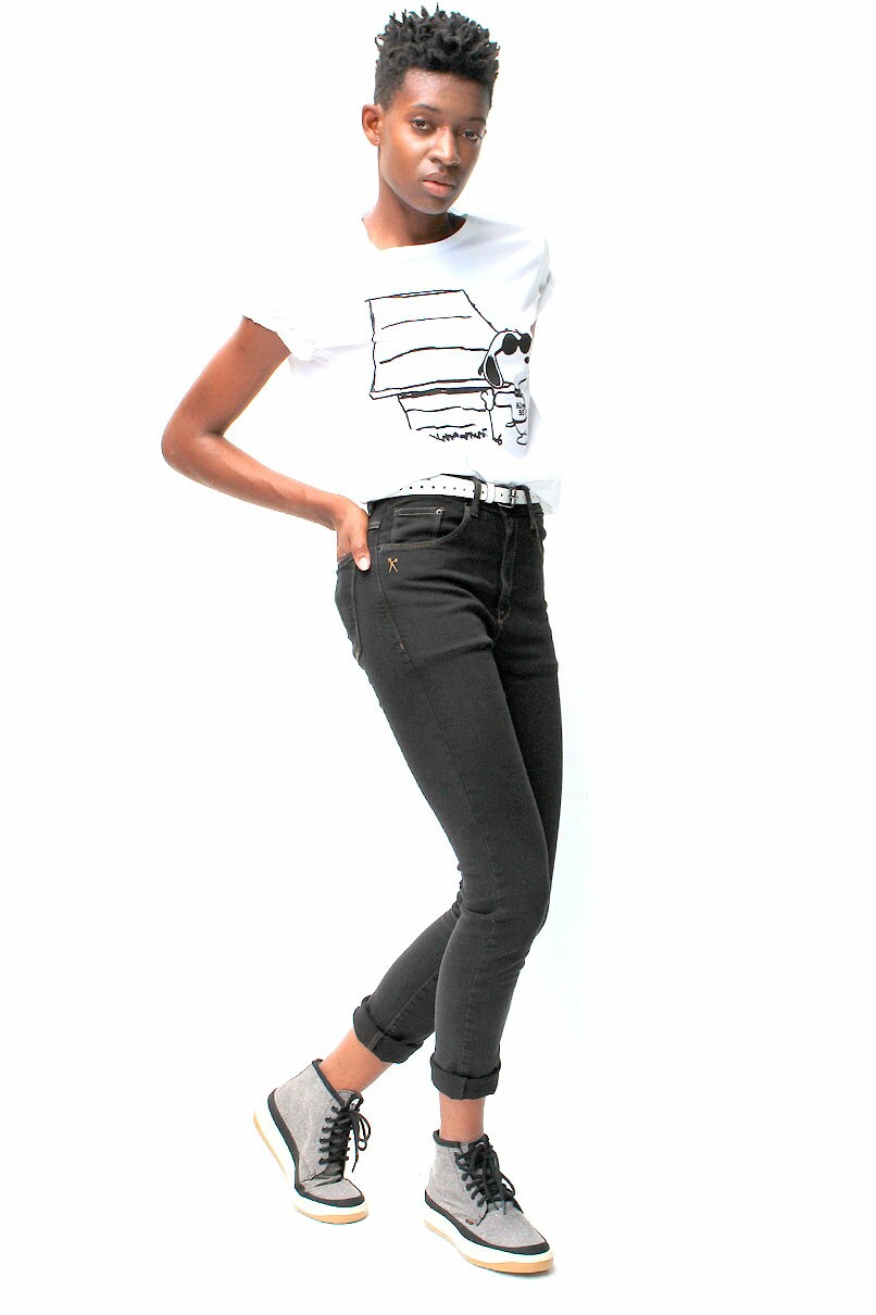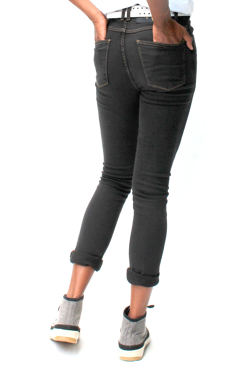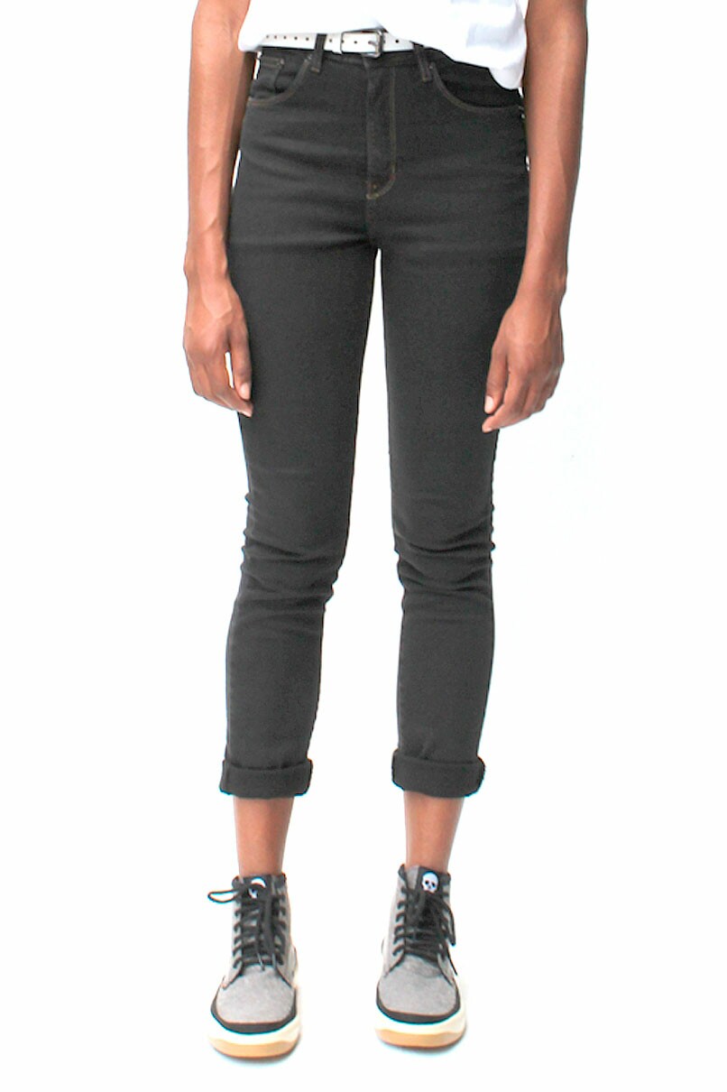 Calça Jeans Escura, modelagem skinny, cintura alta bolsos frontais com um porta-níquel do lado direito, fechamento em zíper e um botão.