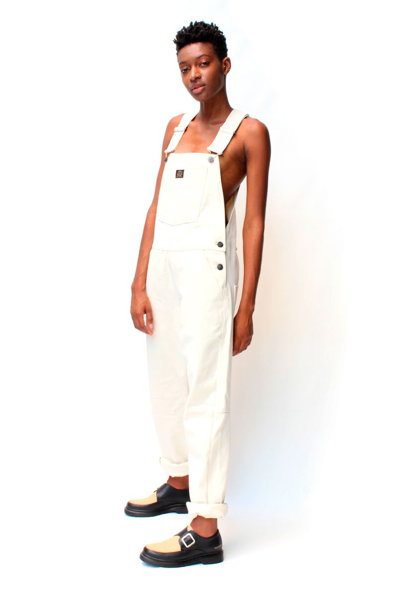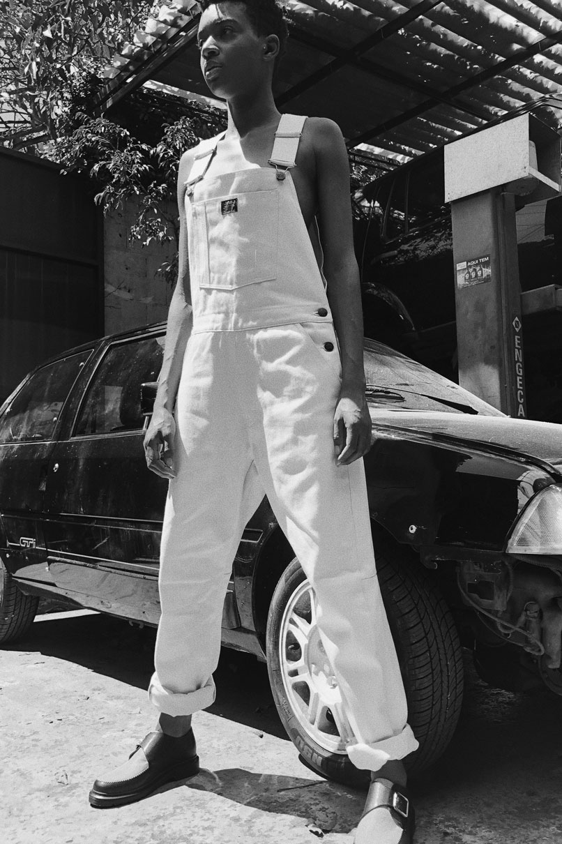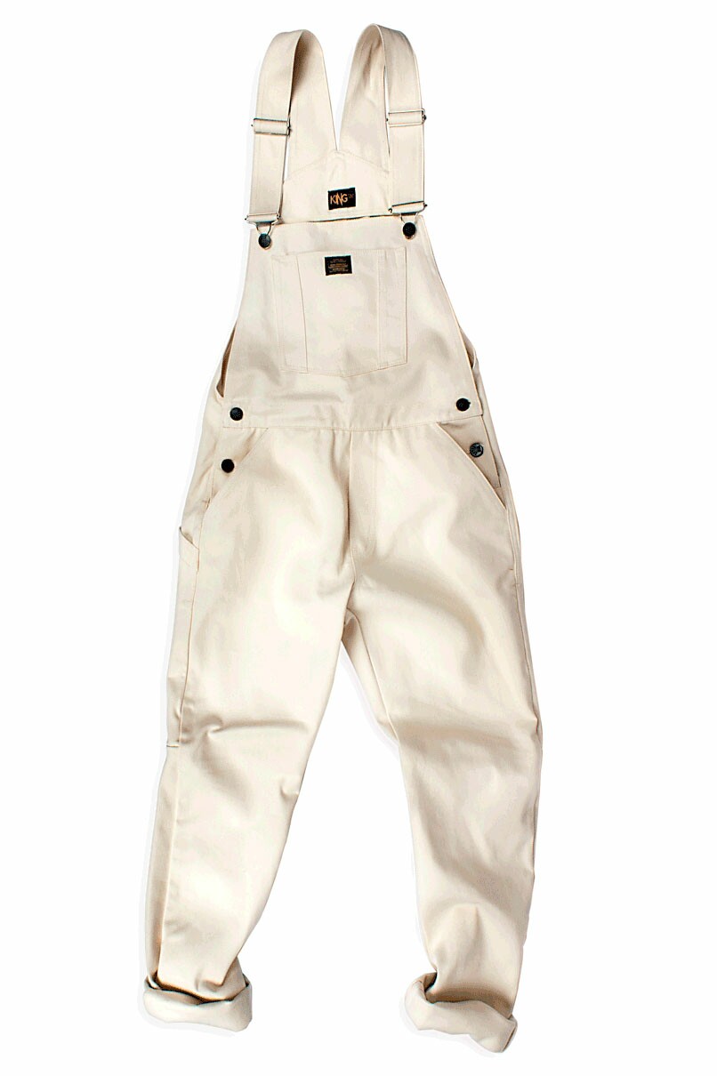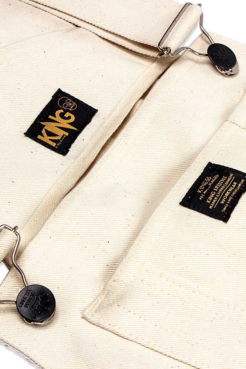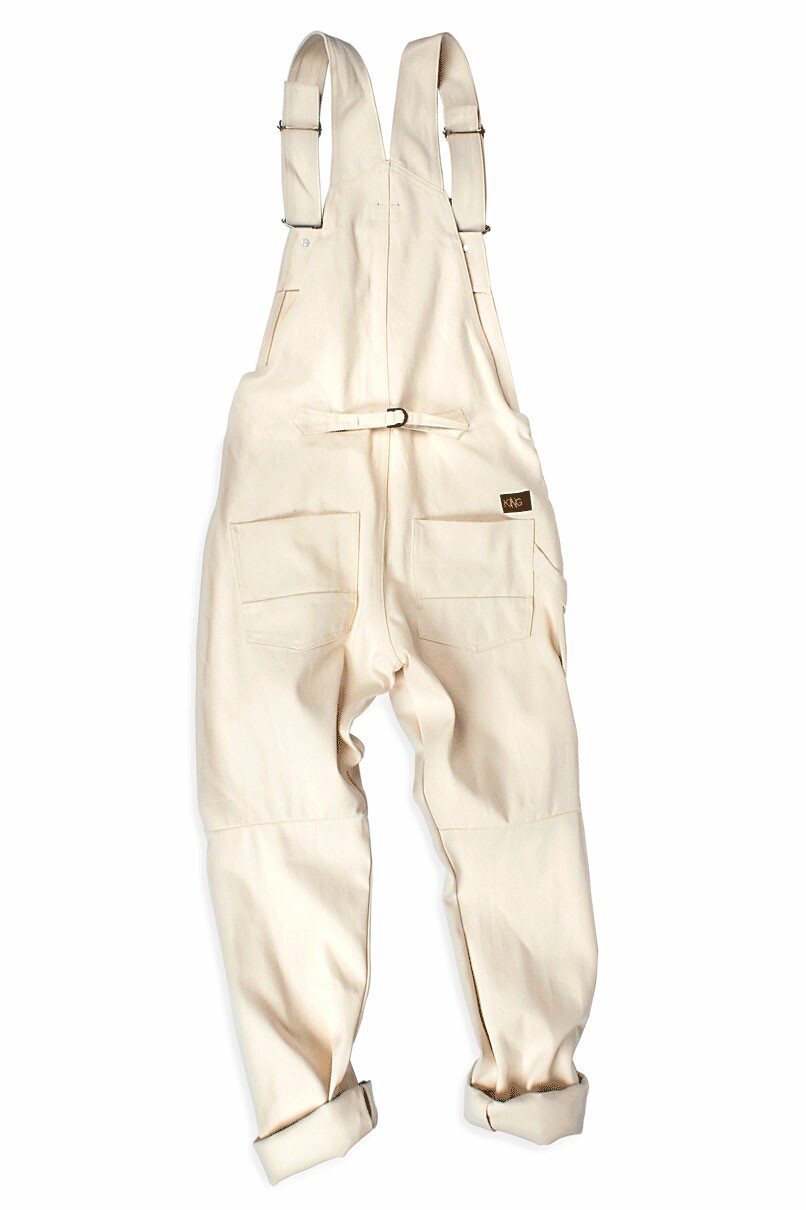 Jardineira White em Sarja, parte frontal possui três bolsos, enquanto a parte traseira tem dois chapados. Fechamento duplo, sendo por dois botões nas laterais e por encaixe nas alças com regulagem.