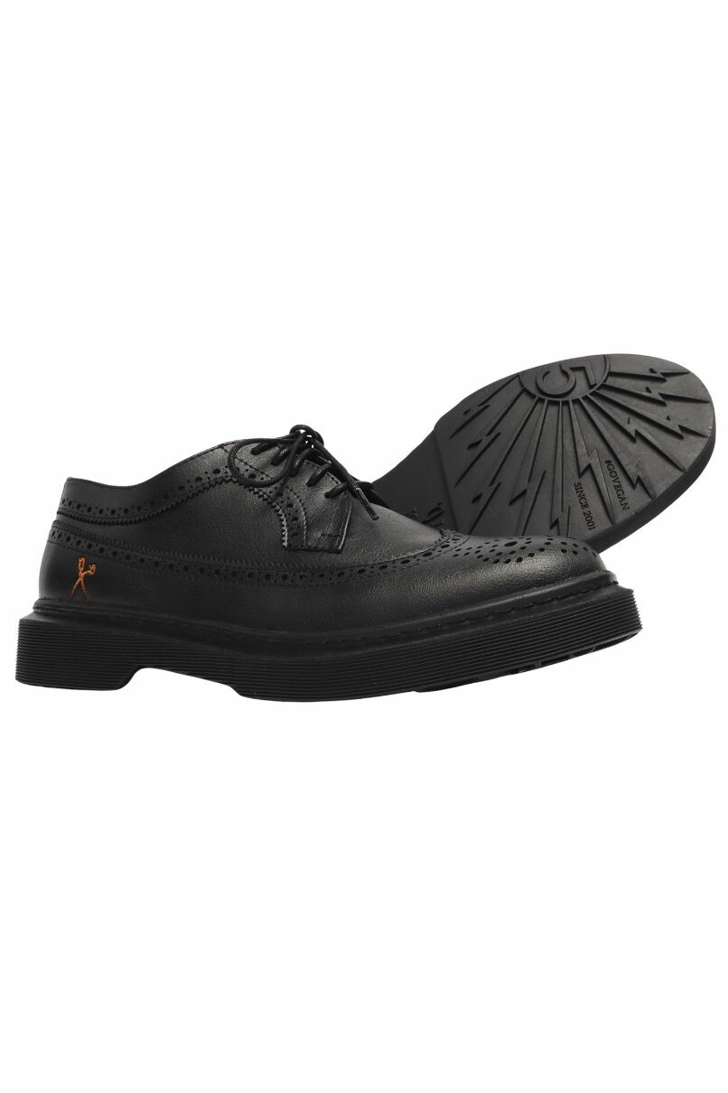 Sapato Brogue Preto, modelo derby é confeccionado em material sintético, 100% livre de Crueldade Animal, o cabedal (parte superior do sapato) é costurado a sola de borracha levemente tratorada. Possui um salto de 2,5 cm e costura de reforço na parte traseira.
