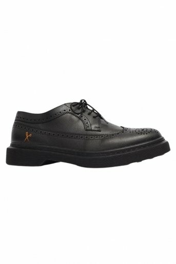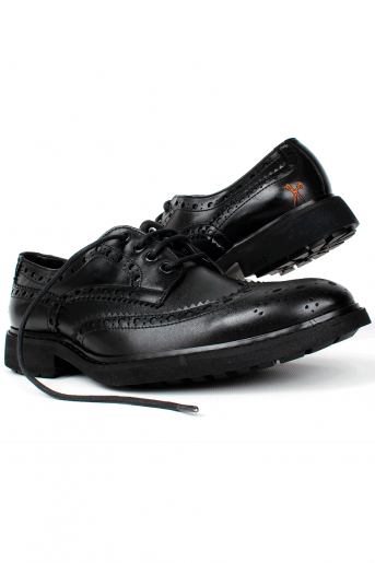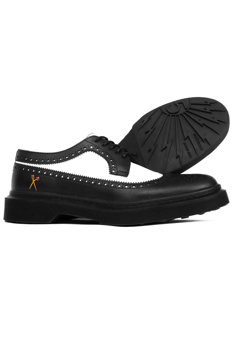 Sapato Brogue Preto e Branco, modelo derby é confeccionado em material sintético, 100% livre de crueldade animal, o cabedal (parte superior do sapato) é costurado e a sola de borracha levemente tratorada. Possui um salto de 2,5 cm e costura de reforço na parte traseira.
