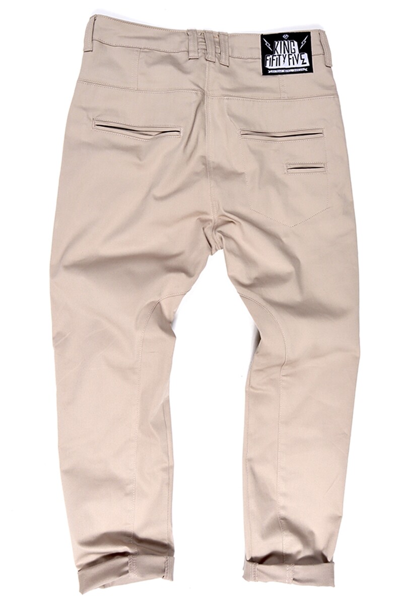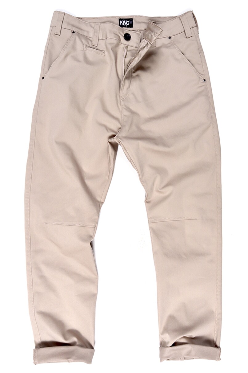 Calça de sarja Kaki, Modelagem chino com bolsos faca, gancho longo e pernas ajustadas.