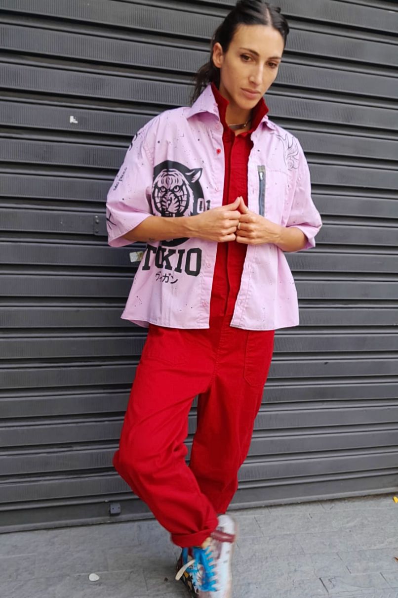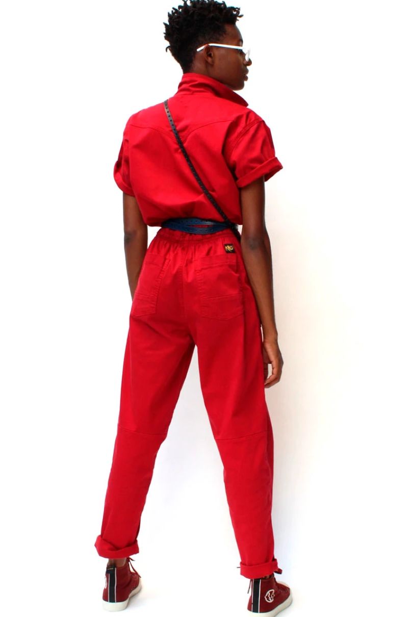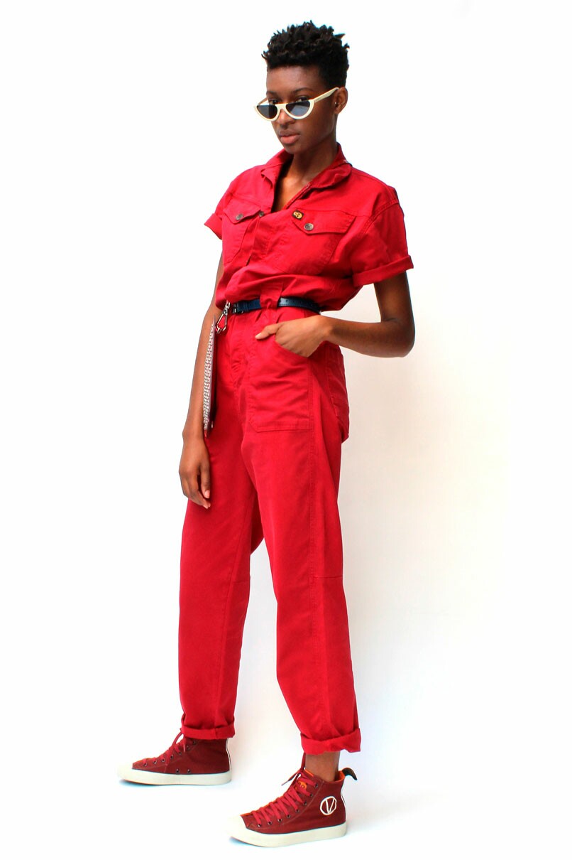 Macacão Estilo Operário Unissex em Sarja Vinho Rosê, com fechamento frontal em botão, bolsos frontais e traseiros.