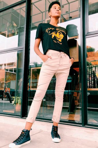 Confeccionada em sarja 98% algodão e 2% Elastano;