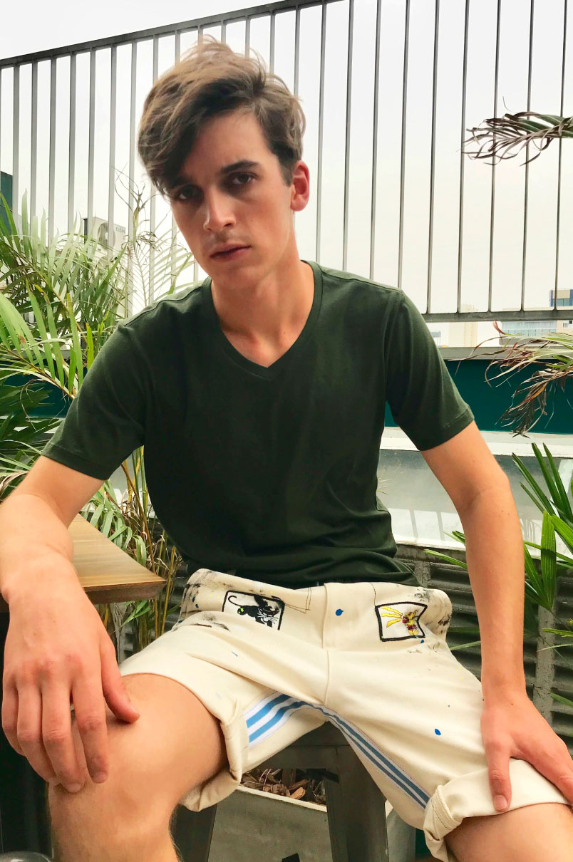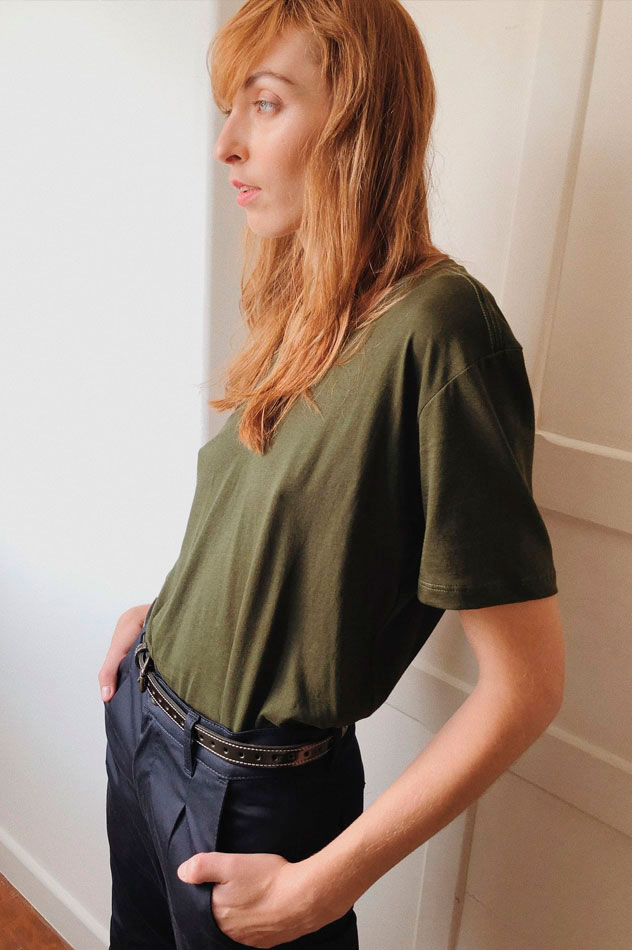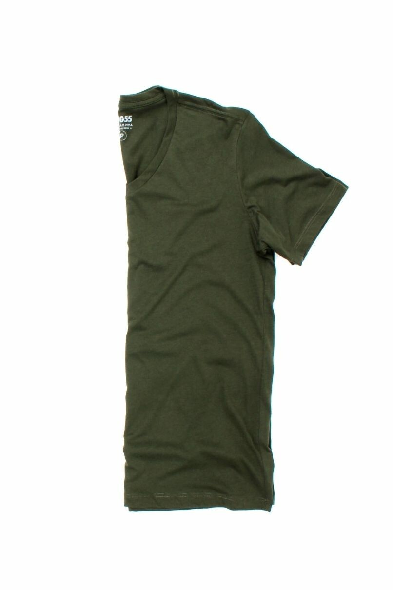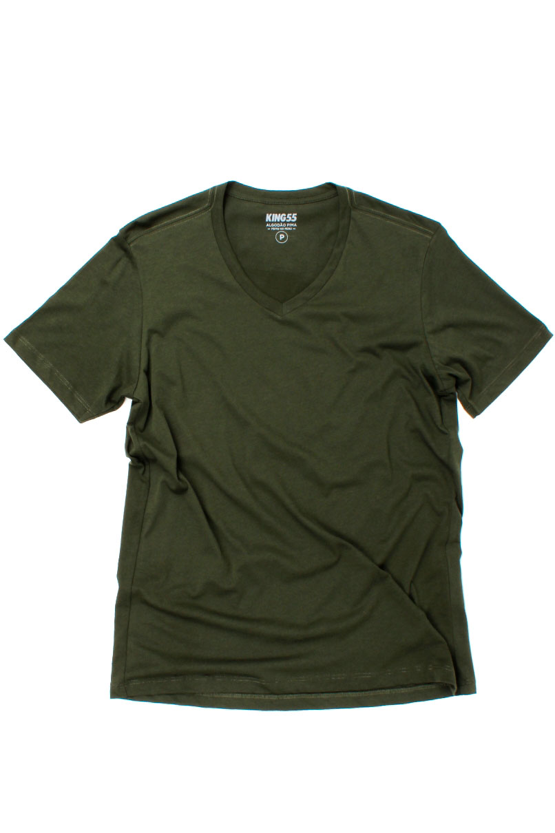 Camiseta Verde Lisa Gola "V", Vegana desenhada no Brasil, confeccionada no Peru, modelagem slim gola "V".