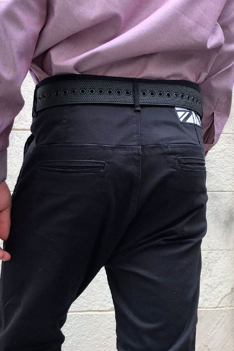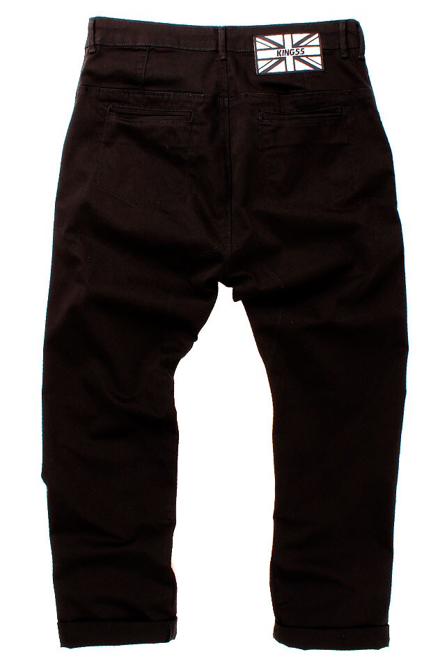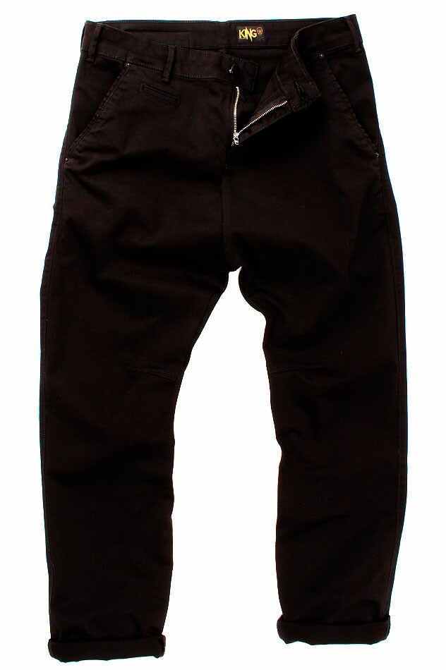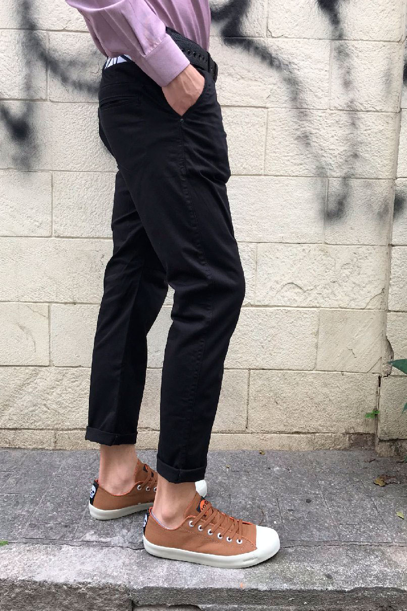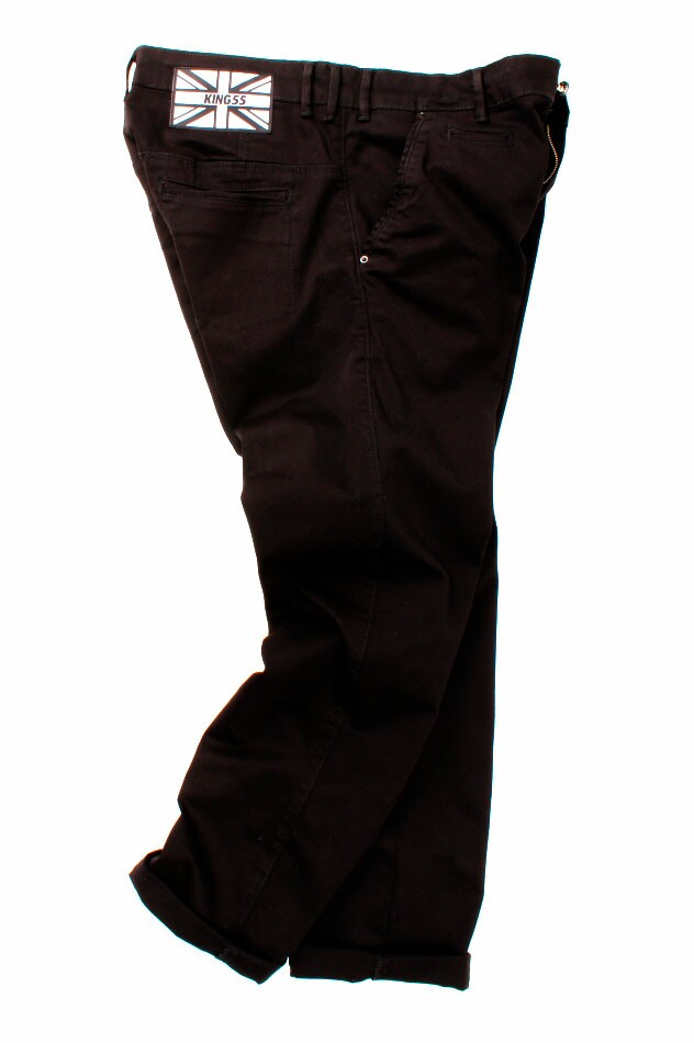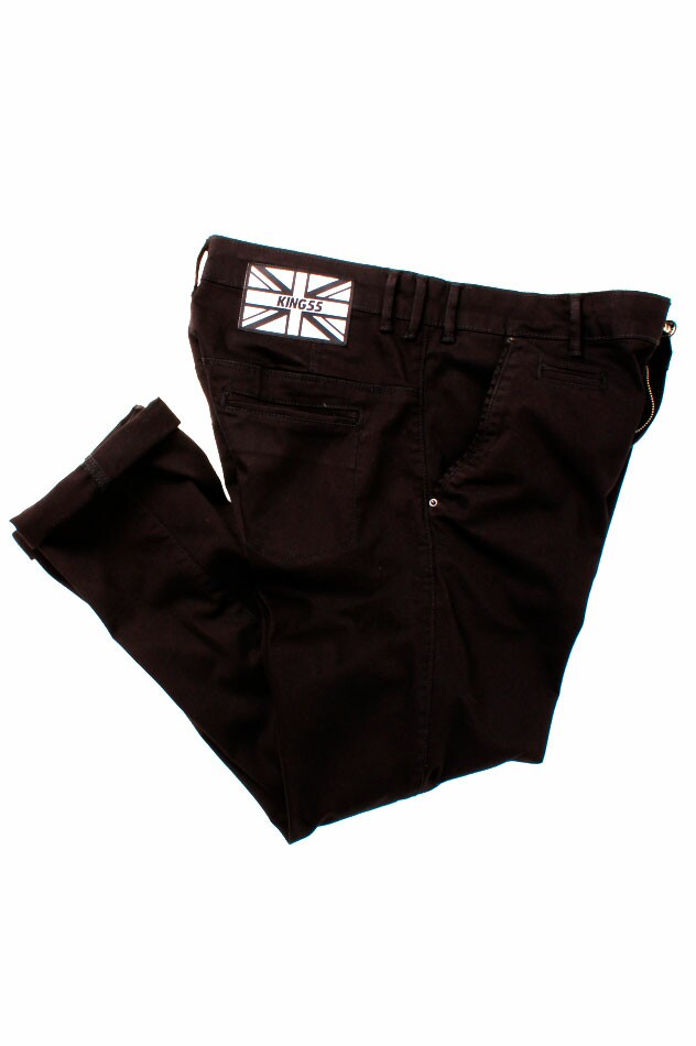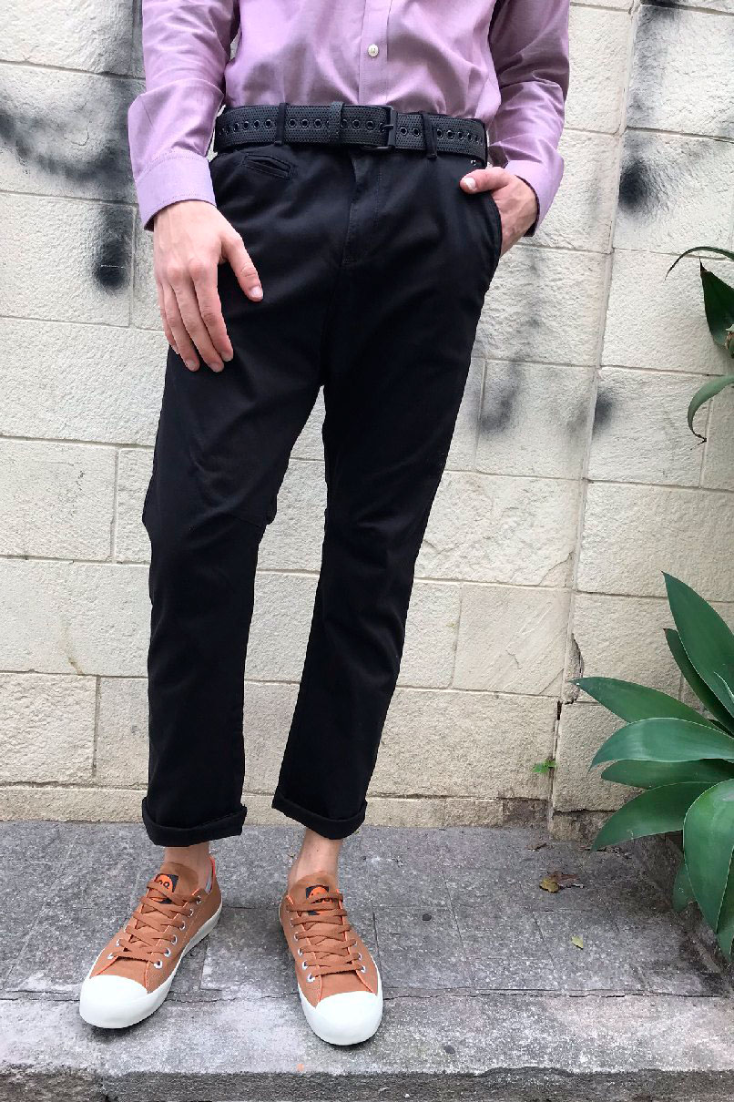 Calça de sarja Preta, Modelagem chino com bolsos faca, gancho longo e pernas ajustadas.