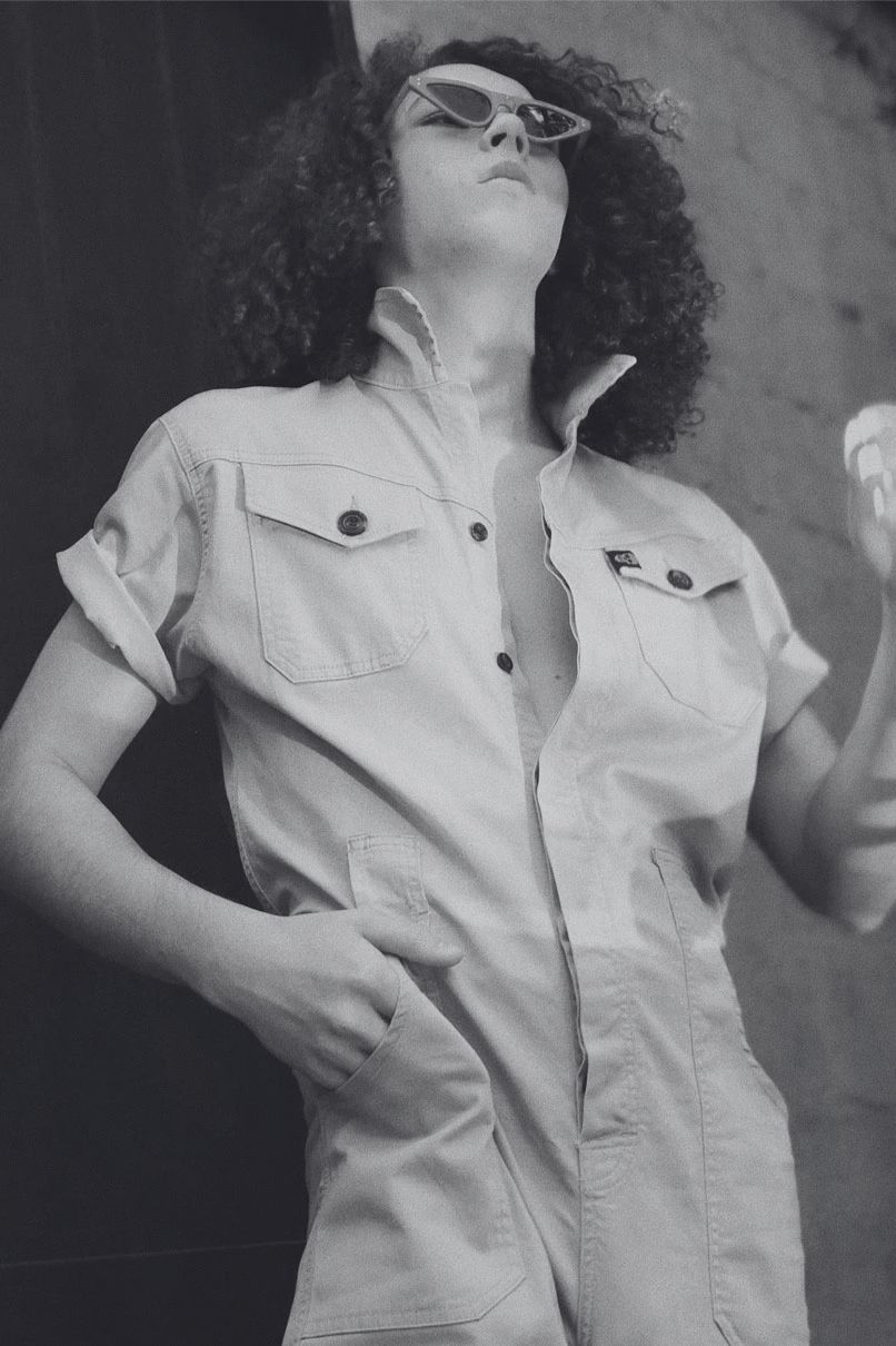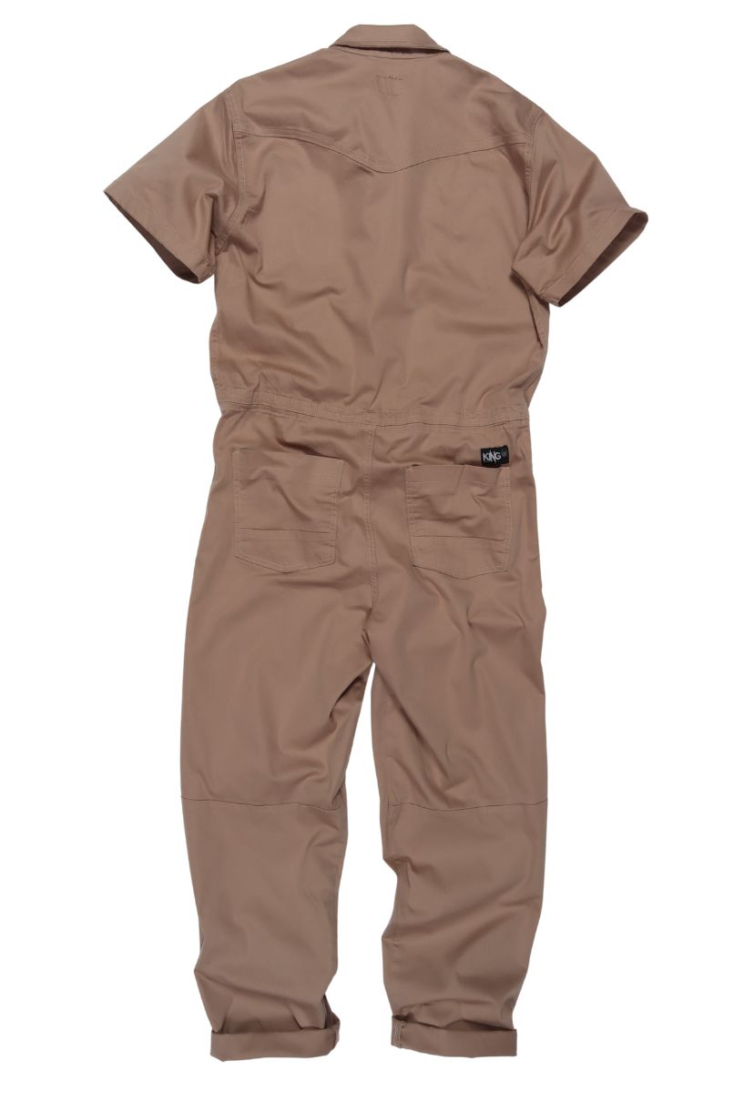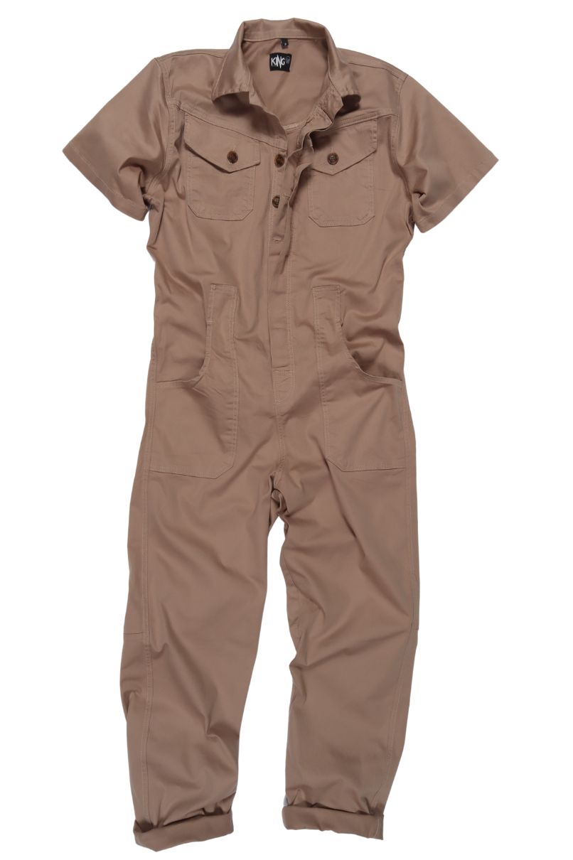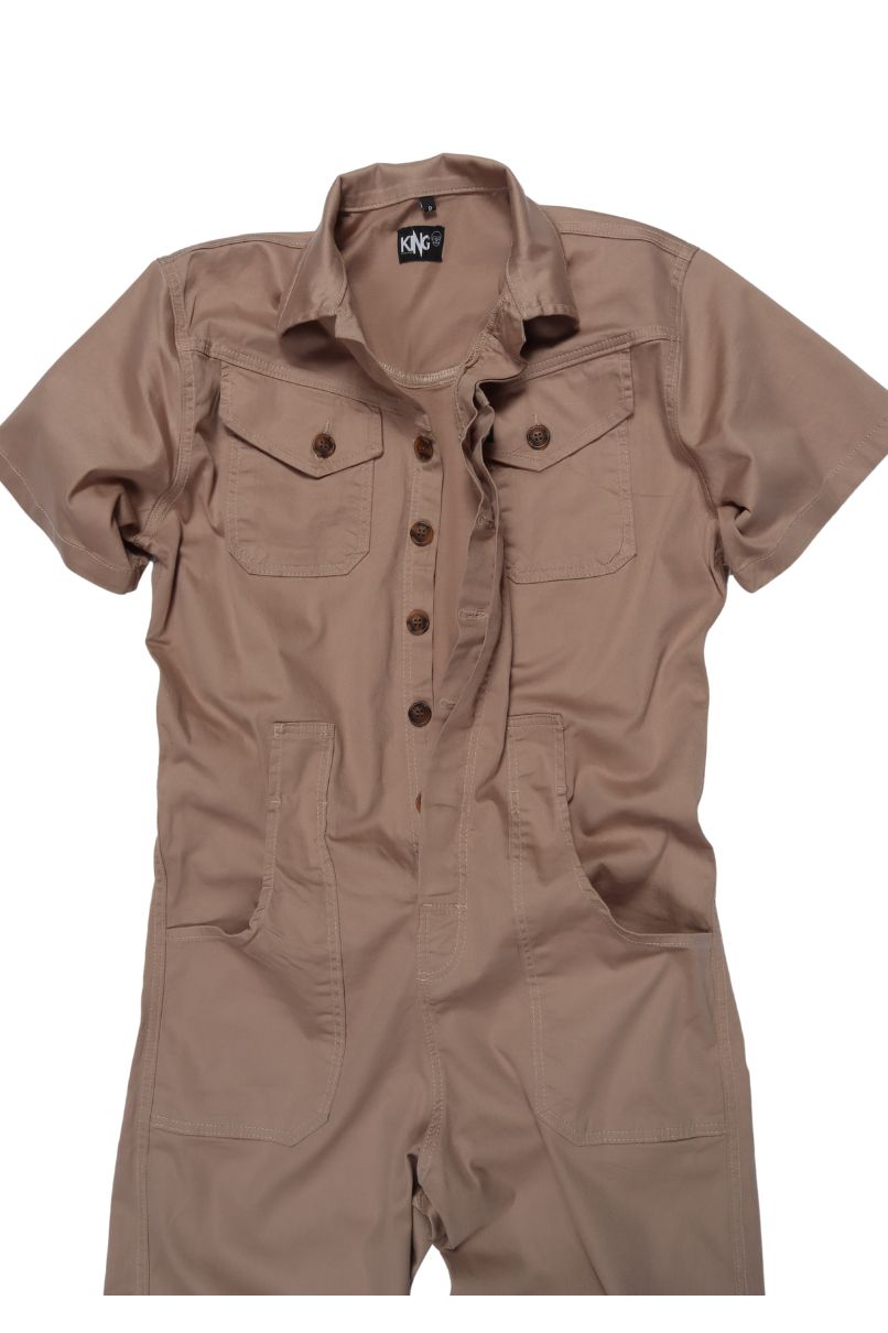 Macacão estilo operário, em sarja Bege, com fechamento frontal em Botão, possui bolsos frontais e traseiro. Com dois passantes acima dos bolsos da frete para cinto.