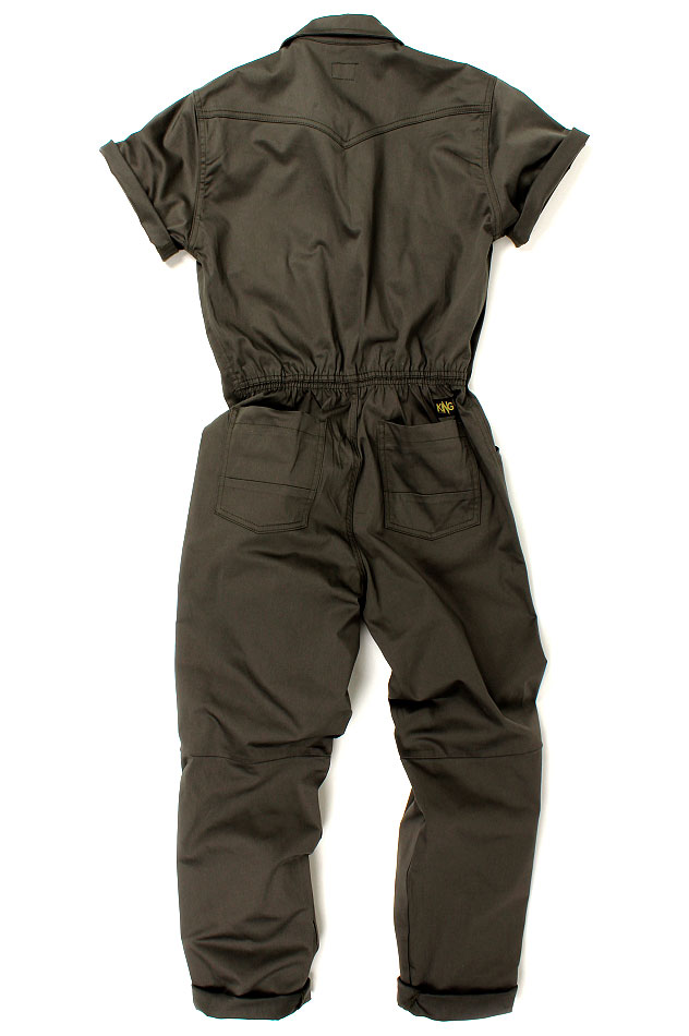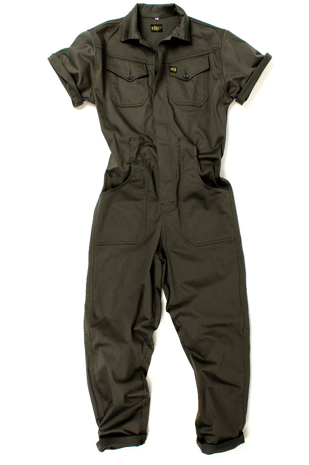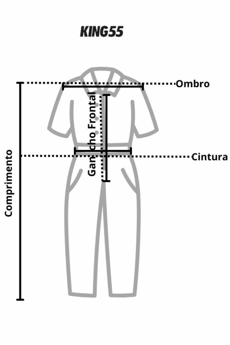Macacão estilo operário, em sarja Verde Militar, com fechamento frontal em Botão, possui bolsos frontais e traseiro. Com dois passantes acima dos bolsos da frete para cinto.