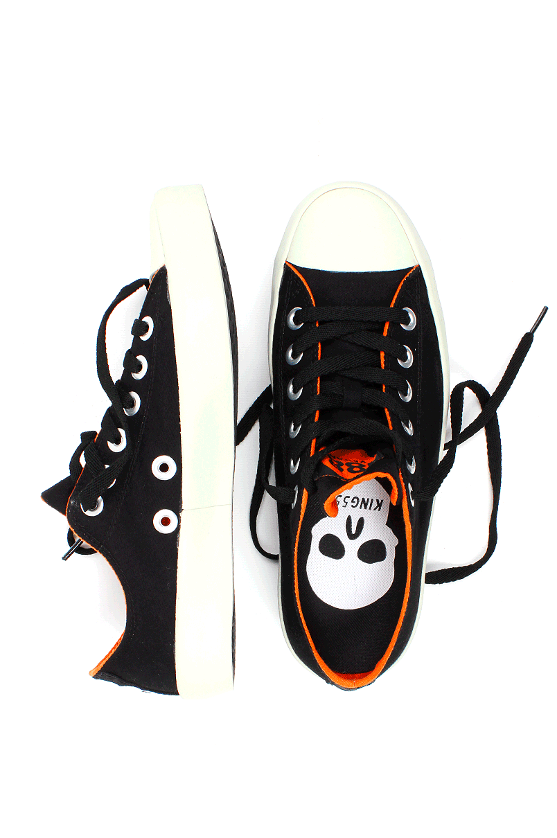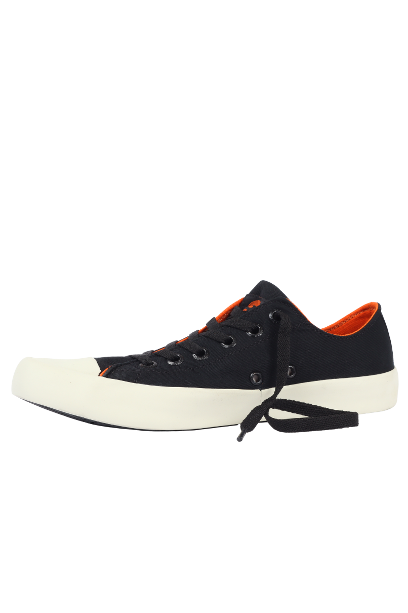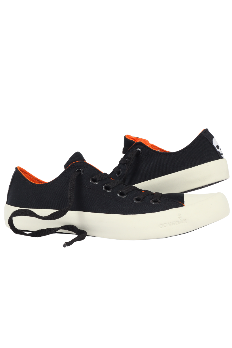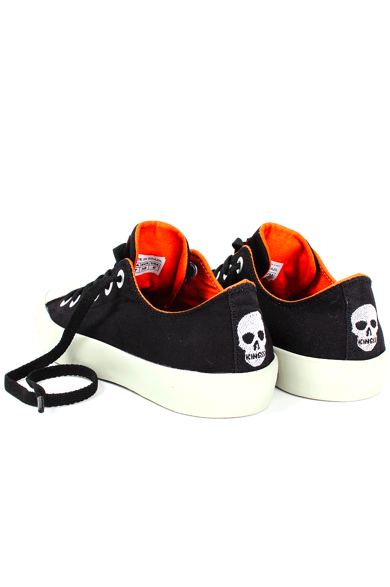 O material deste Tênis Vegano é 100% algodão possui fita traseira personalisada com uma caveira, o solado é de borracha reciclada vulcanizada.