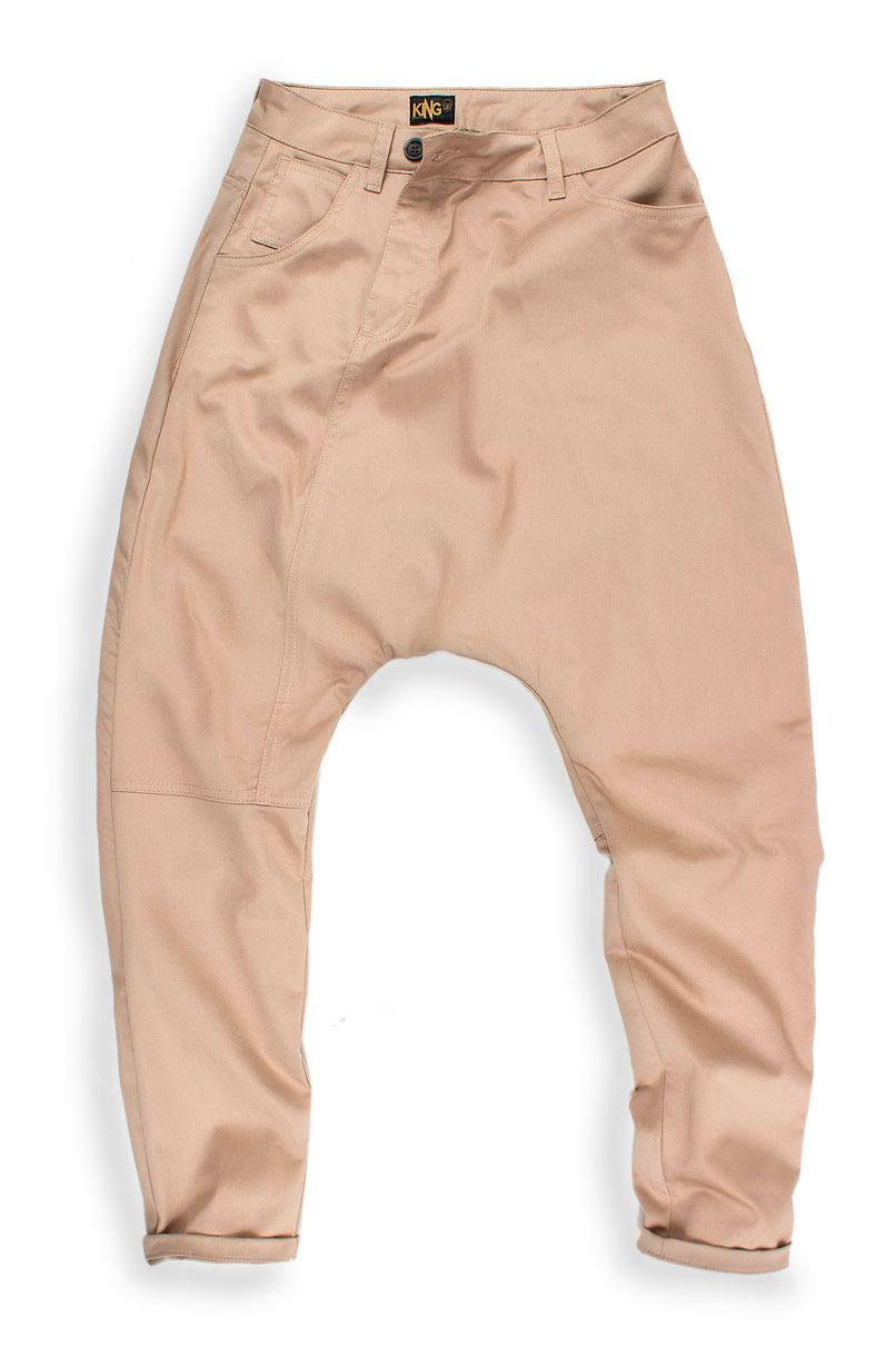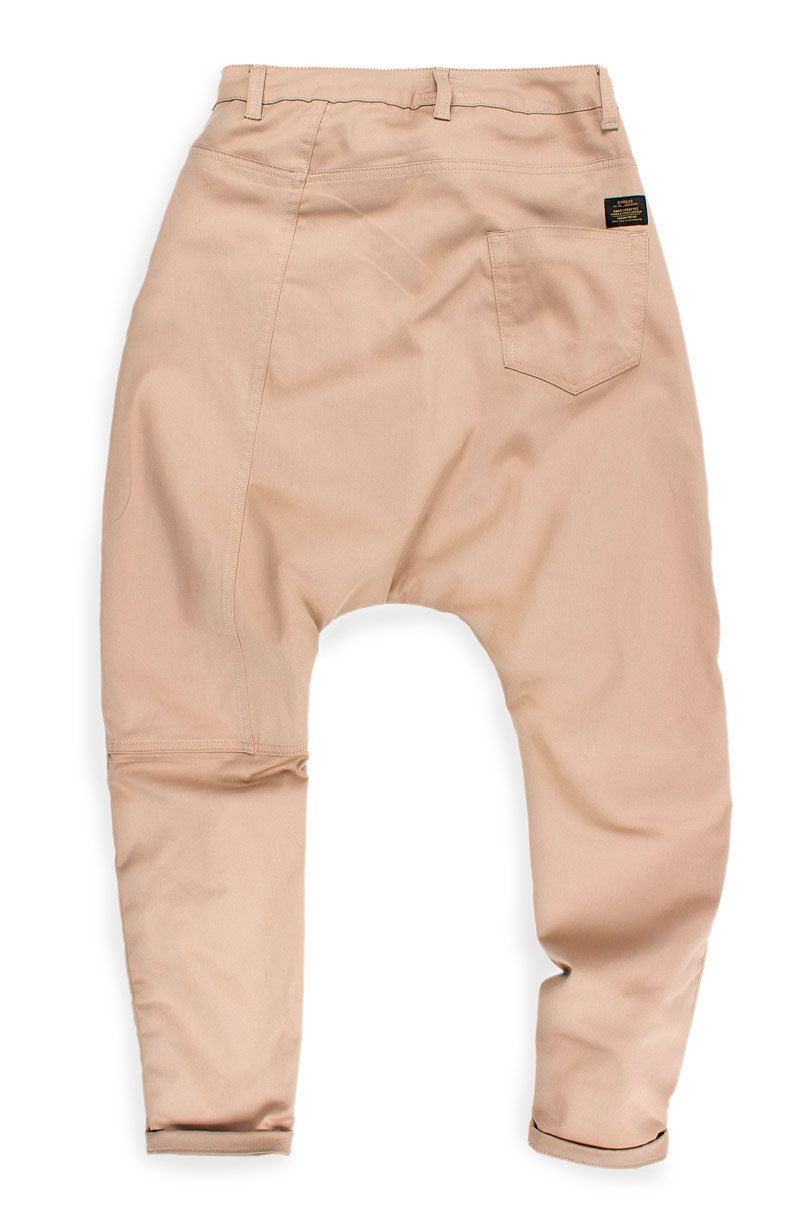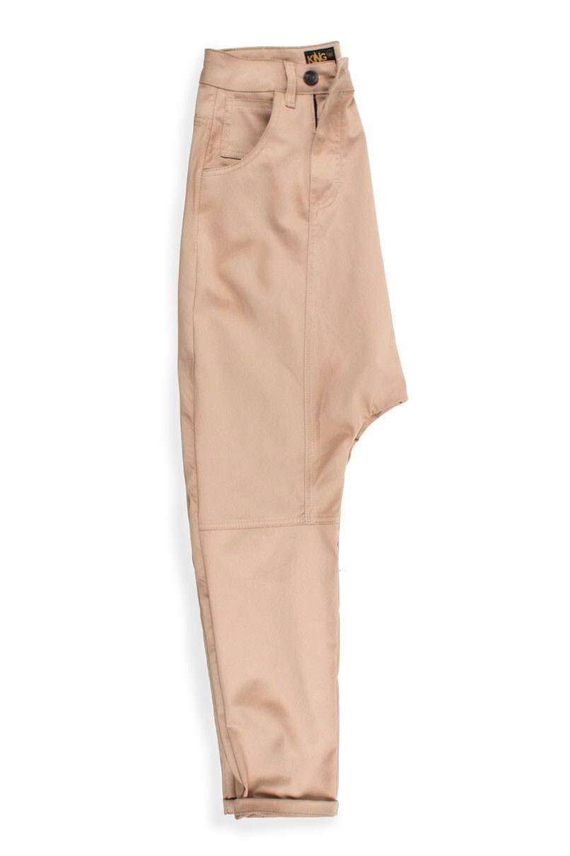 Calça de sarja Kaki, modelo Saruel, gancho baixo, bolso faca, bolso único traseiro, braguilha lateral e fechamento em zíper.