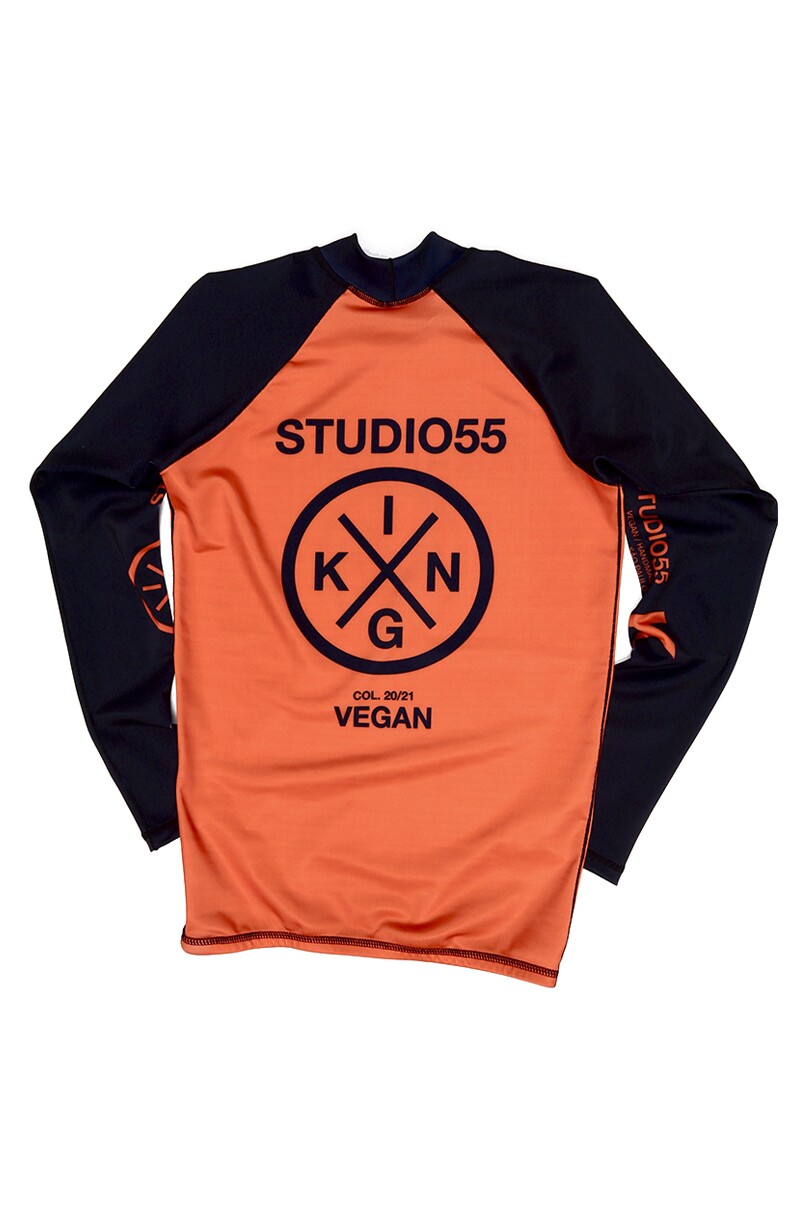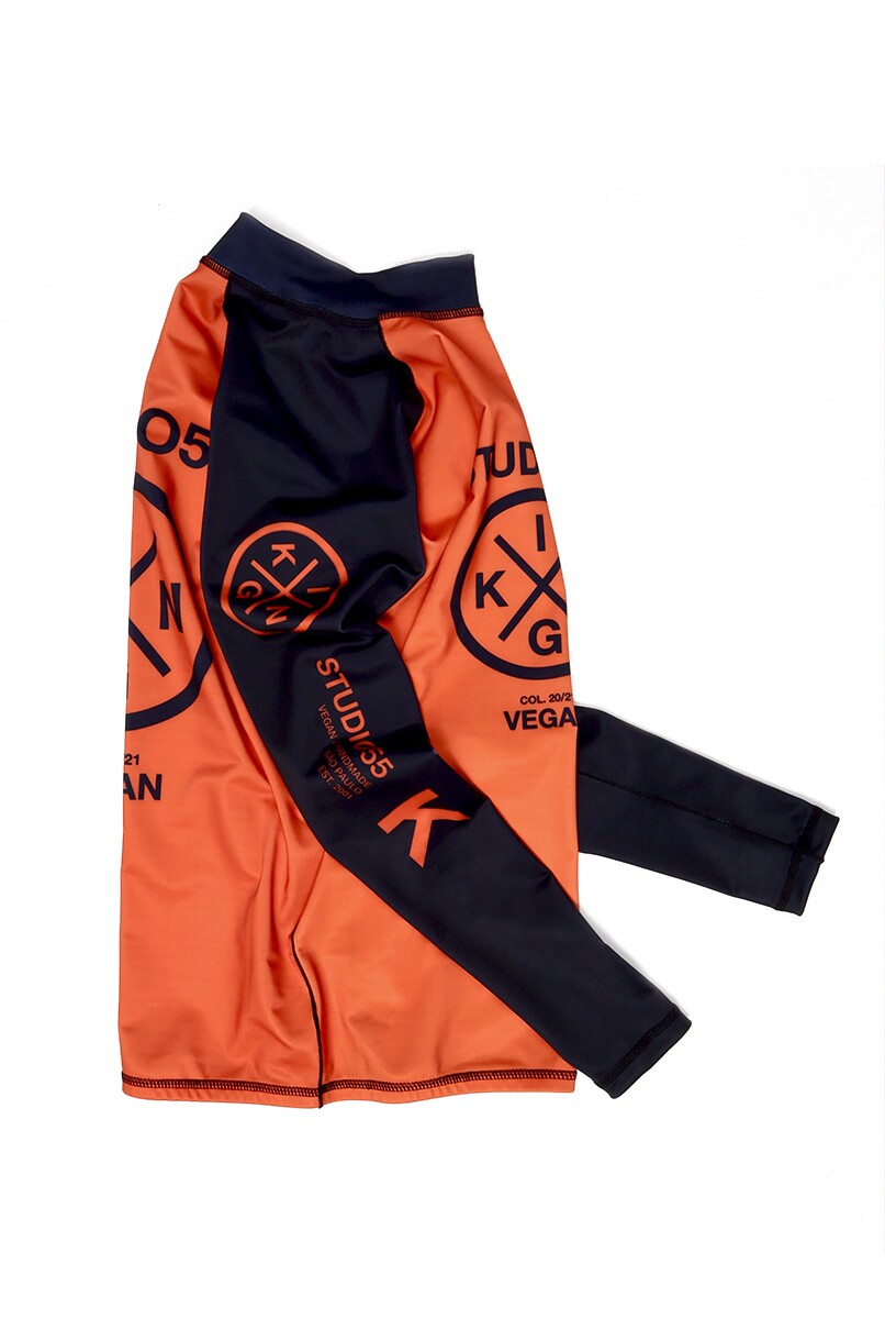 Camiseta de Lycra Laranja Studio55, pensada para praticas esportivas, permite mobilidade, seca rápido e se molda ao corpo, ideal para esportes aquáticos.