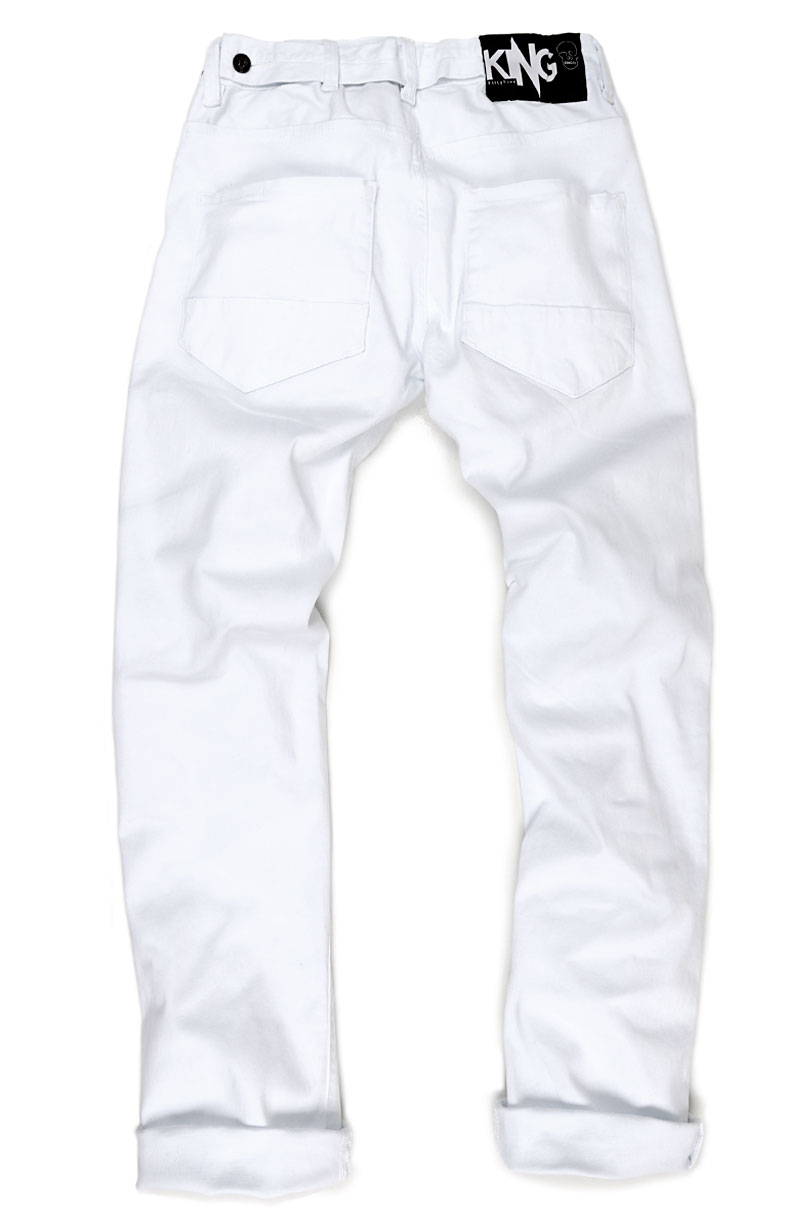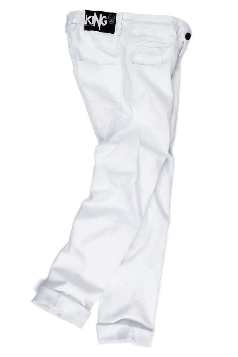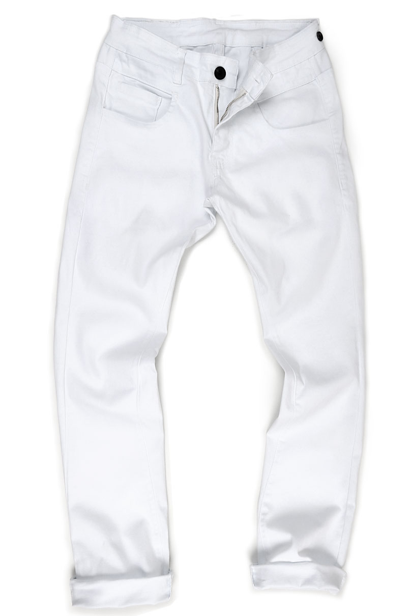 Calça de Sarja Branca, 97% algodão 3% elastano, modelagem reta, bolso pockets, reguladores no cós e recorte anatômico nas pernas.Costurada com linha de 100% algodão.