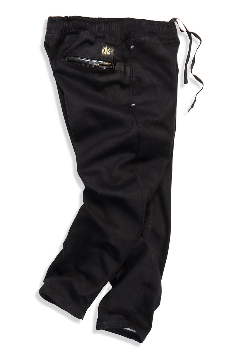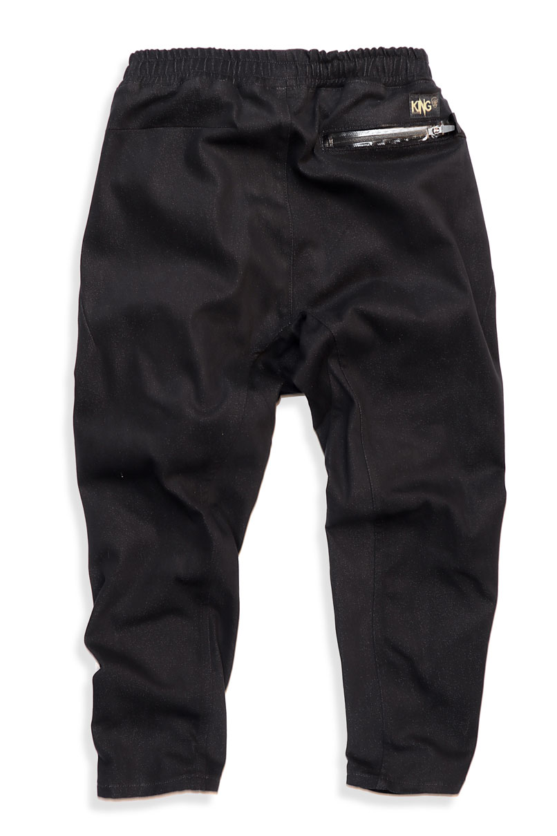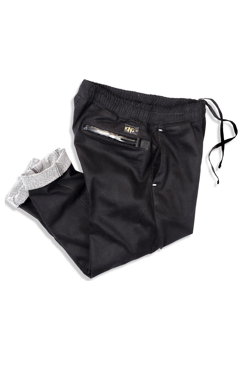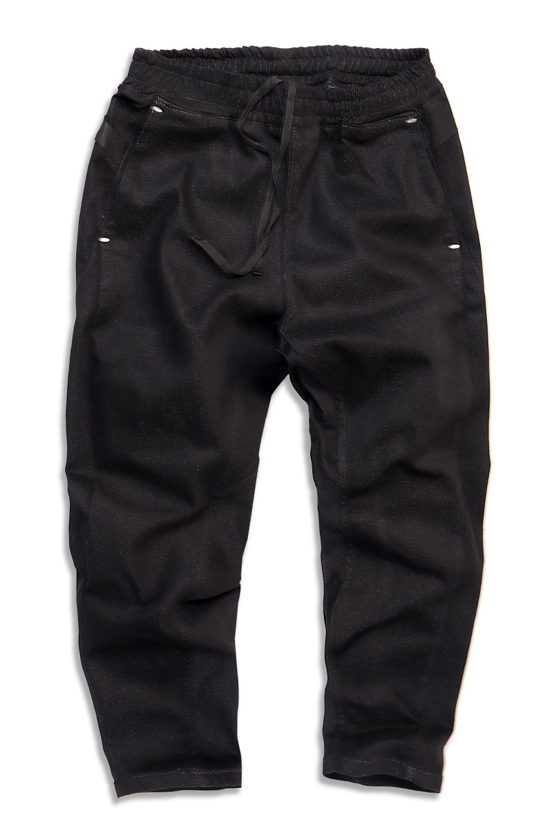 Calça de sarja preta, conta com cós elástico ajustável por cadarço interno, possui gancho longo, bolso faca lateral e bolso traseiro embutido com fechamento em zíper tratorado.