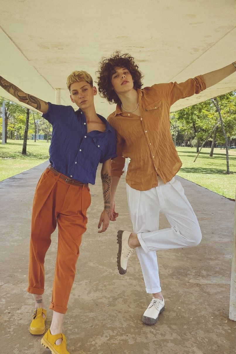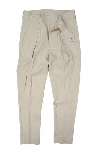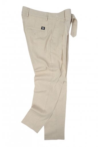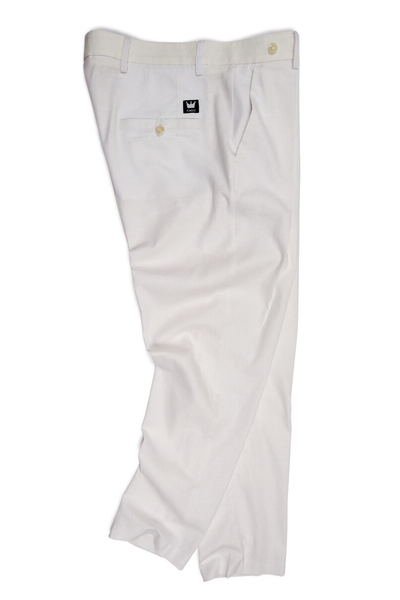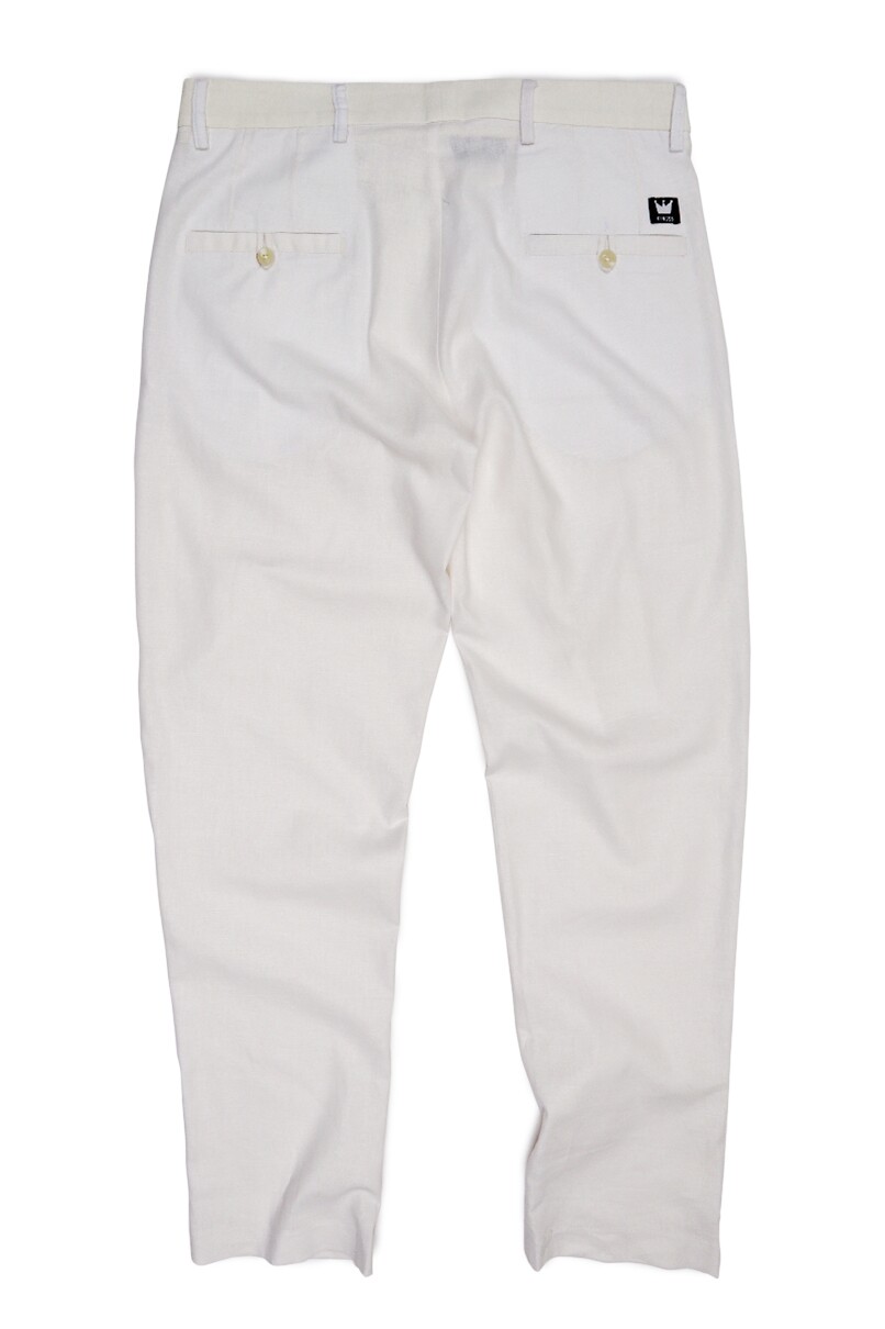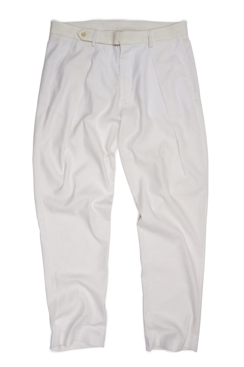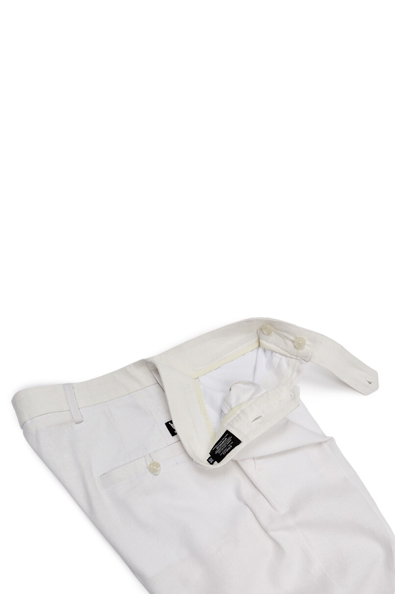Calça Branca Linho Prega, dispõe de cós transpassado, abotoamento duplo e braguilha com zíper, conta com passadores possibilitando o uso de cinto. Bolsos frontais faca e bolsos traseiros embutidos com fechamento em botão.