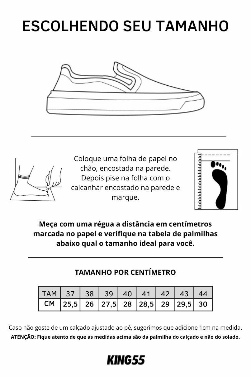 Modelo Slip On, conta com elásticos lateráis para facilitar o calço e permanecer ajustado aos pés.