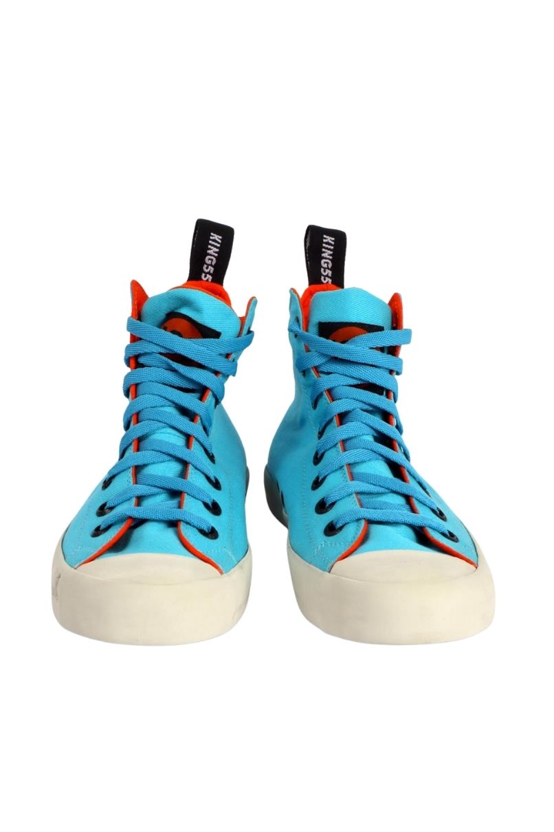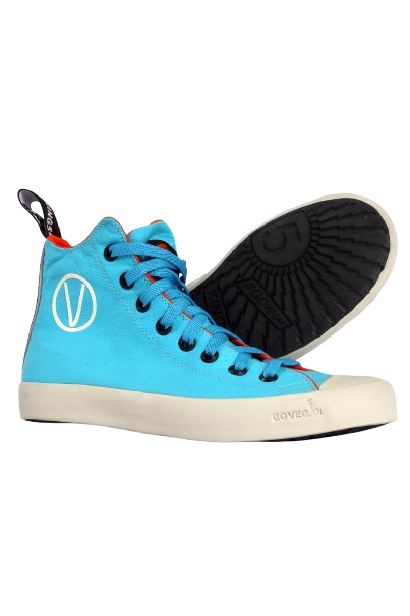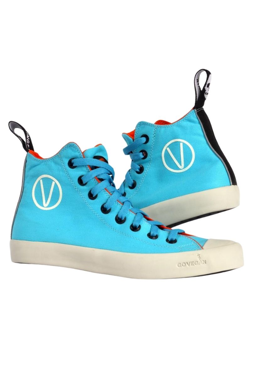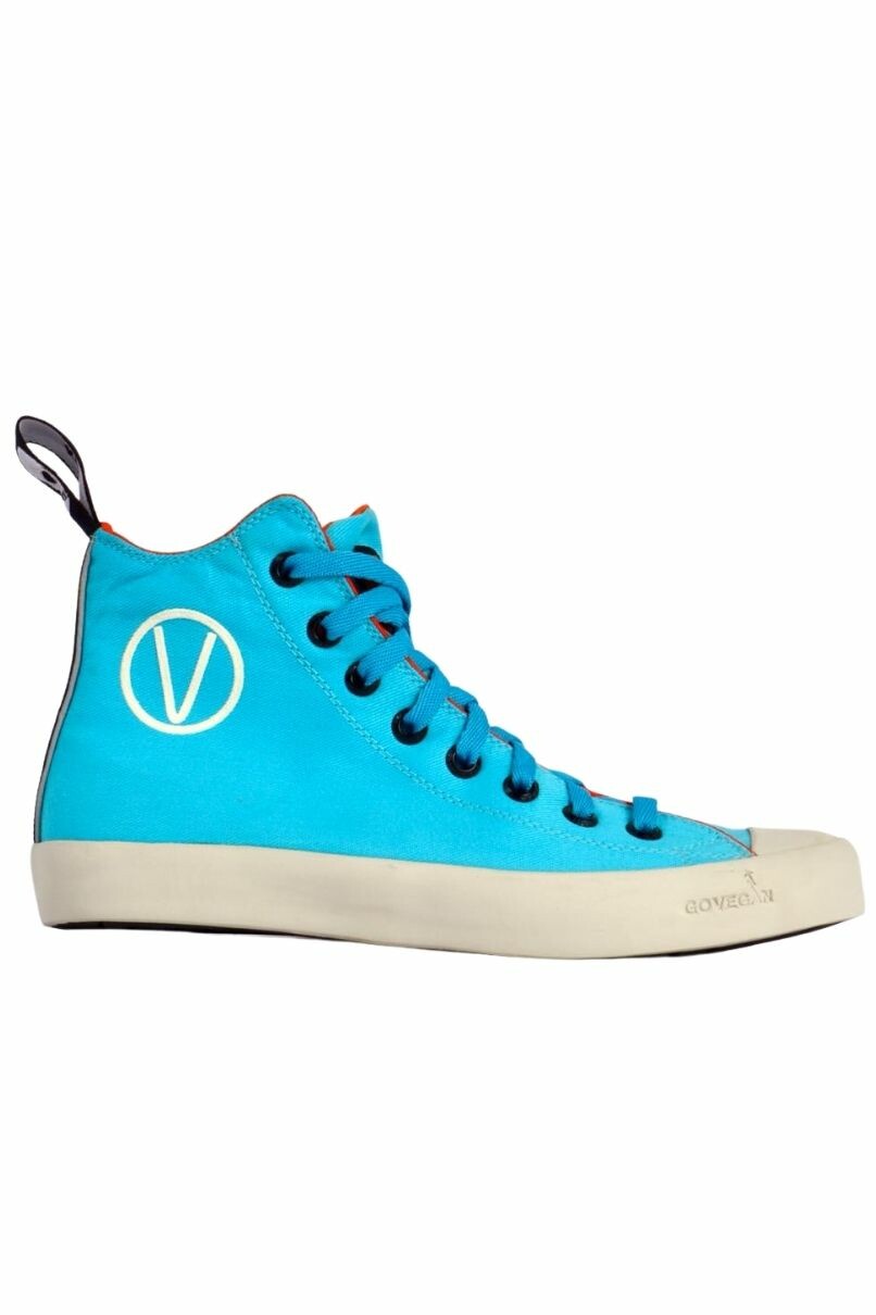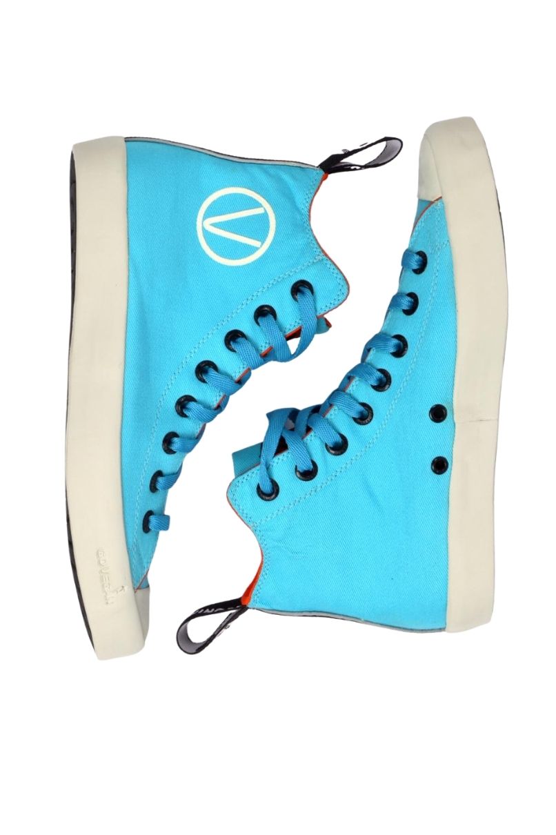 Tênis Vegano Azul Piscina, cano alto, Confeccionado em tecido de algodão - 100% livre de Crueldade Animal. Esse Tênis tem um super diferencial que é uma fita refletiva na parte de trás, proporcionando mais segurança para quem anda de Bike, Skate, etc...tambem possui elastico na parte interna para segurar a lingua do tênis, dando mais conforto e estabilidade no cabedal.
