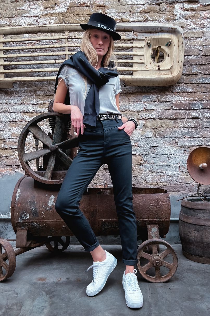 Calça Preta de Cintura Alta feita em Jeans, cintura alta com pala dianteira e fechamento em zíper, conta com uma modelagem semi bag e five -Pockets.