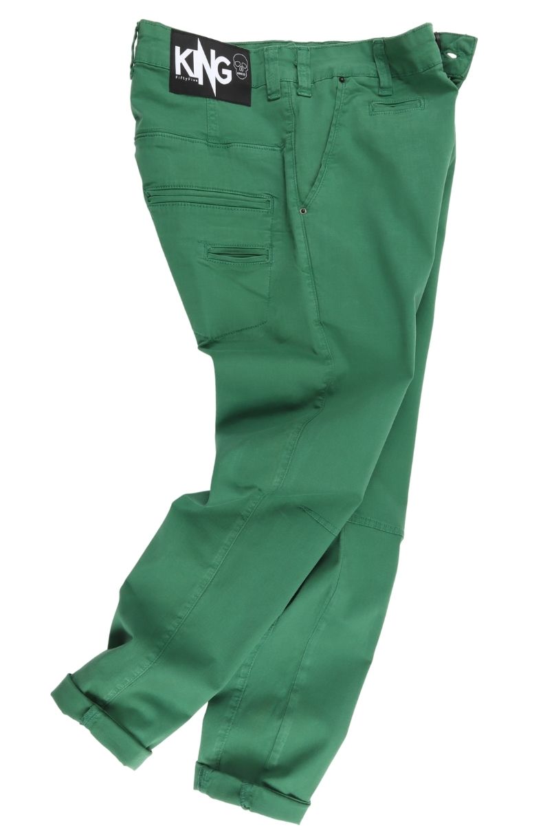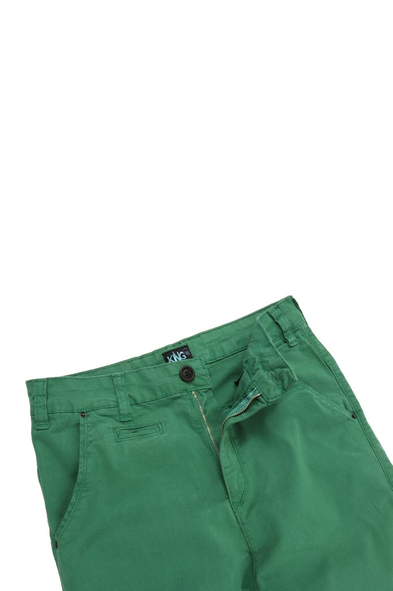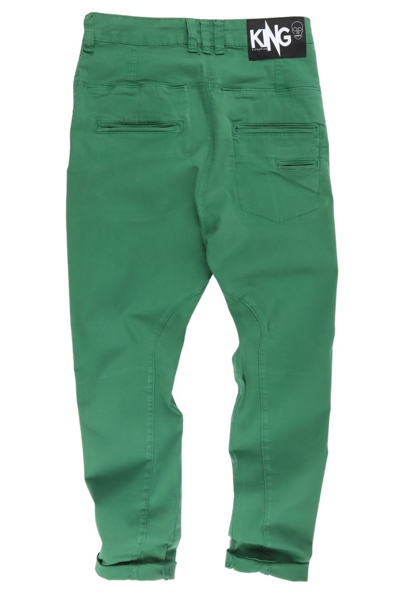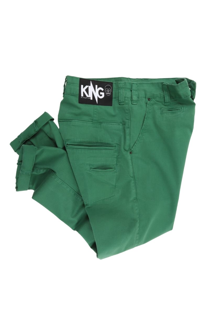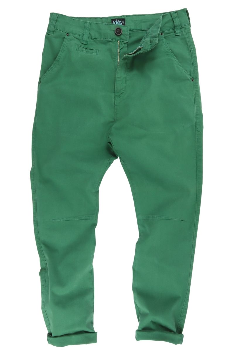 Calça de sarja Verde Bandeira, Modelagem chino com bolsos faca, gancho longo e pernas ajustadas.