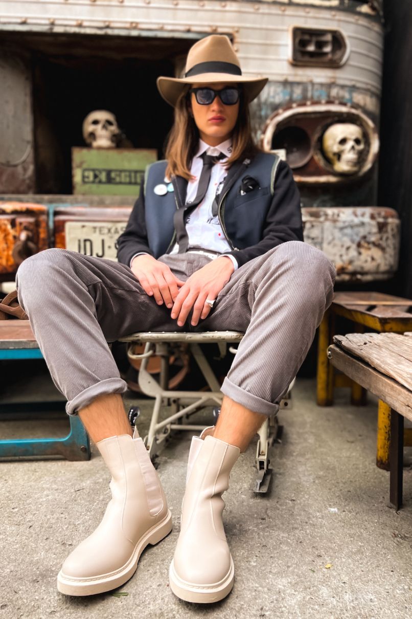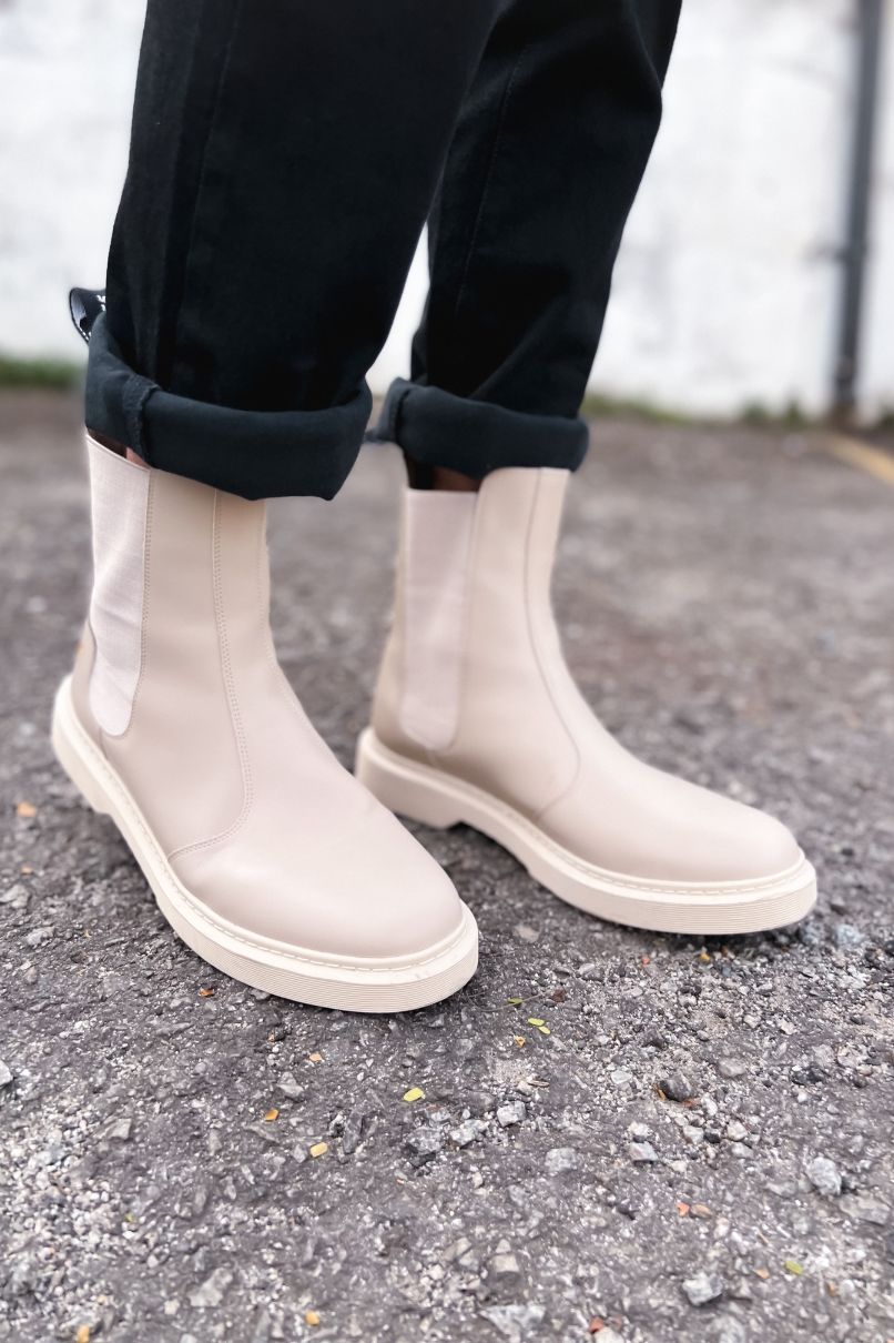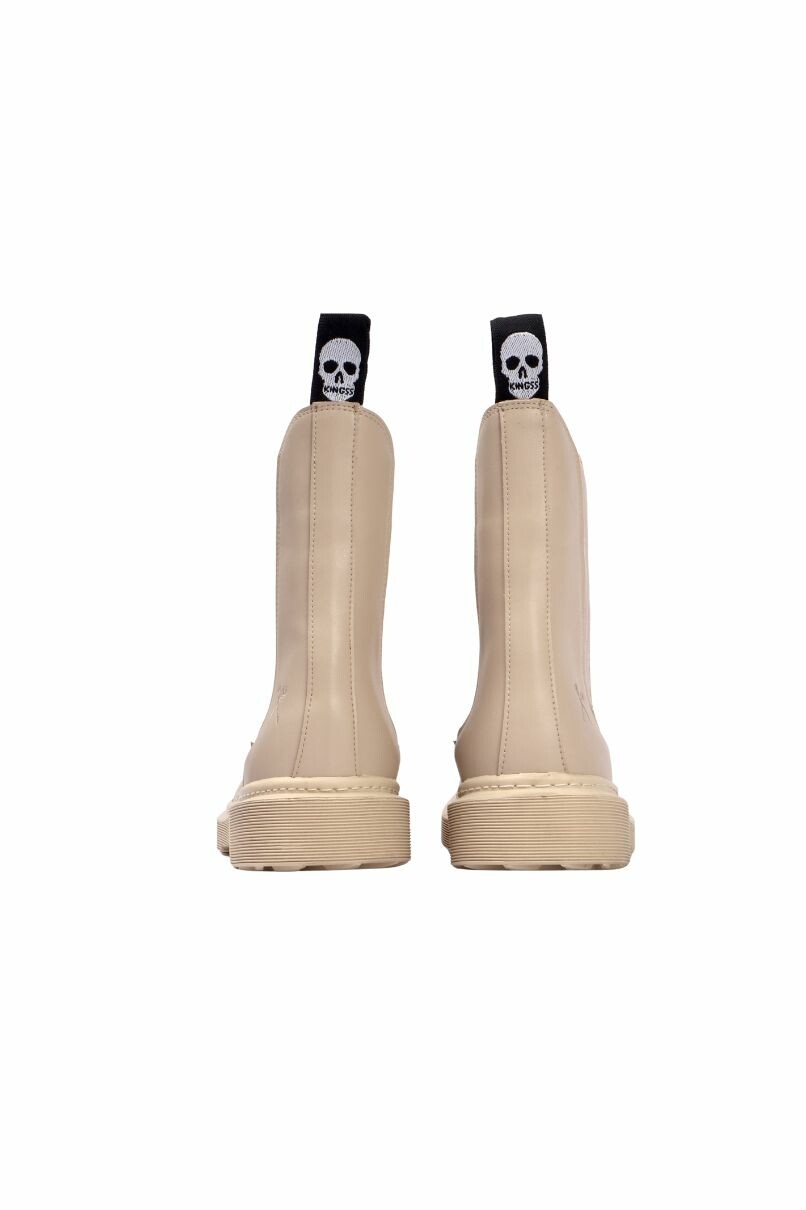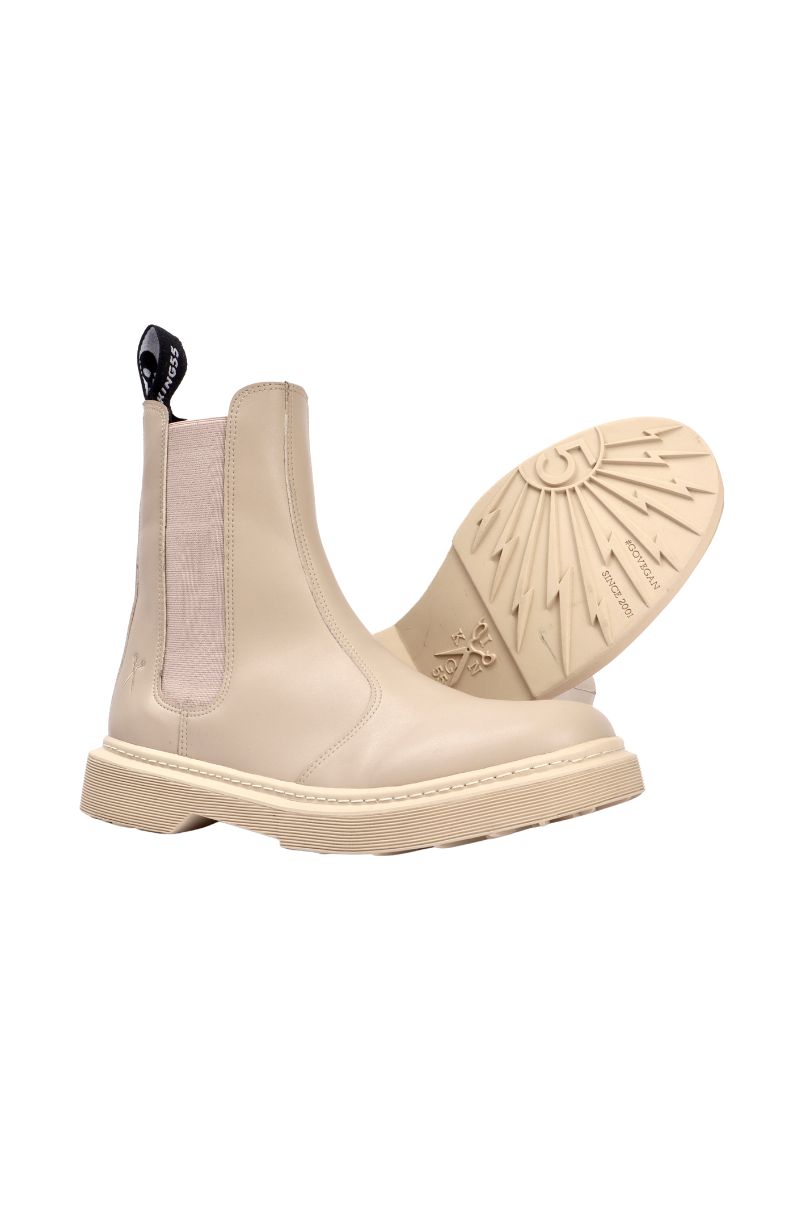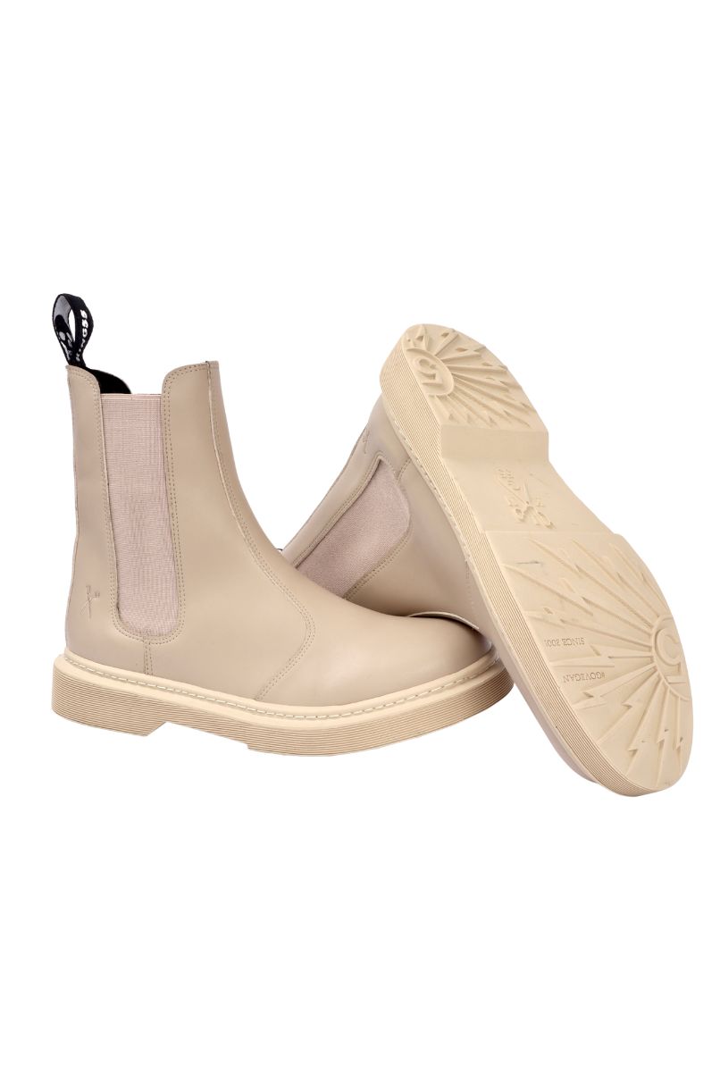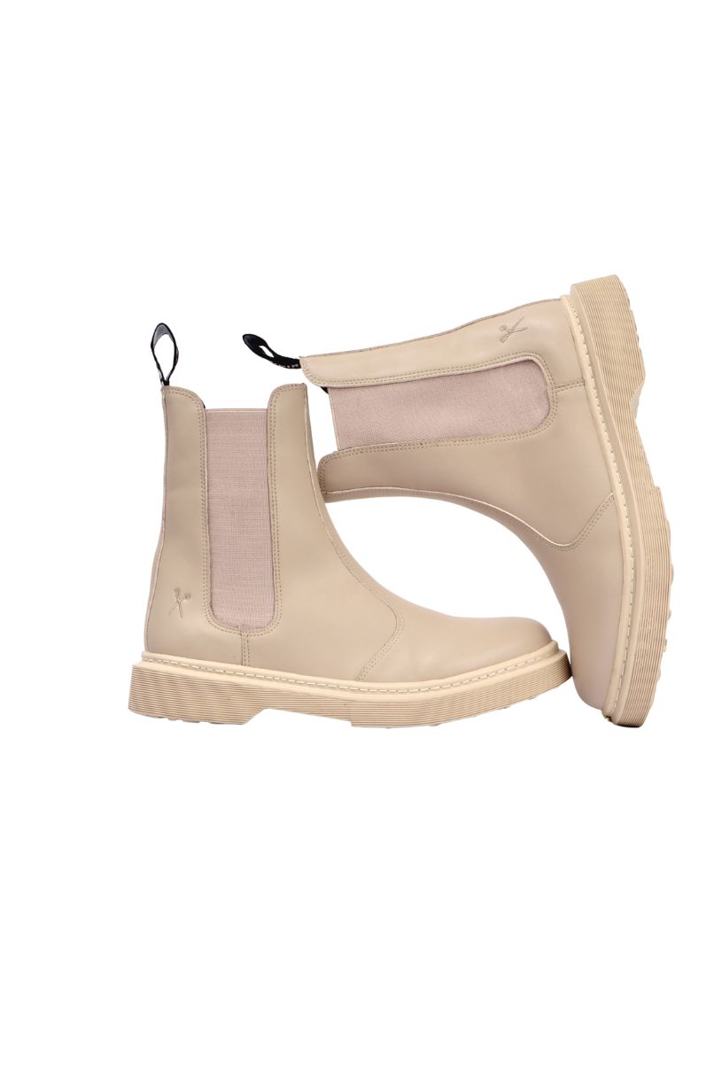 Bota Chelsea Bege com Elástico, com solado Personalizado K55. Confeccionada de Material Sintético de Microfibra por dentro e por fora 100% livre de crueldade animal.