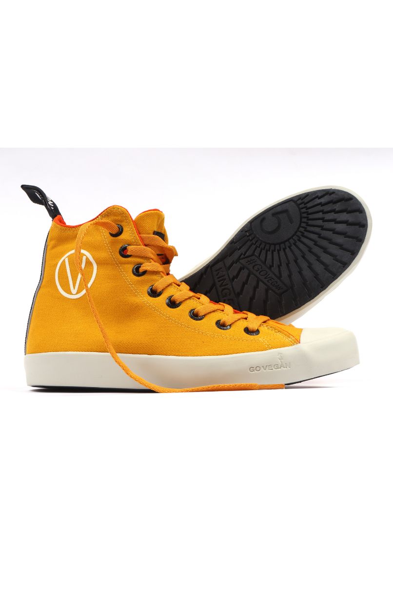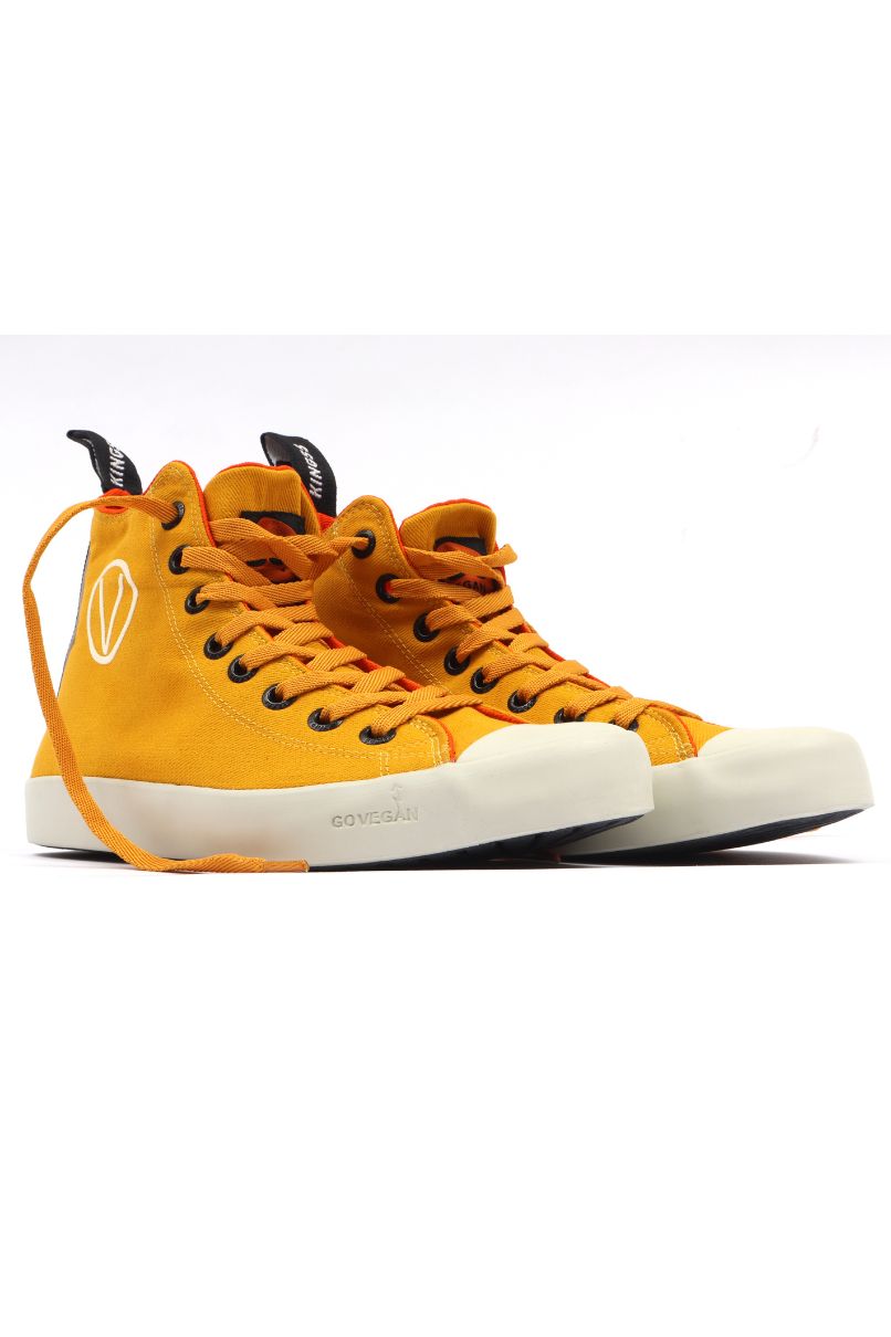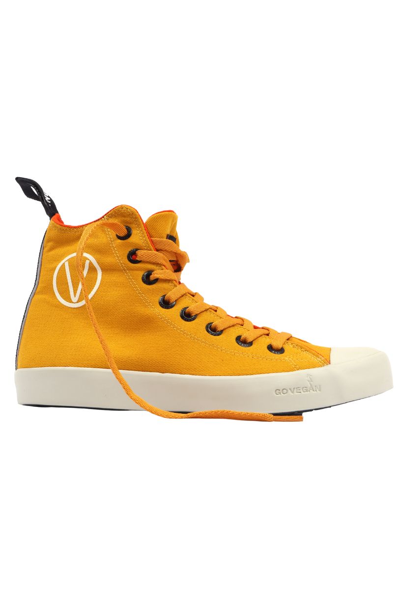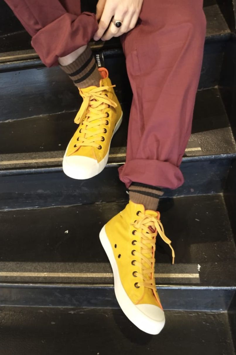 Tênis Vegano Mostarda, cano alto, Confeccionado em tecido de algodão - 100% livre de Crueldade Animal. Esse Tênis tem um super diferencial que é uma fita refletiva na parte de trás, proporcionando mais segurança para quem anda de Bike, Skate, etc...tambem possui elastico na parte interna para segurar a lingua do tênis, dando mais conforto e estabilidade no cabedal.