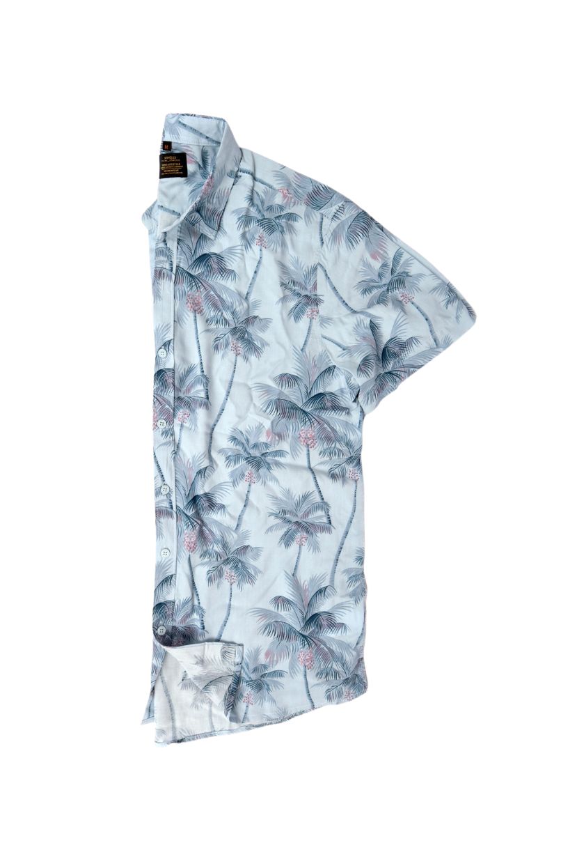 Camisa de Viscose Icaraí Manga Curta Estampada: Possui a modelagem mais estreita, colarinho curto, fechamento com botões e barra arredondada.