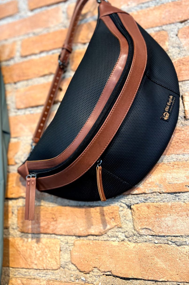Pochete Vegana, na cor Preto com Castor, produzida em Material sintético 100% Cruelty free, com o corpo e alças confeccionada em fake leather, contendo regulagem em toda a extensão da alça permitindo que você utilize com maior mobilidade no corpo.