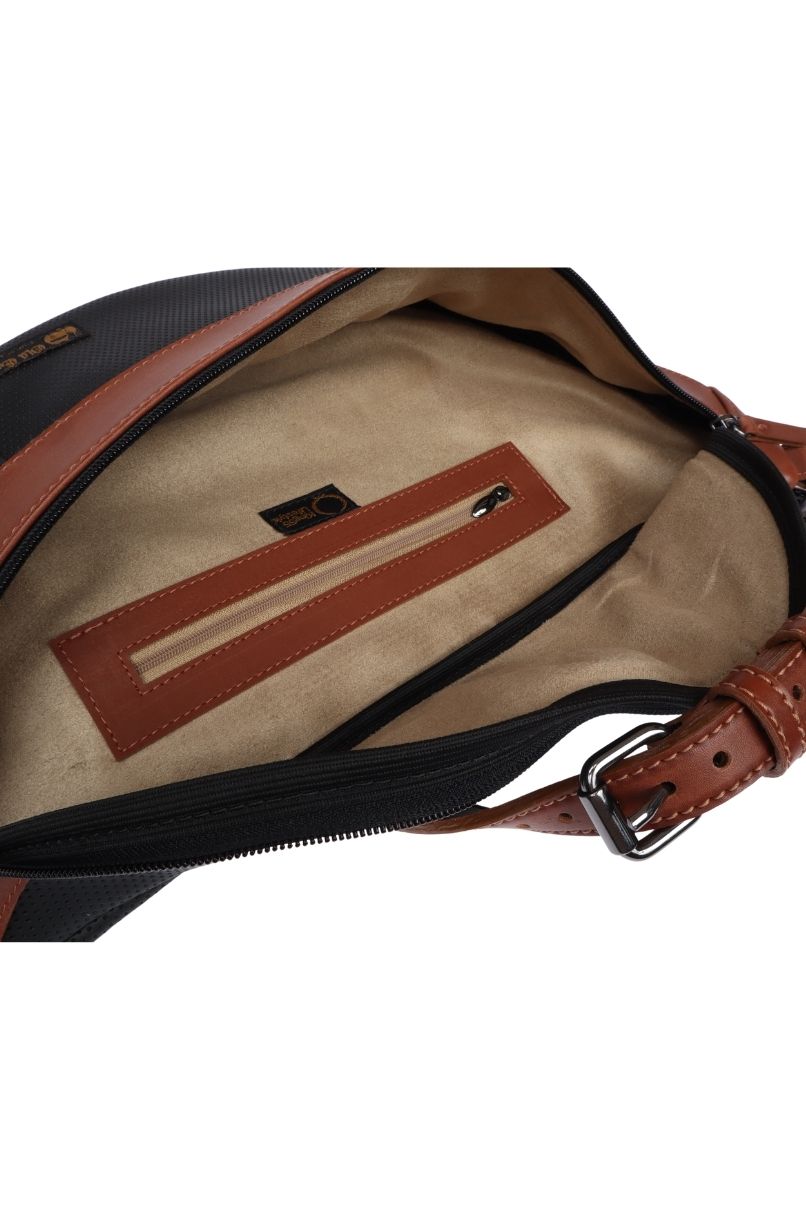 Todo o interior é revestido por um material que simula Camurça, possui um bolso interno e um externo com dois cursores.