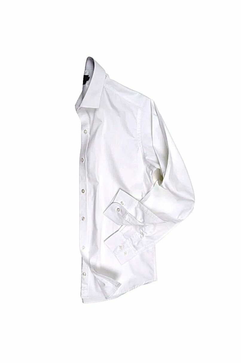 Camisa Social Branco Manga Longa, tecido importado Fio 100, modelagem Slim Fit, colarinho italiano, punho chanfrado com abotoamento regulável.