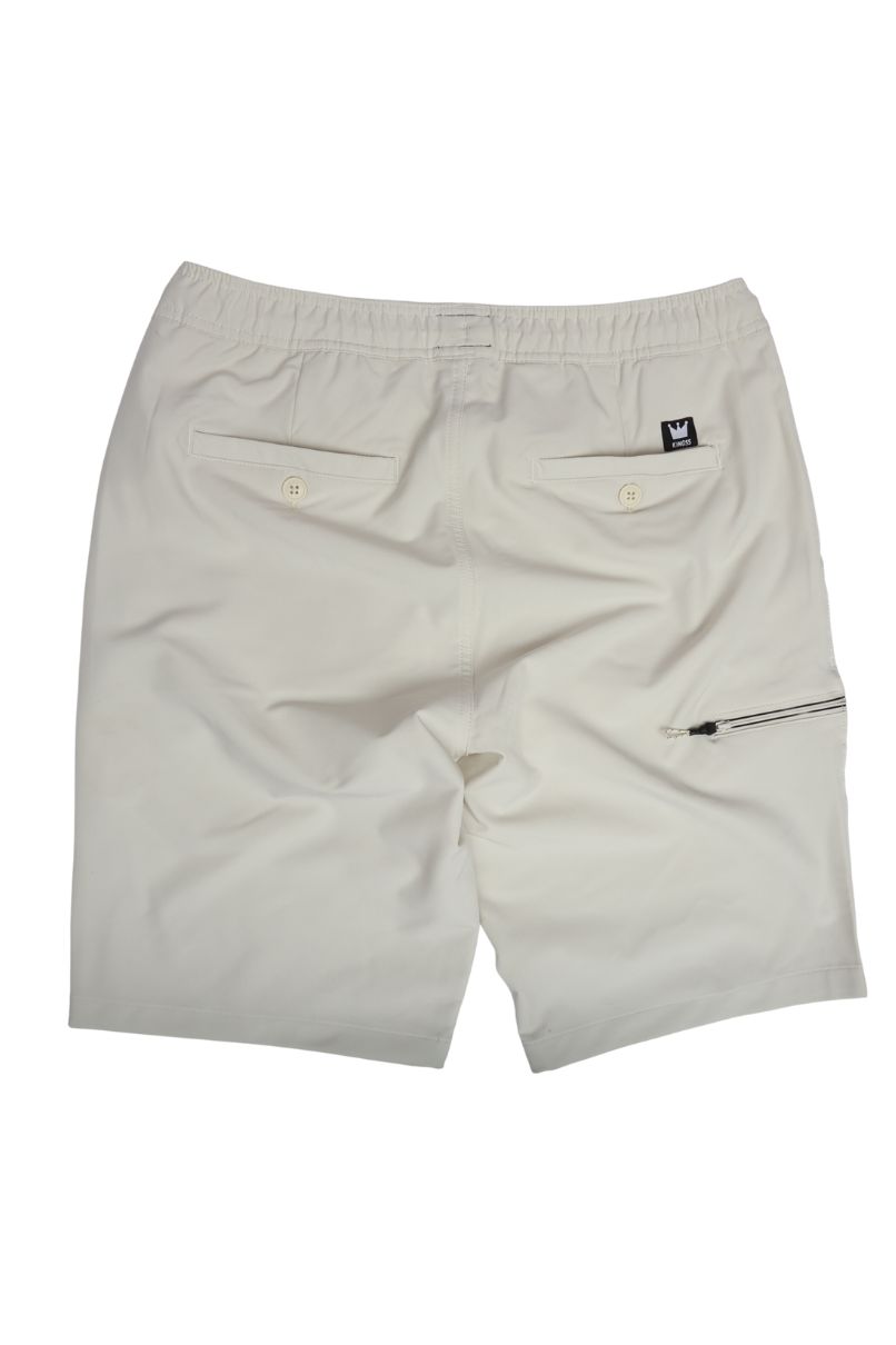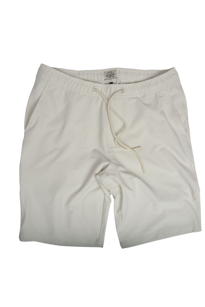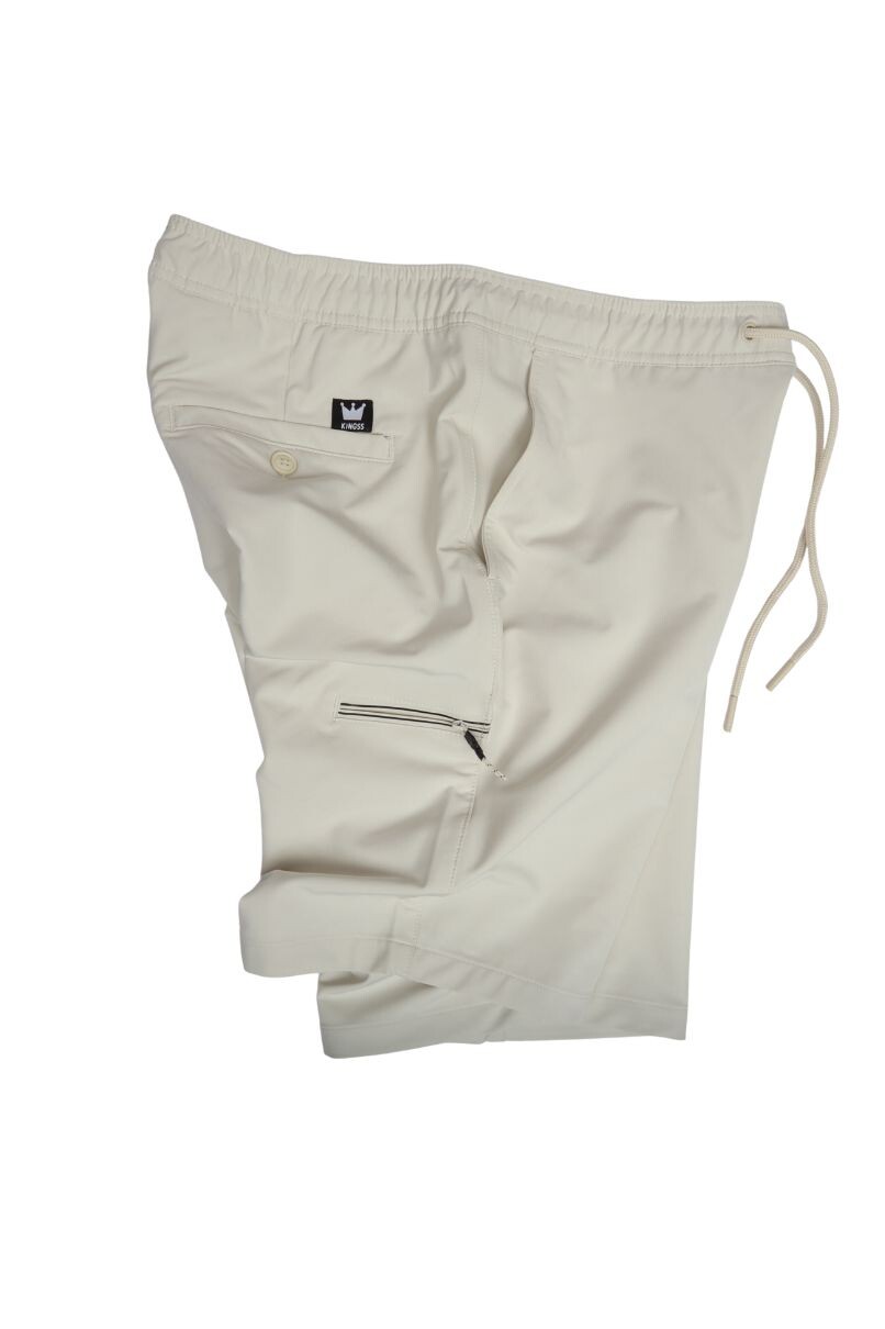 Bermuda Jogger Lisa de Microfibra Bege, dispõe de cós com elástico e ajuste em cadarço. Bolsos frontais faca, 2 bolsos embutidos traseiro com fechamento em botão de massa e um bolso lateral embutido com fechamento em zíper.