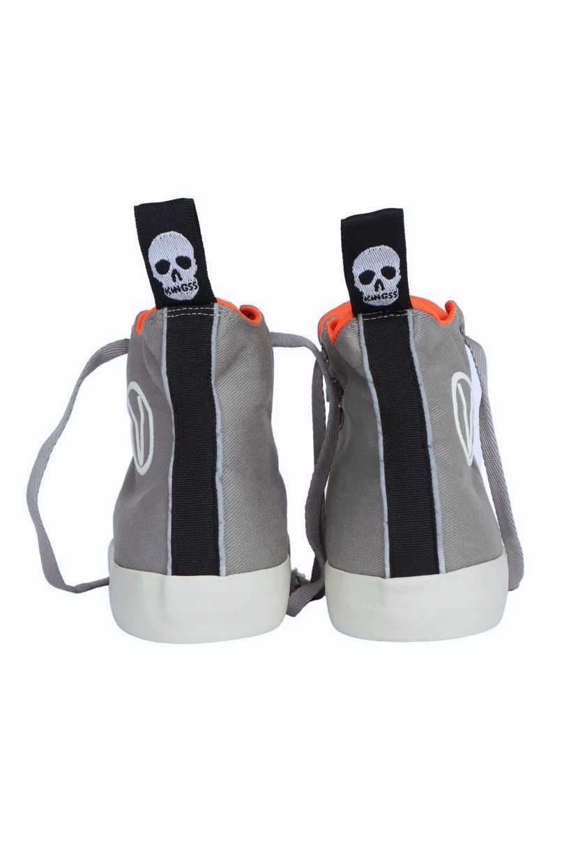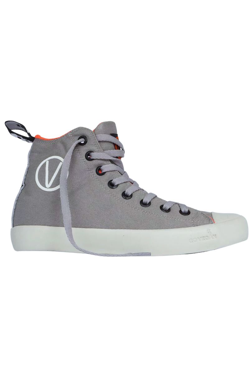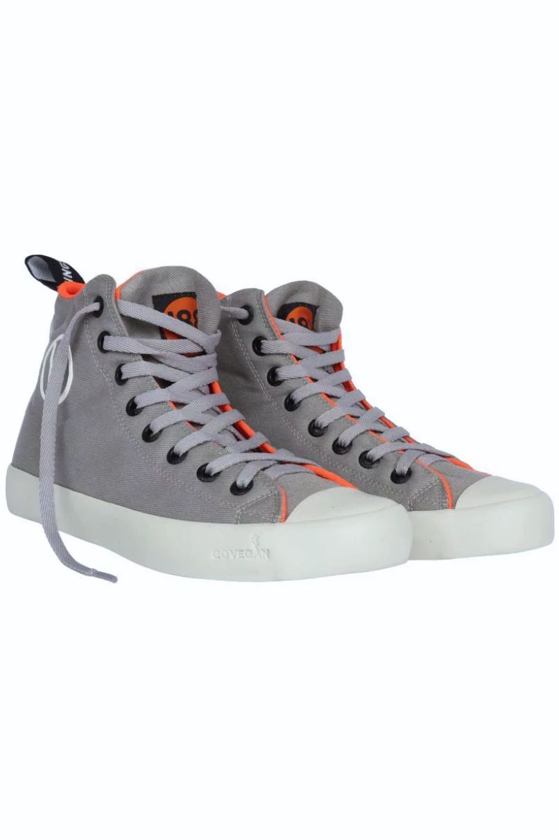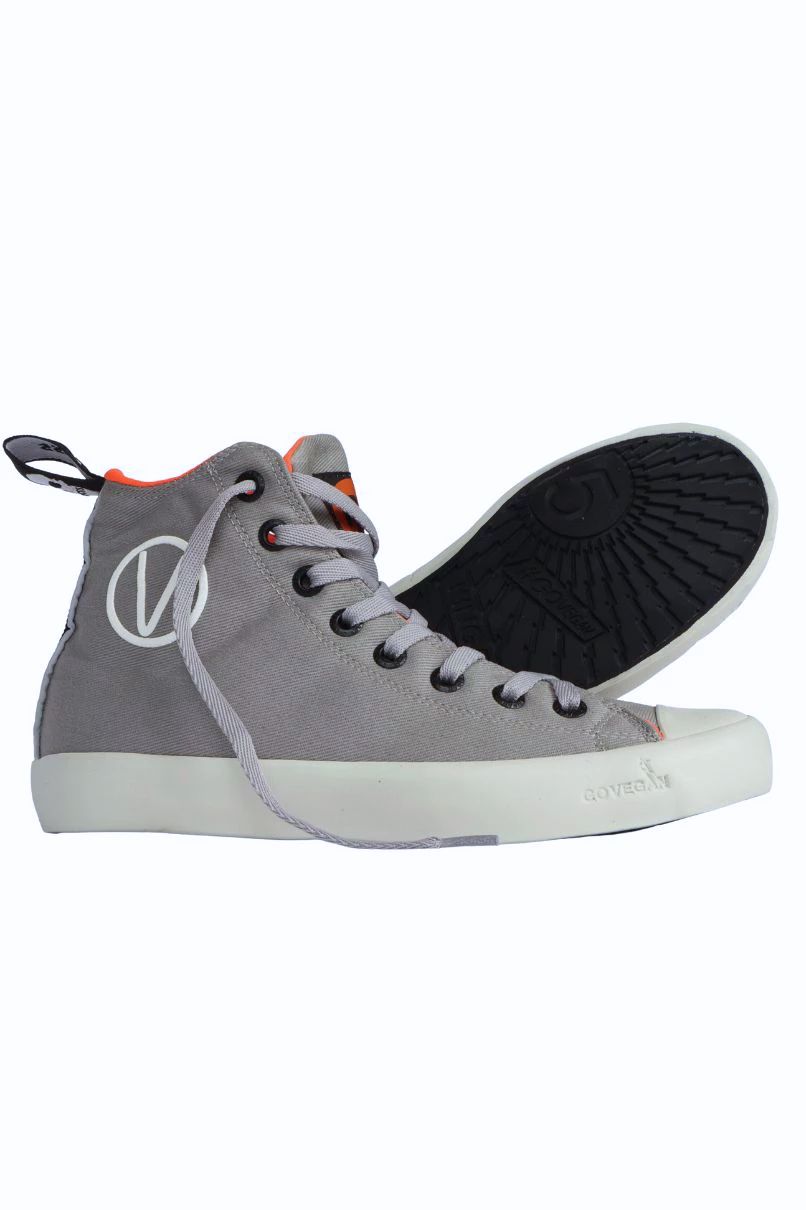 Tênis Vegano Cinza, cano alto. Confeccionado em tecido de algodão - 100% livre de Crueldade Animal. Esse Tênis tem um super diferencial que é uma fita refletiva na parte de trás, proporcionando mais segurança para quem anda de Bike, Skate, etc...tambem possui elastico na parte interna para segurar a lingua do tênis, dando mais conforto e estabilidade no cabedal.
