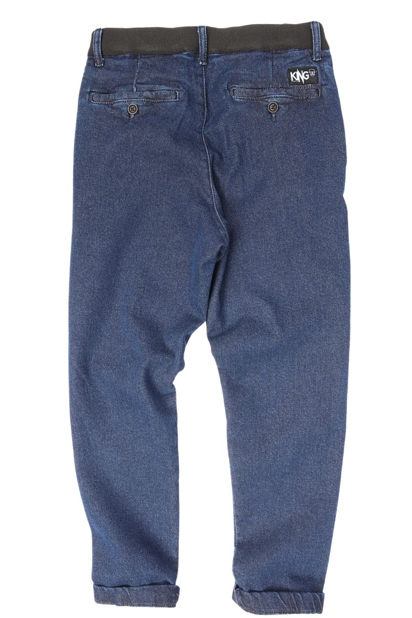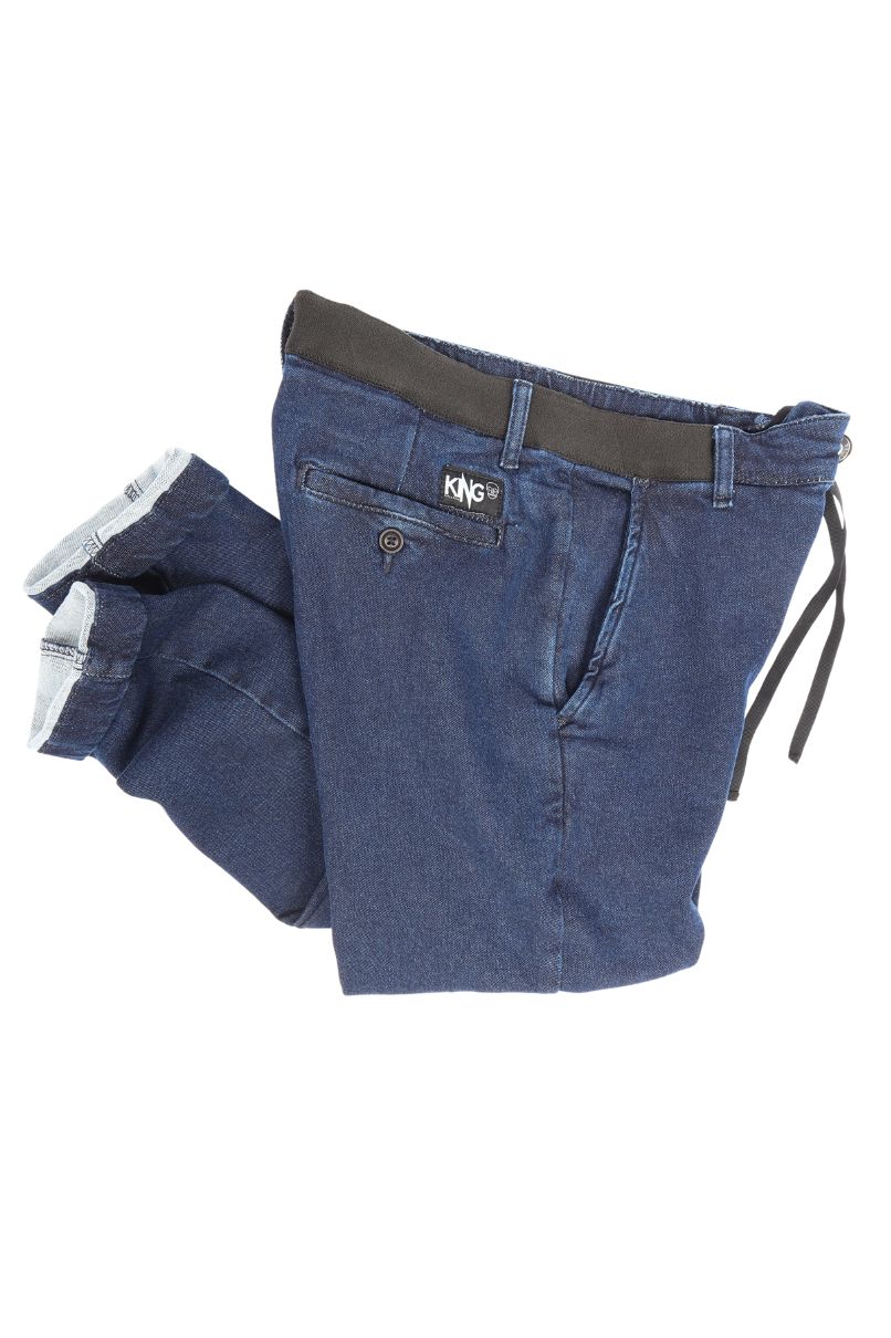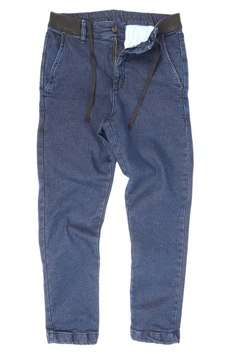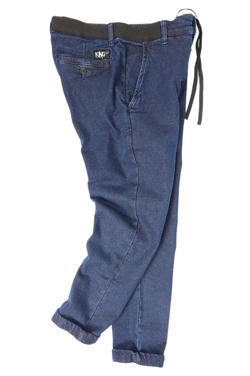 Calça Spot Sprint Jeans, cós elástico ajustável por cadarço e fechamento em botão e zíper, com passadores permitindo o uso de cinto, gancho baixo, bolso faca, bolso traseiro embutido com fechamento em botão.
