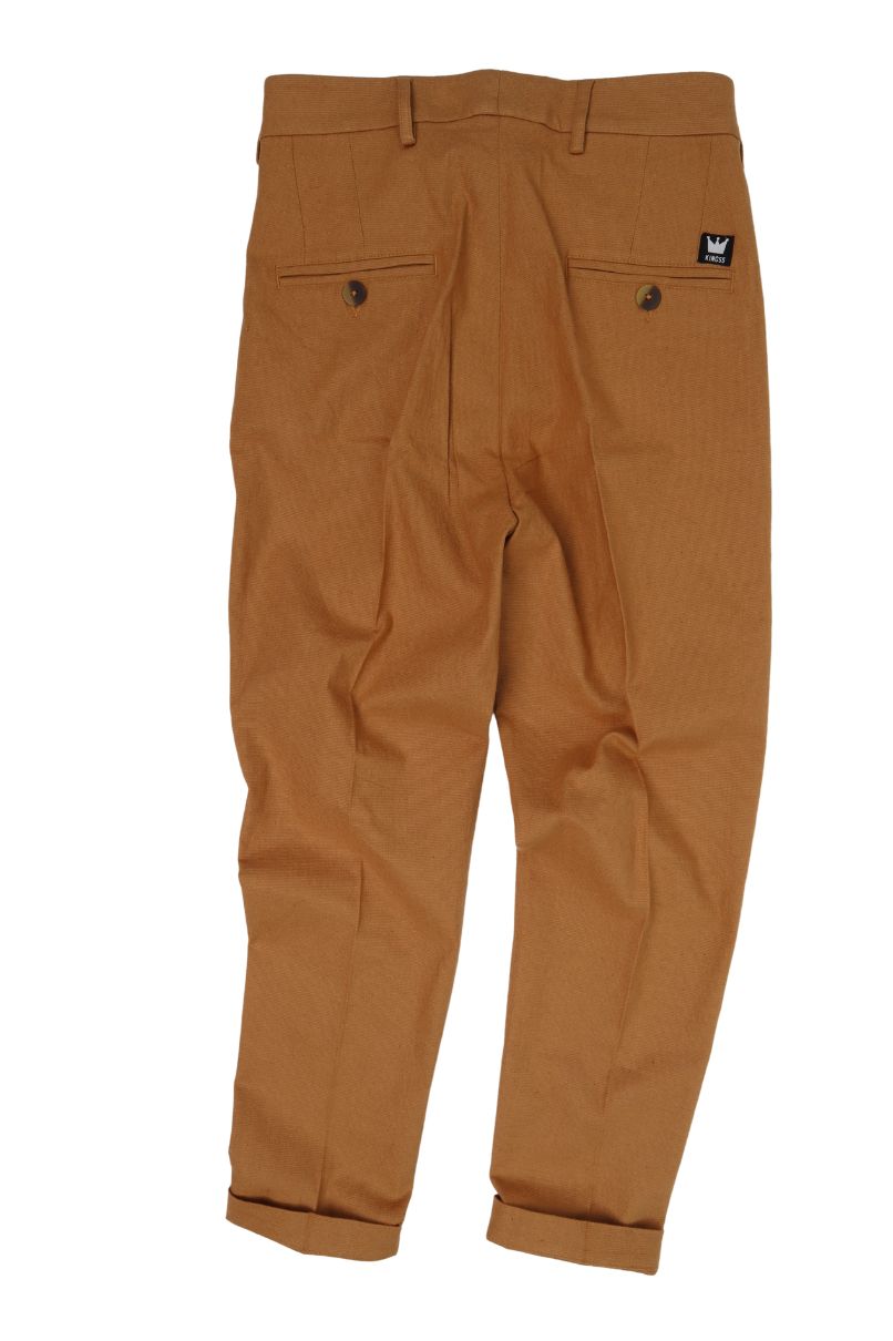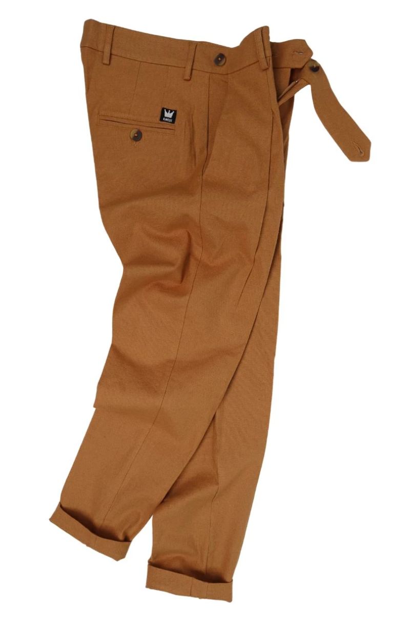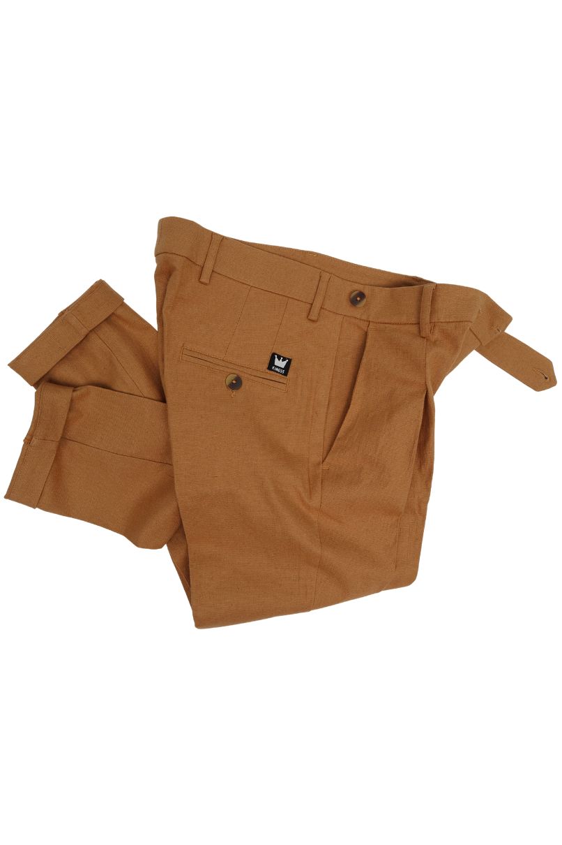 Calça Mostarda Linho Prega, dispõe de cós transpassado, abotoamento duplo e braguilha com zíper, conta com passantes possibilitando o uso de cinto. Bolsos frontais faca e bolsos traseiros embutidos com fechamento em botão.