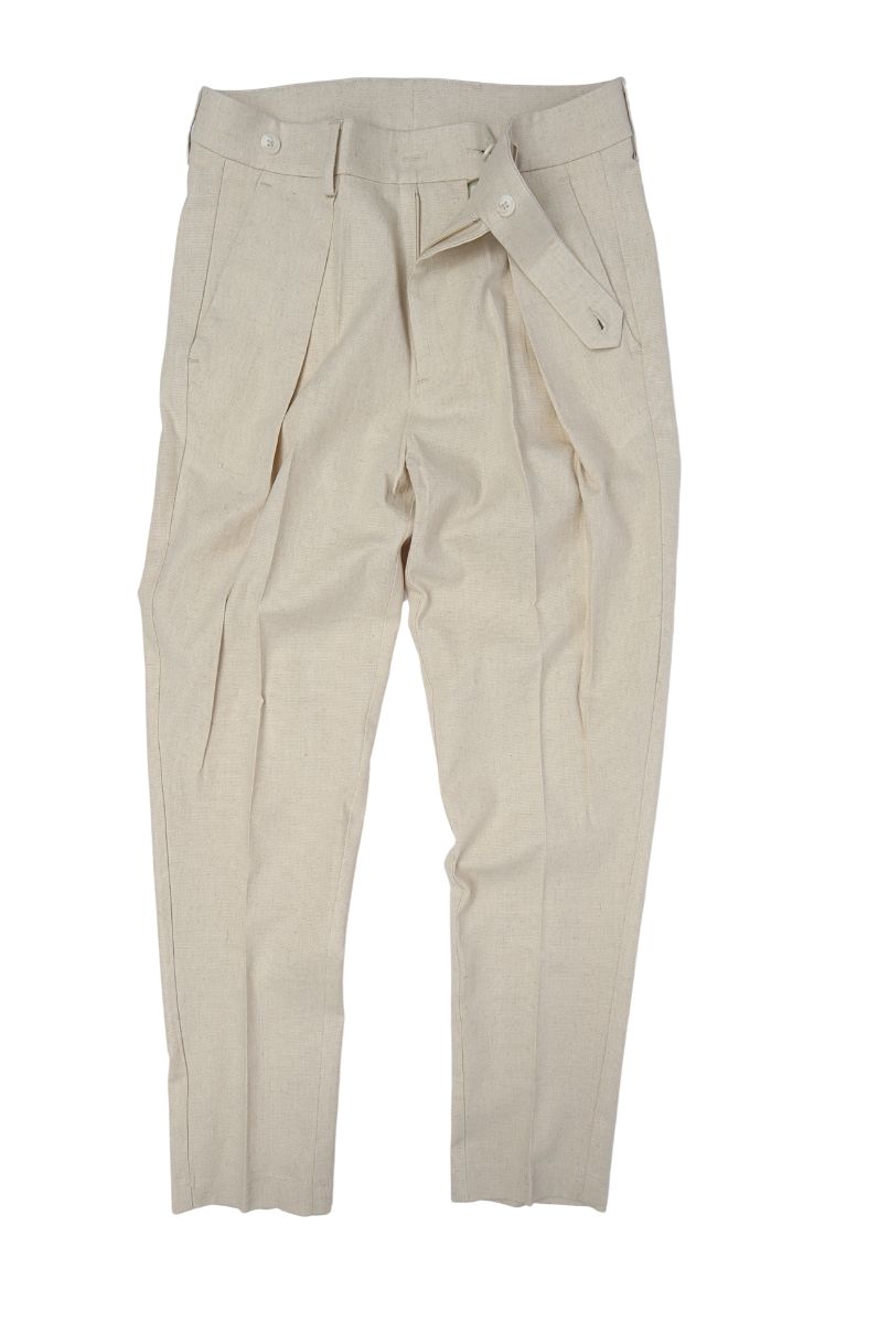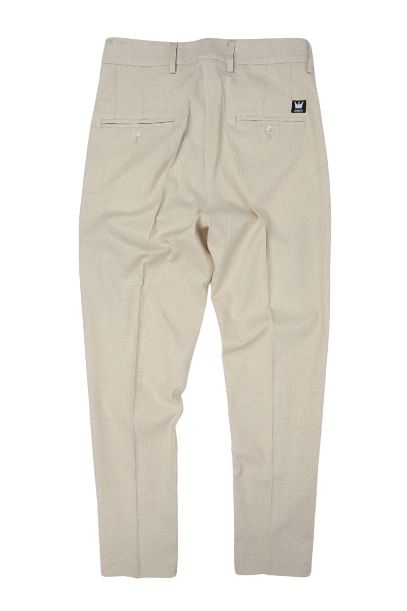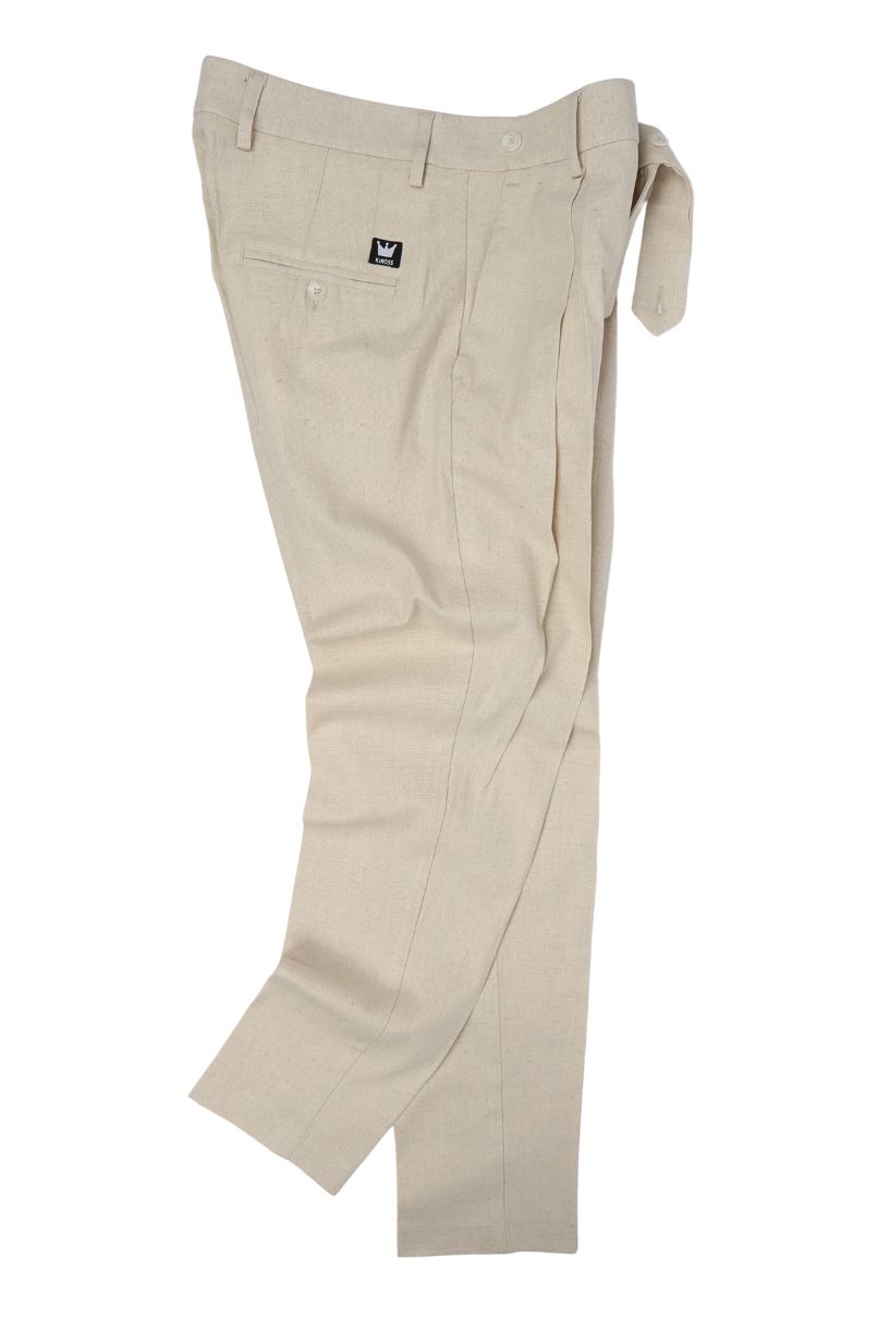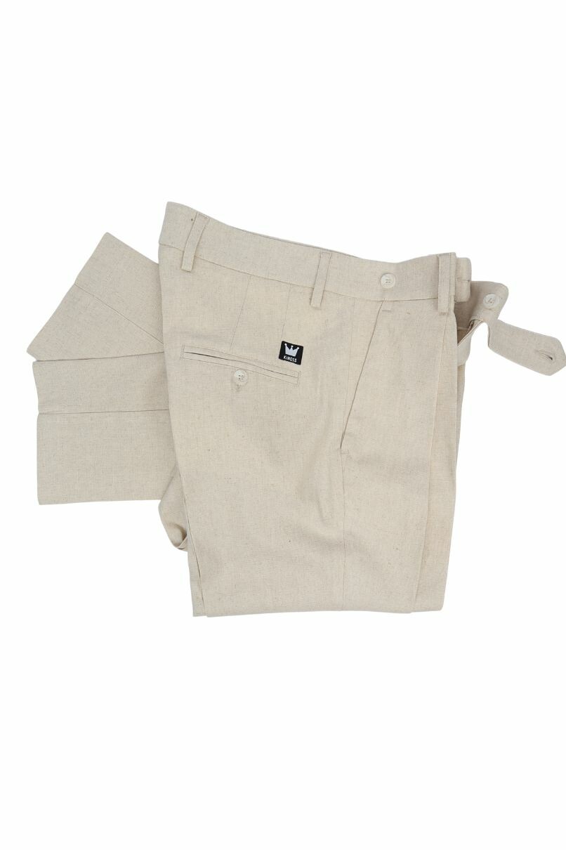 Calça Cru Linho Prega, dispõe de cós transpassado, abotoamento duplo e braguilha com zíper, conta com passantes possibilitando o uso de cinto. Bolsos frontais faca e bolsos traseiros embutidos com fechamento em botão.
