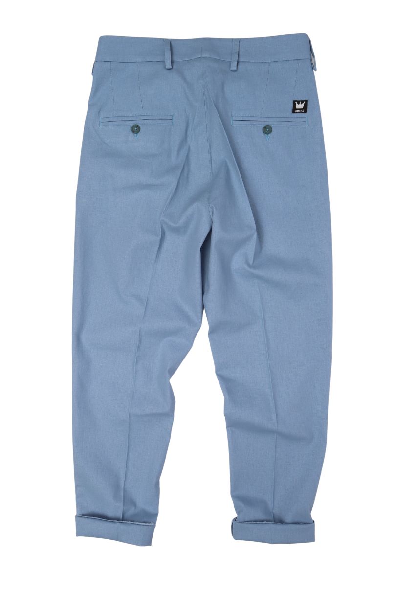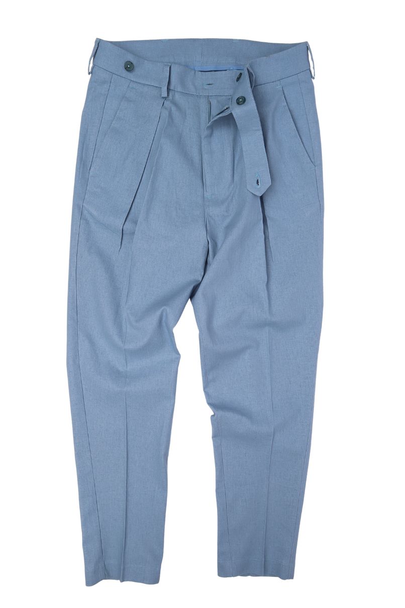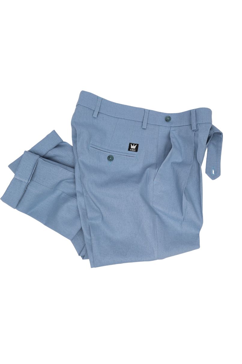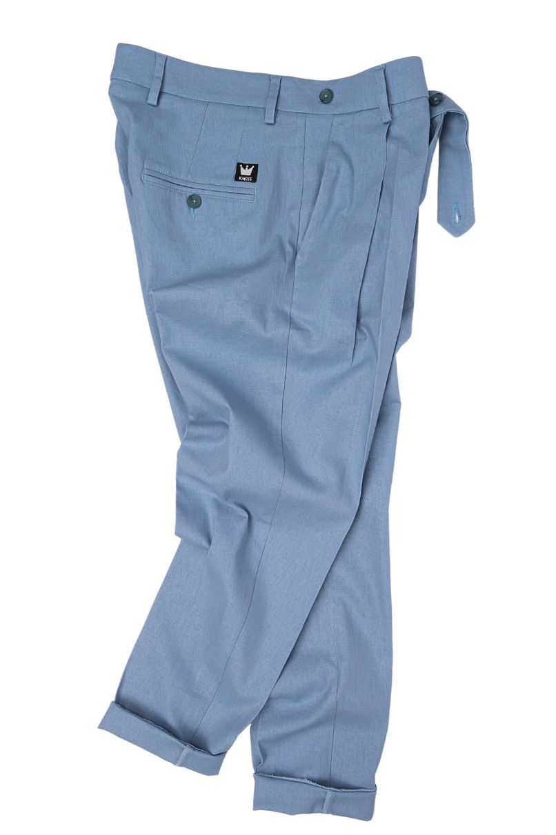 Calça Azul Linho Prega, dispõe de cós transpassado, abotoamento duplo e braguilha com zíper, conta com passantes possibilitando o uso de cinto. Bolsos frontais faca e bolsos traseiros embutidos com fechamento em botão.