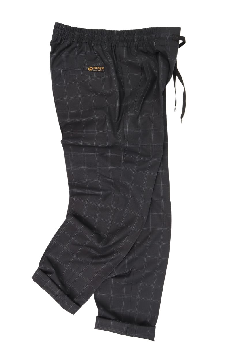 Calça Jogger Xadres Alfaiataria Chumbo, dispõe de cós com elástico e ajuste interno em cadarço, abotoamento 'gancho' e braguilha com zíper. Bolsos frontais faca e um bolso embutido traseiro.