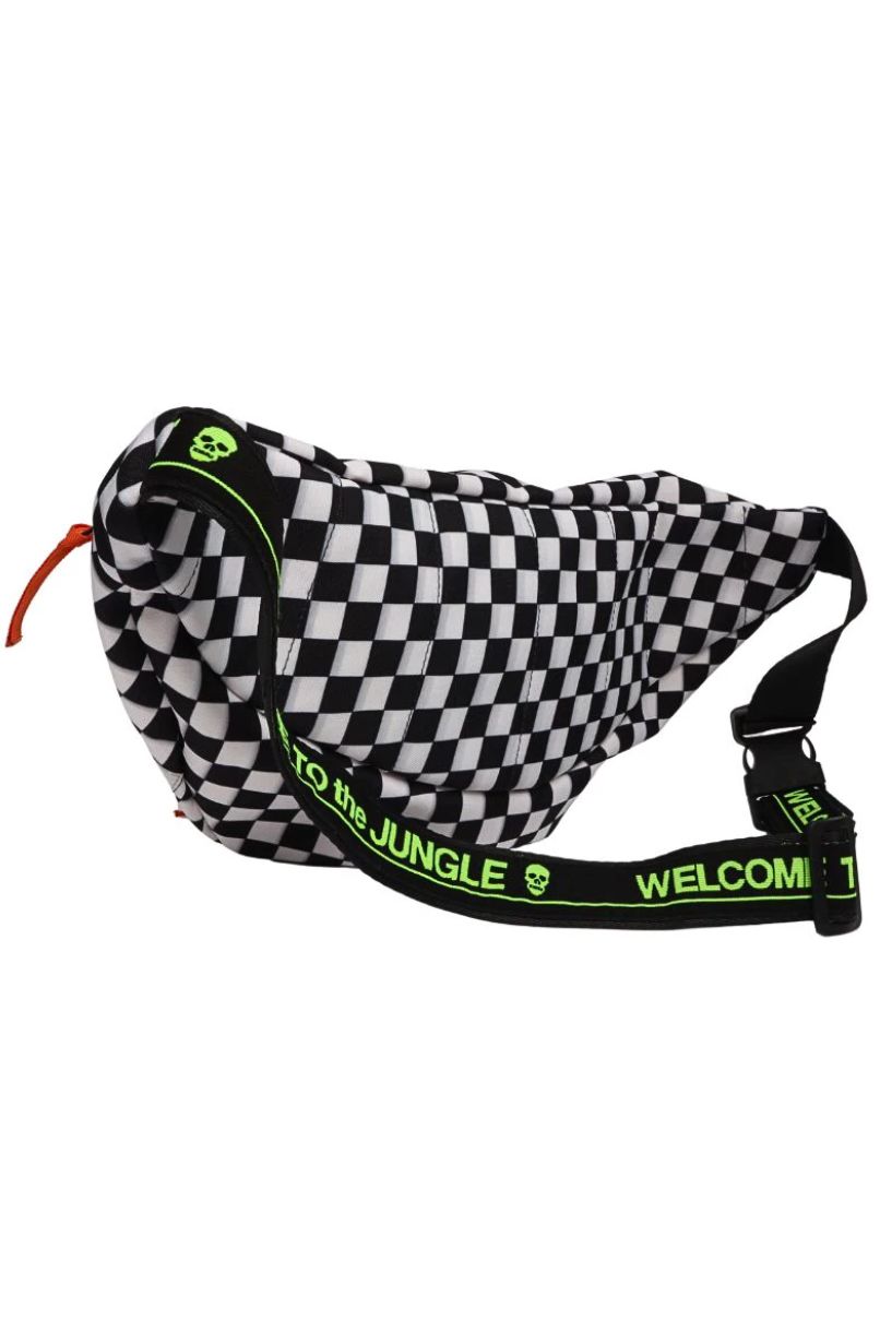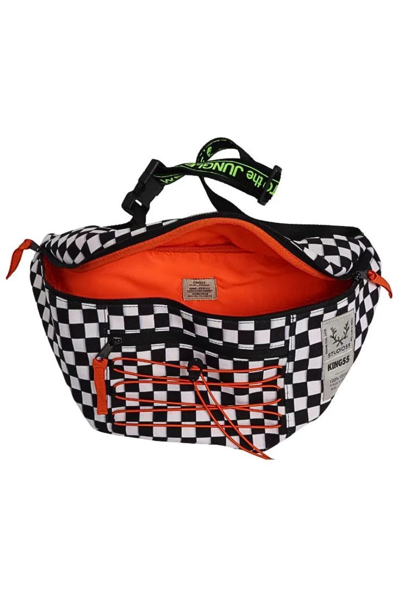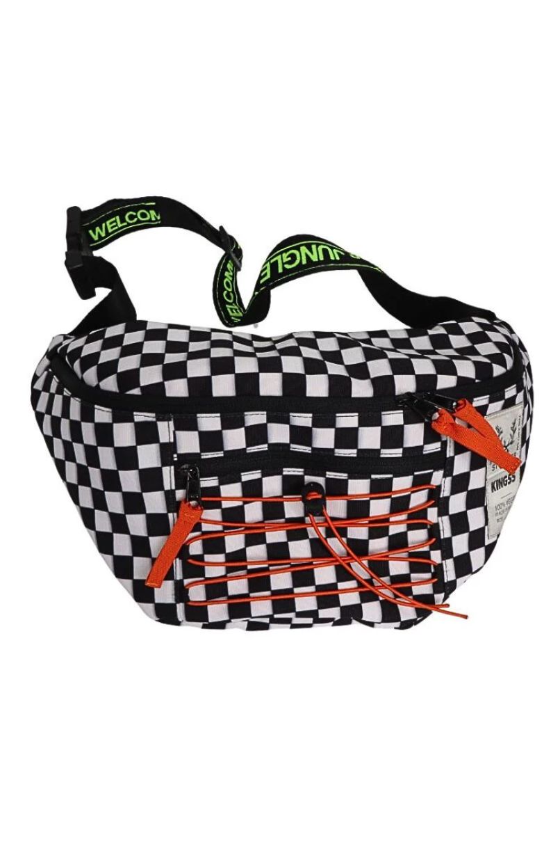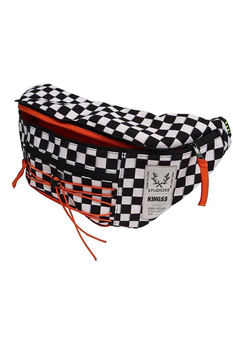 Pochete Quadriculada confeccionada em Nylon na parte externa e interna, Alça "Welcome to the Jungle" contendo regulagem permitindo que você utilize com maior mobilidade no corpo, bolso interno e externo na parte frontal, detalhe e ajuste em elástico na parte da frente com Pingente de Caveira Exclusivo King55.