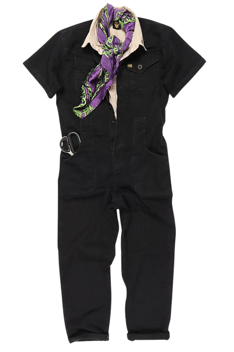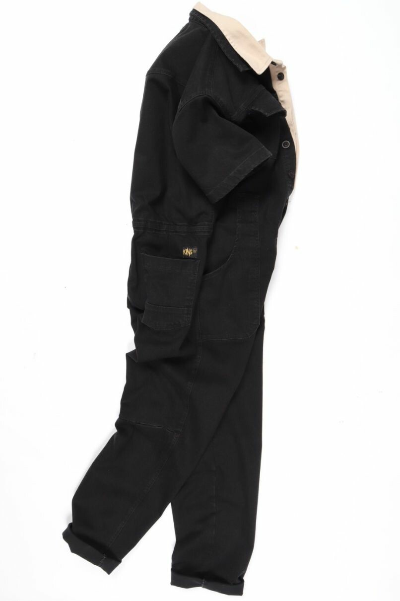 Macacão Estilo Operário Unissex, em Sarja Preto, com fechamento frontal em Botão, possui bolsos frontais e traseiros.