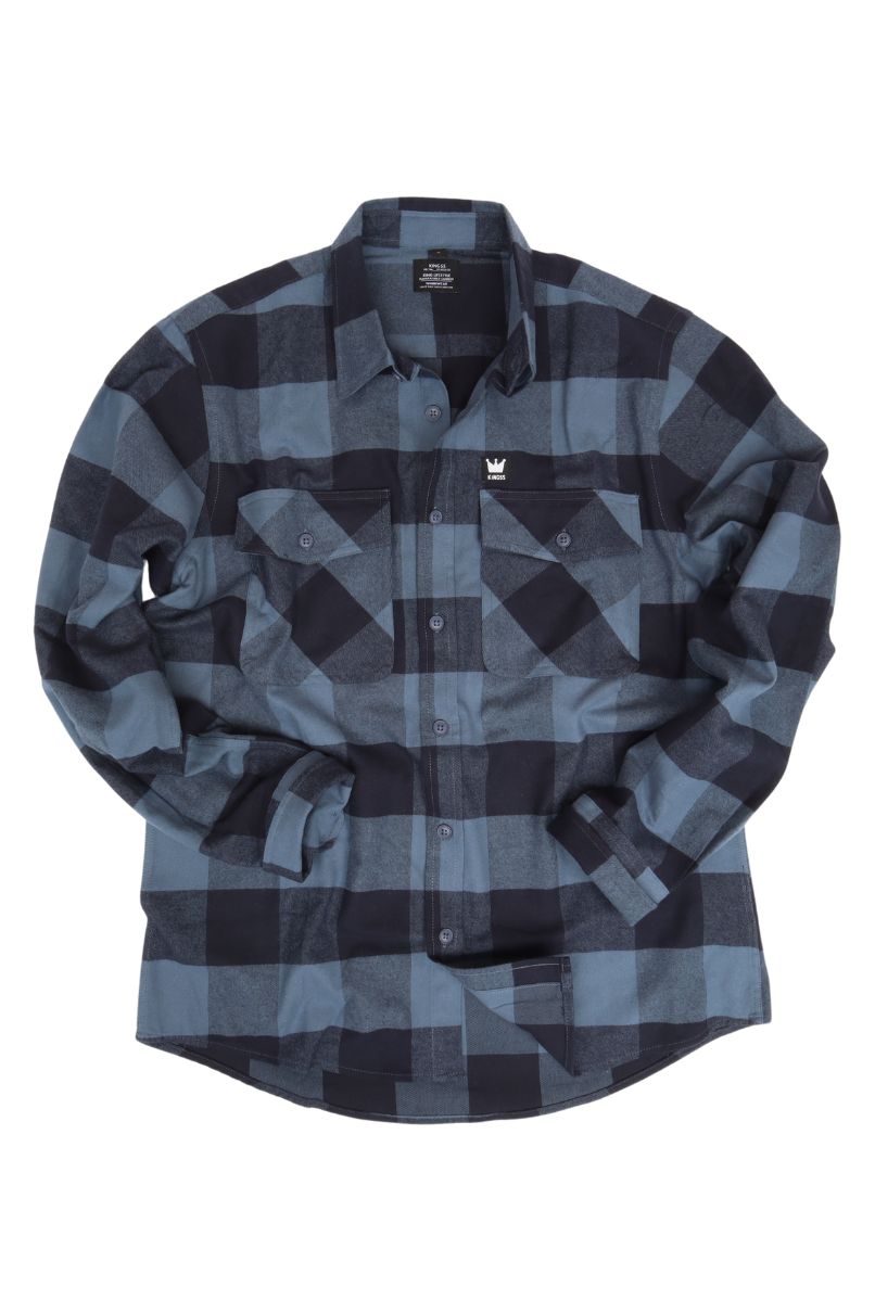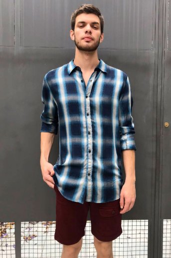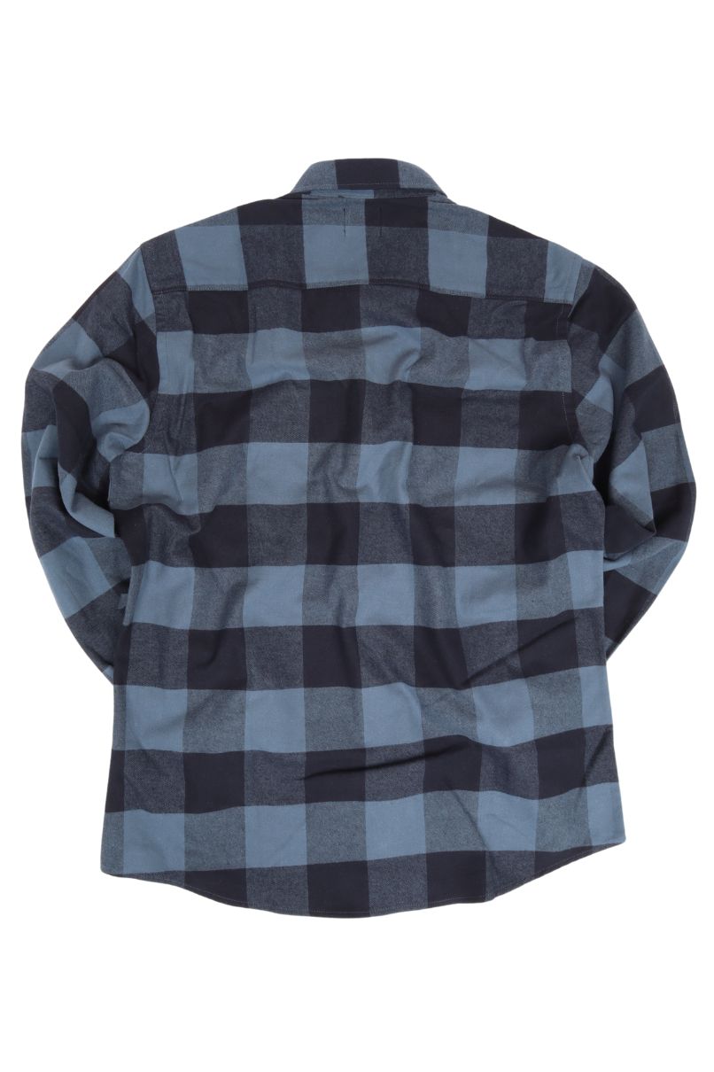 Camisa de Flanela Xadrez Azul, Modelagem reta, fechamento frontal com botões, colarinho curto, bolsos com lapela e fechamento por botão de massa