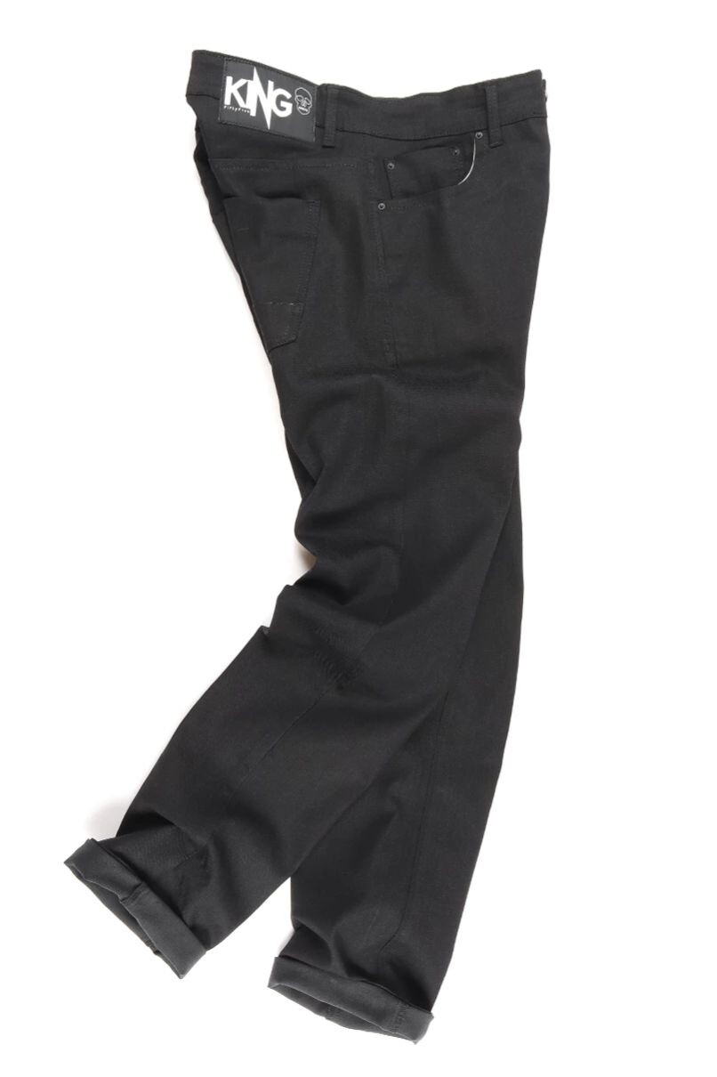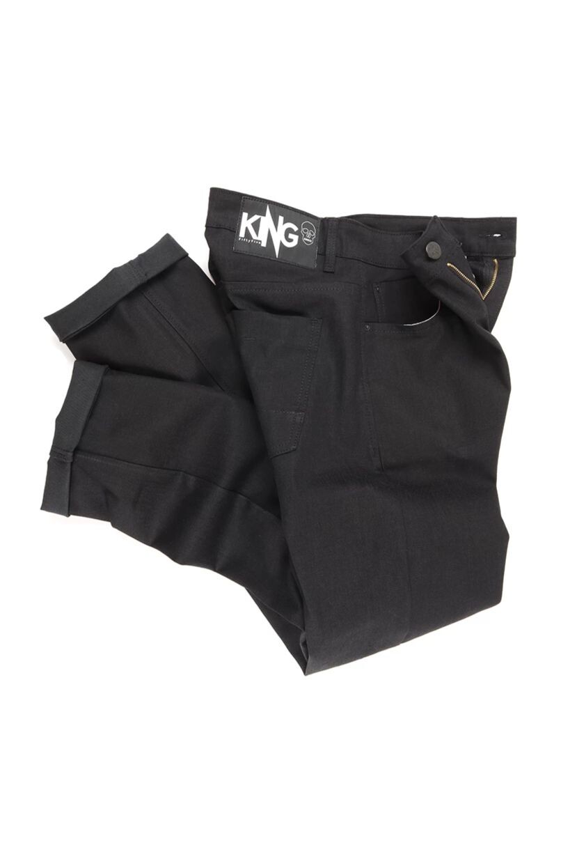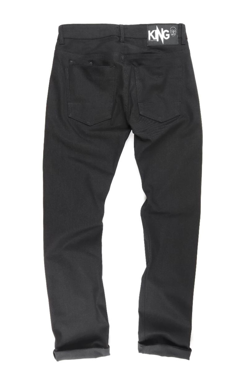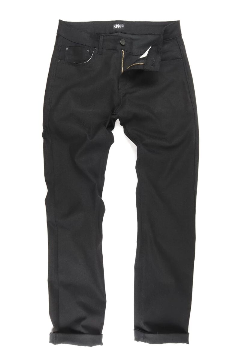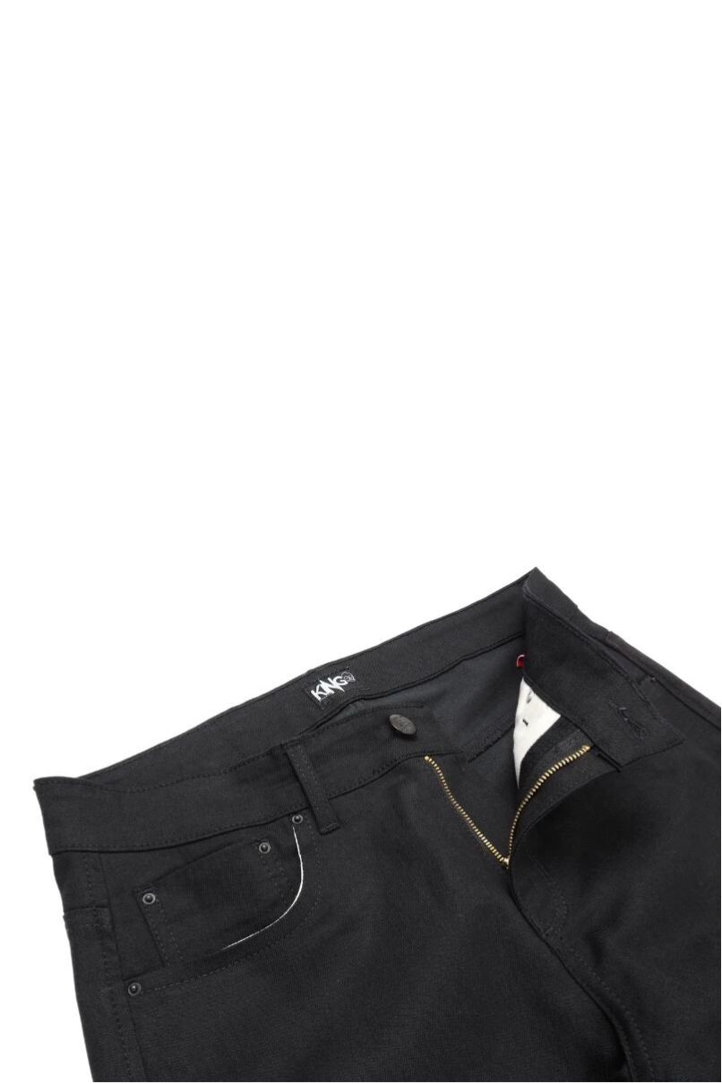 Calça Preta com costura em tom mais escuro, fechamento da braguilha em botão e zíper, corte tradicional five pockets, mas conta com bolso moedeiro adicional atrás também, sendo 3 bolsos frontais e três bolsos traseiros.