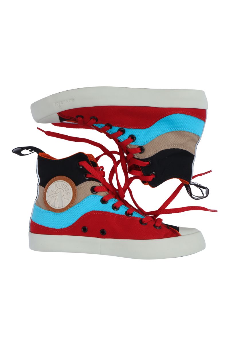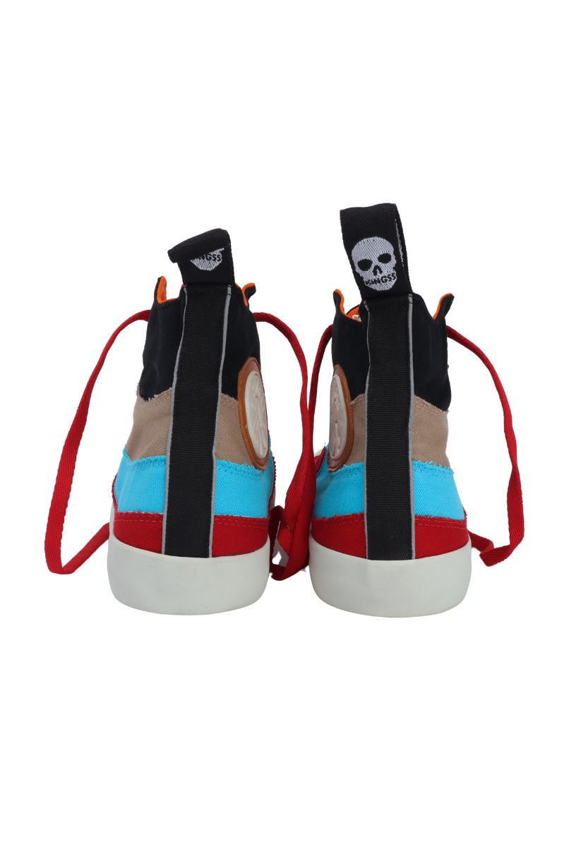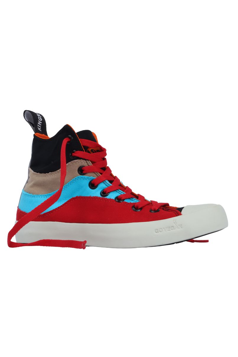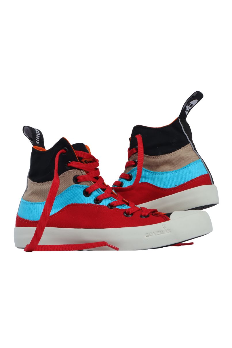 Tênis Vegano Quadricolor Edição Especial nas cores Preto, Bege, Turquesa e Vermelho, cano alto. Confeccionado em tecido de algodão - 100% livre de Crueldade Animal.