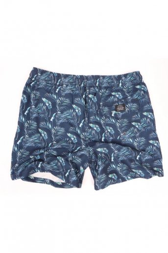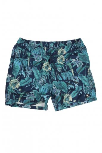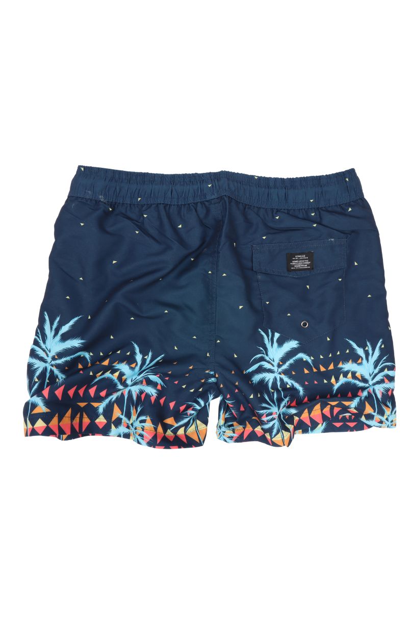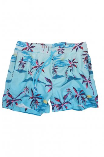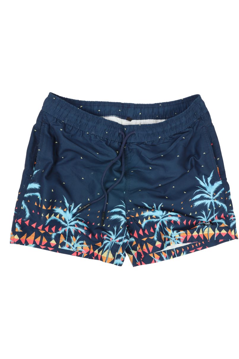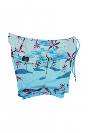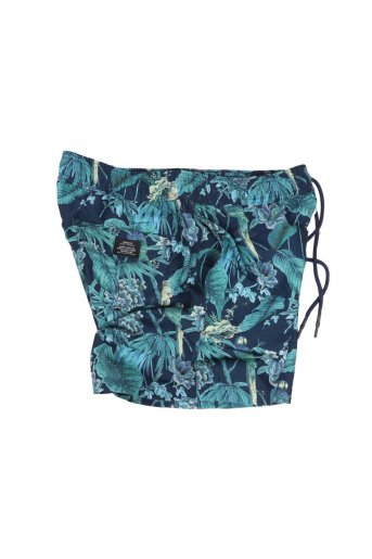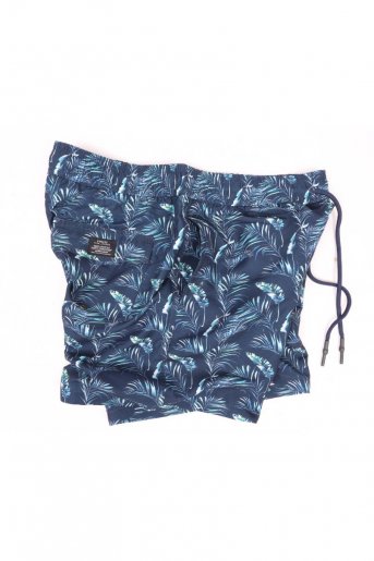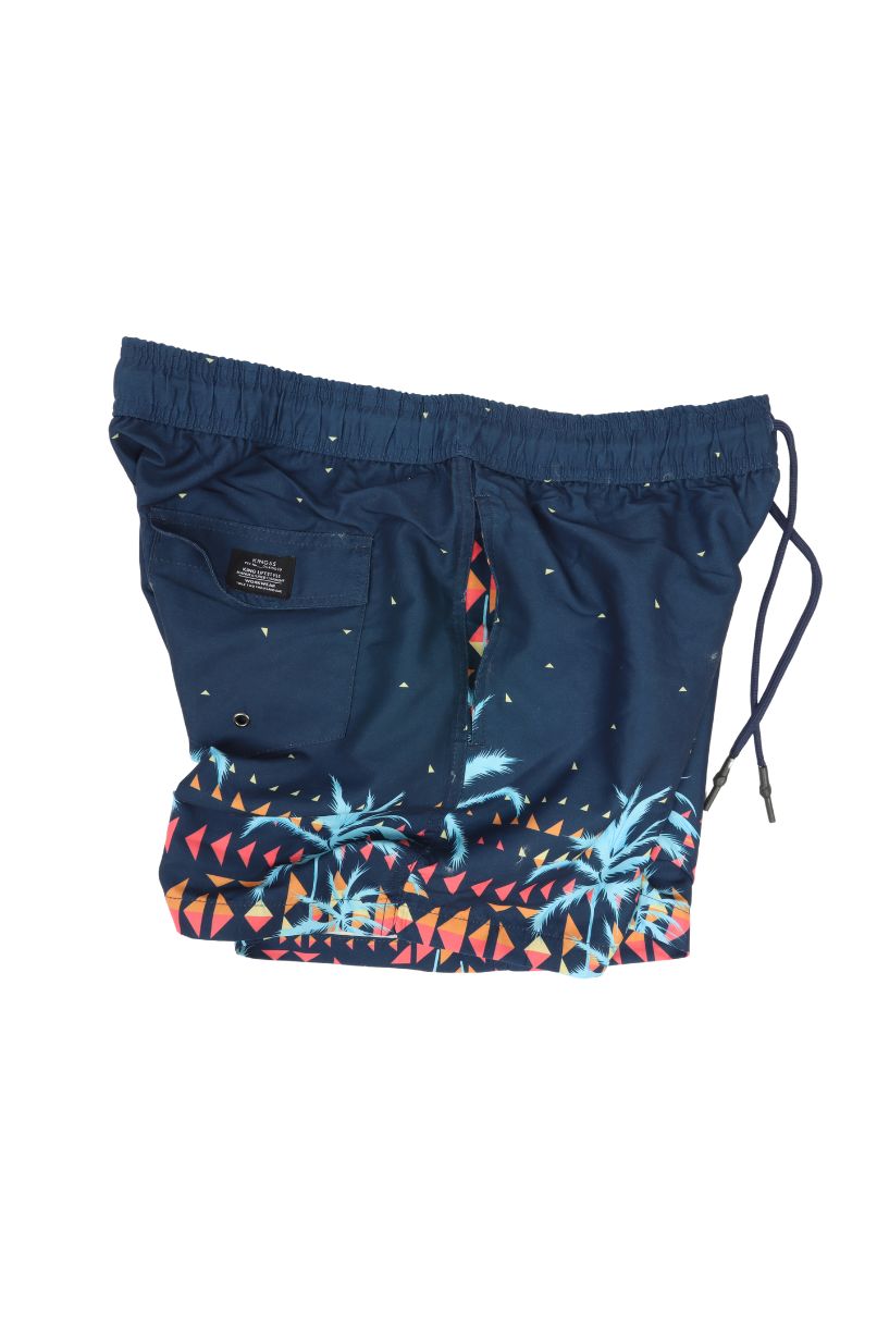 Bermuda Shorts Vôlei na cor Marinho estampada com Palmeiras em tons de Azul - 100% Livre de Crueldade Animal.