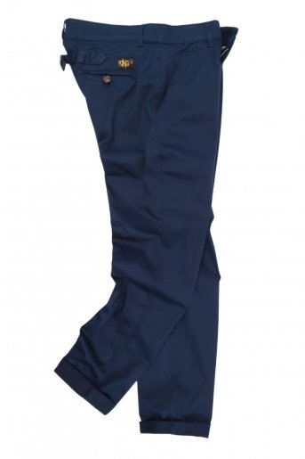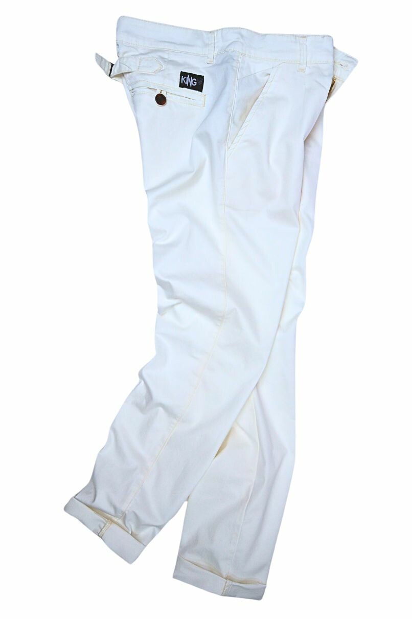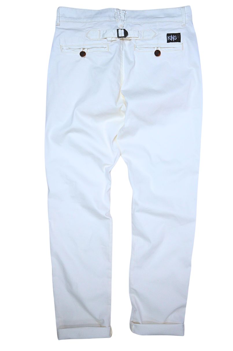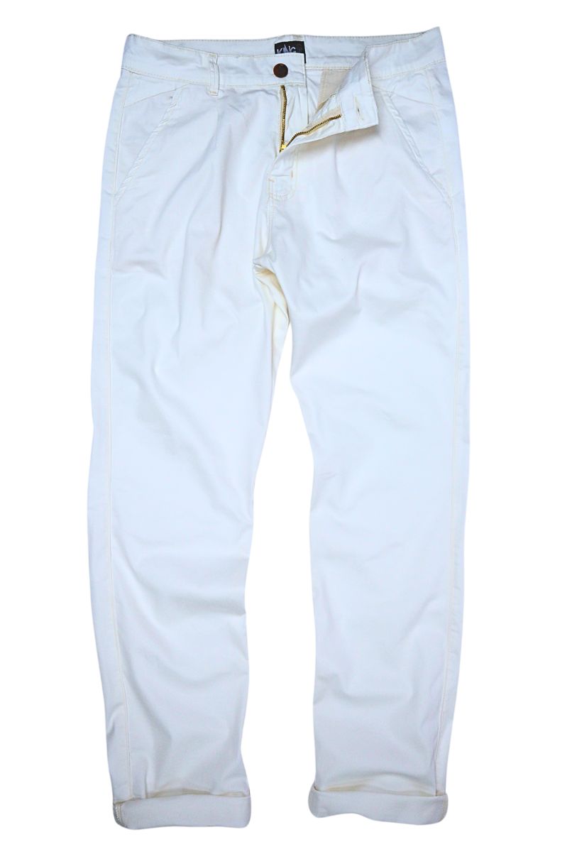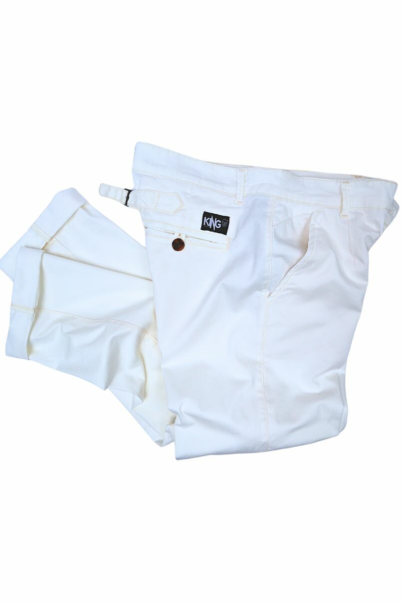 Calça em Sarja Off White, corte reto, bolsos facas, fechamento com ziper e ajustador de tamanho traseiro.