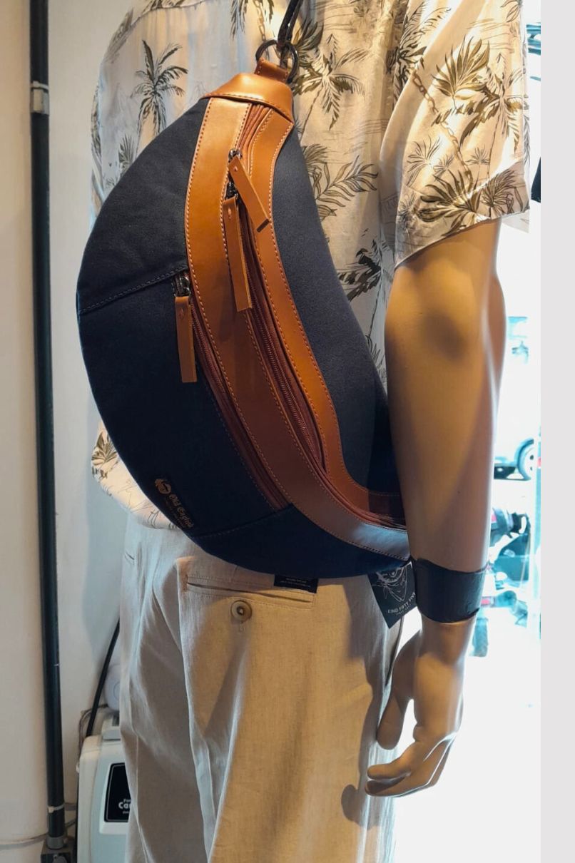 Pochete Vegana, na cor Marinho e Castor, produzida em canvas 100% Algodão e Animal Cruelty free, com o corpo e alças confeccionada em material sintetico, contendo regulagem em toda a extensão da alça permitindo que você utilize com maior mobilidade no corpo.