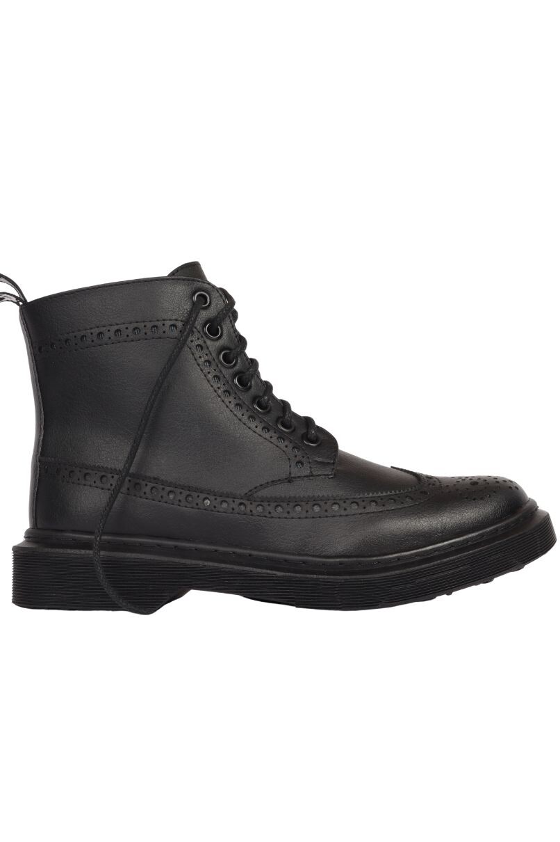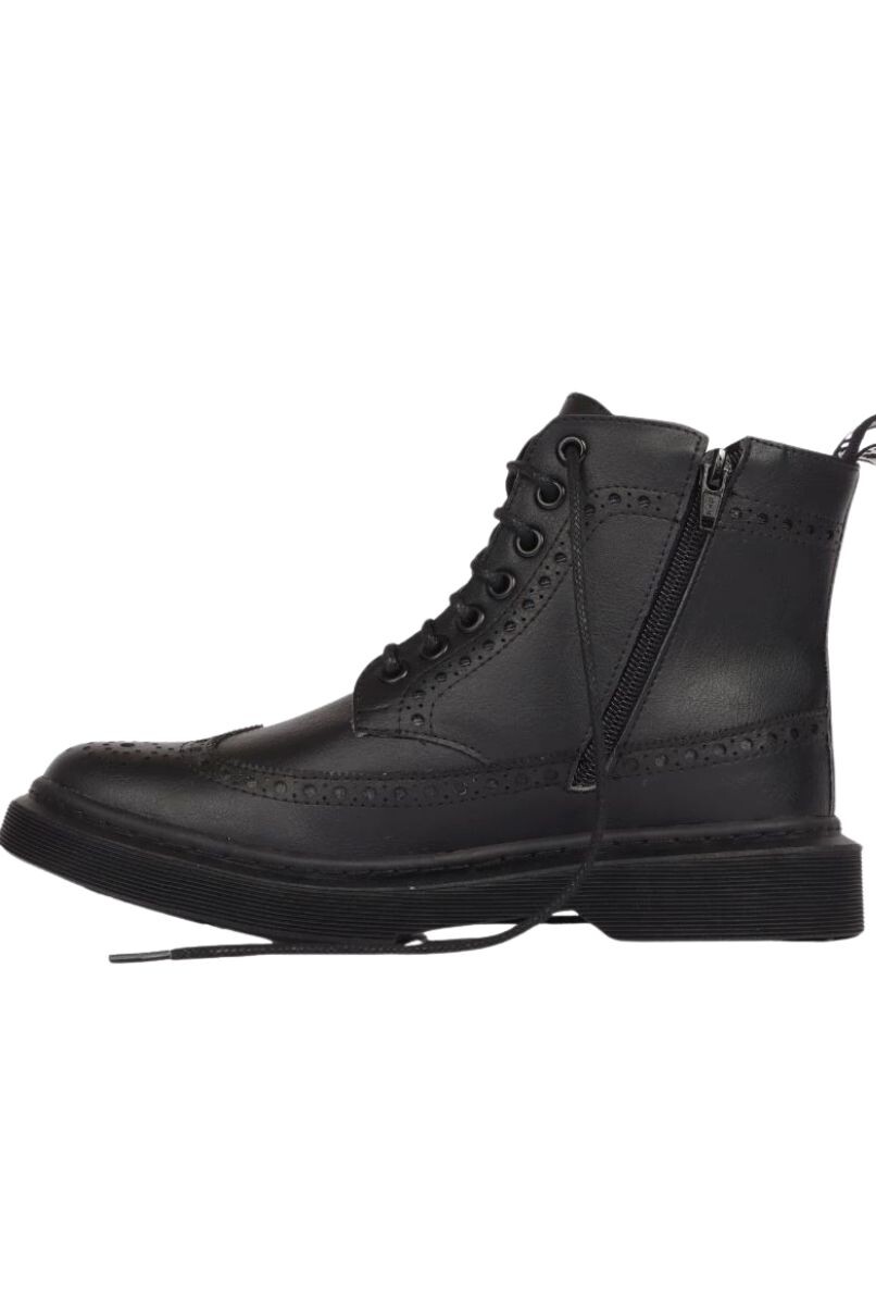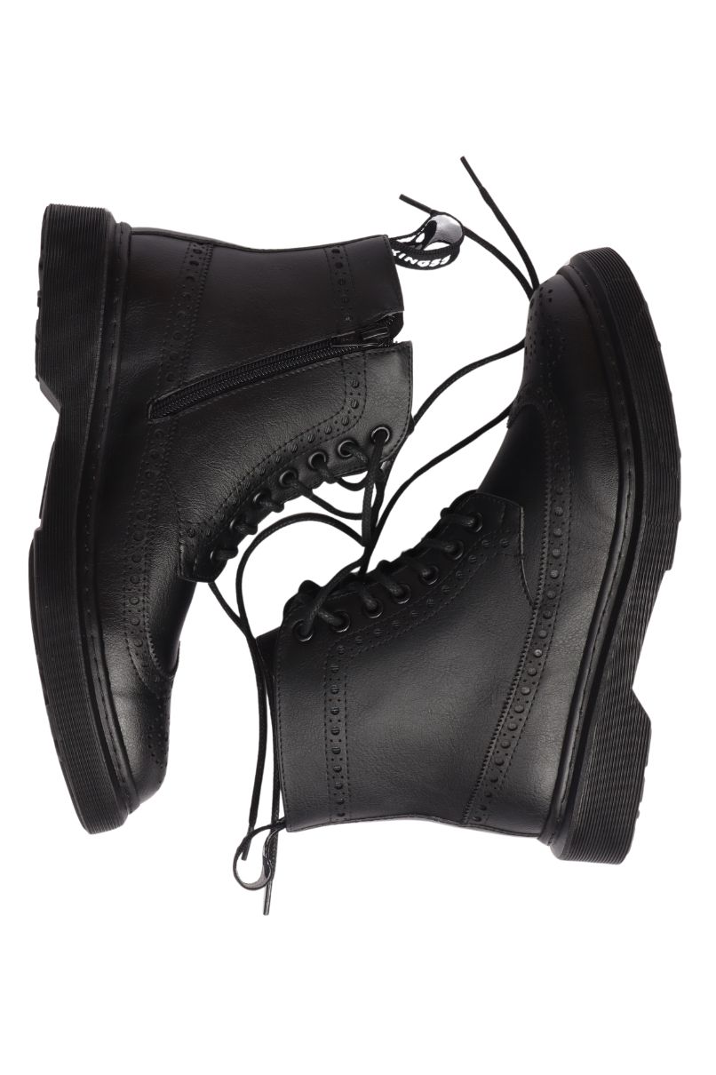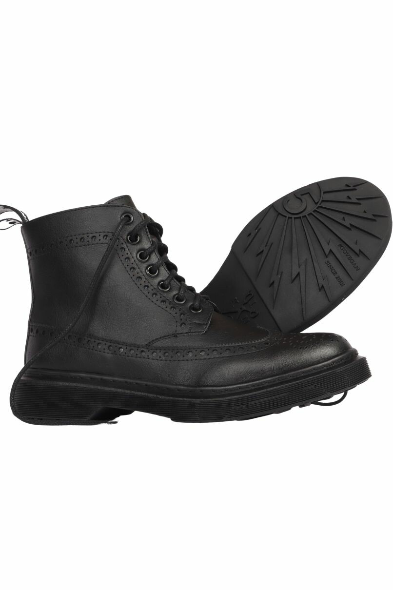Bota Brogue Preta, confeccionado em material sintético, 100% livre de crueldade animal, o cabedal (parte superior da bota) é costurado a sola de borracha levemente tratorada. Possui um salto de 2,5 cm e costura de reforço na parte traseira.