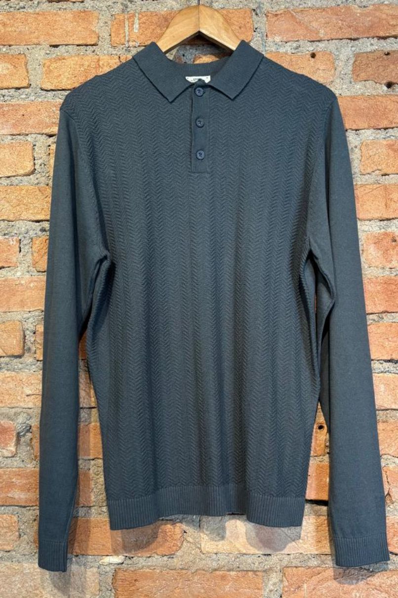 Sueter Polo Tricot Grafite, Manga Longa. Estrutura em tricô. Possui um trabalhado no ponto chevron na parte fontal e nas costas ponto liso, dispõe de 3 botões frontais.