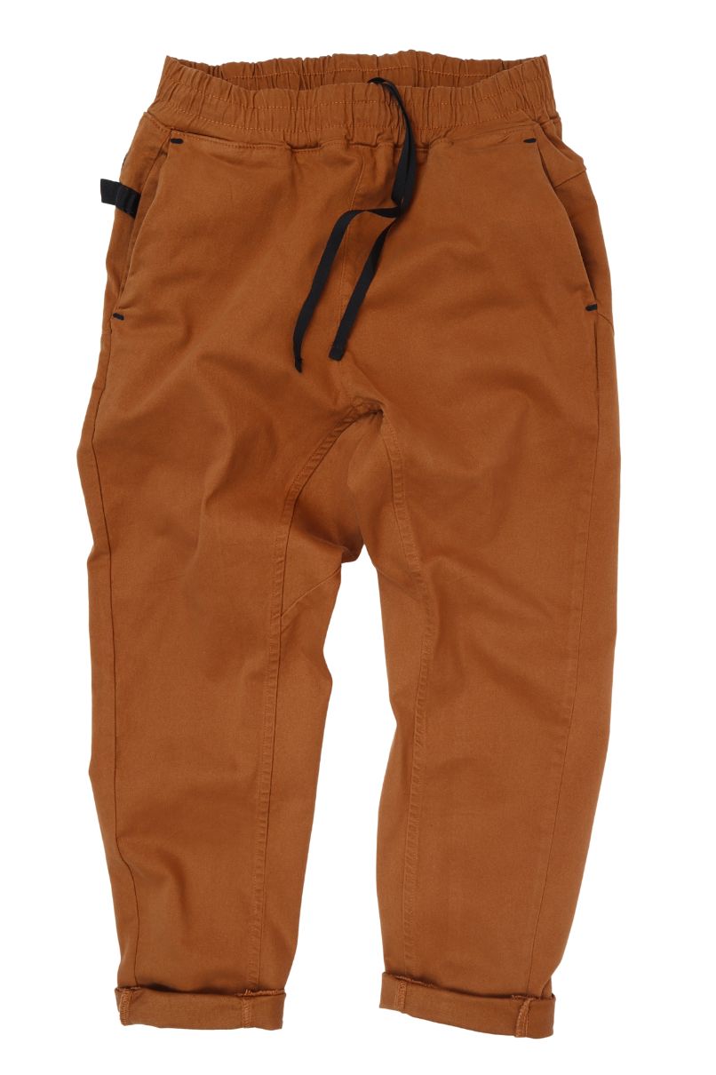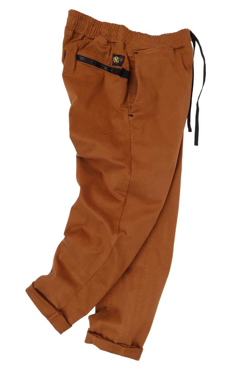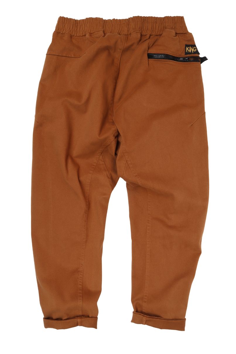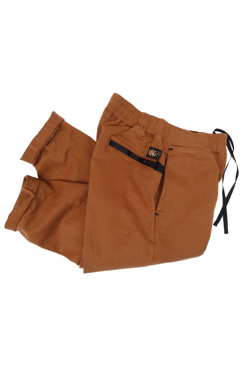 Calça de Sarja Conhaque com cós elástico ajustável, gancho longo, recorte no entrepernas e bolsos funcionais — lateral tipo faca e traseiro com zíper tratorado.
